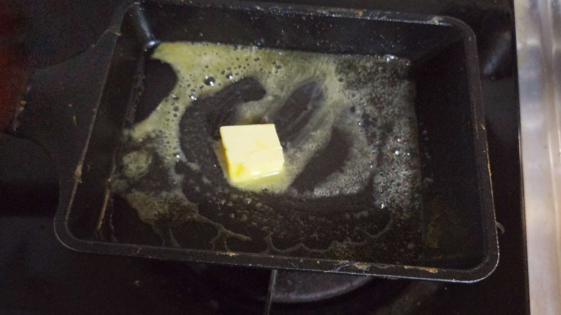 약불로 달군 사각팬에 식용유, 버터 1T를 올려 녹여줍니다.