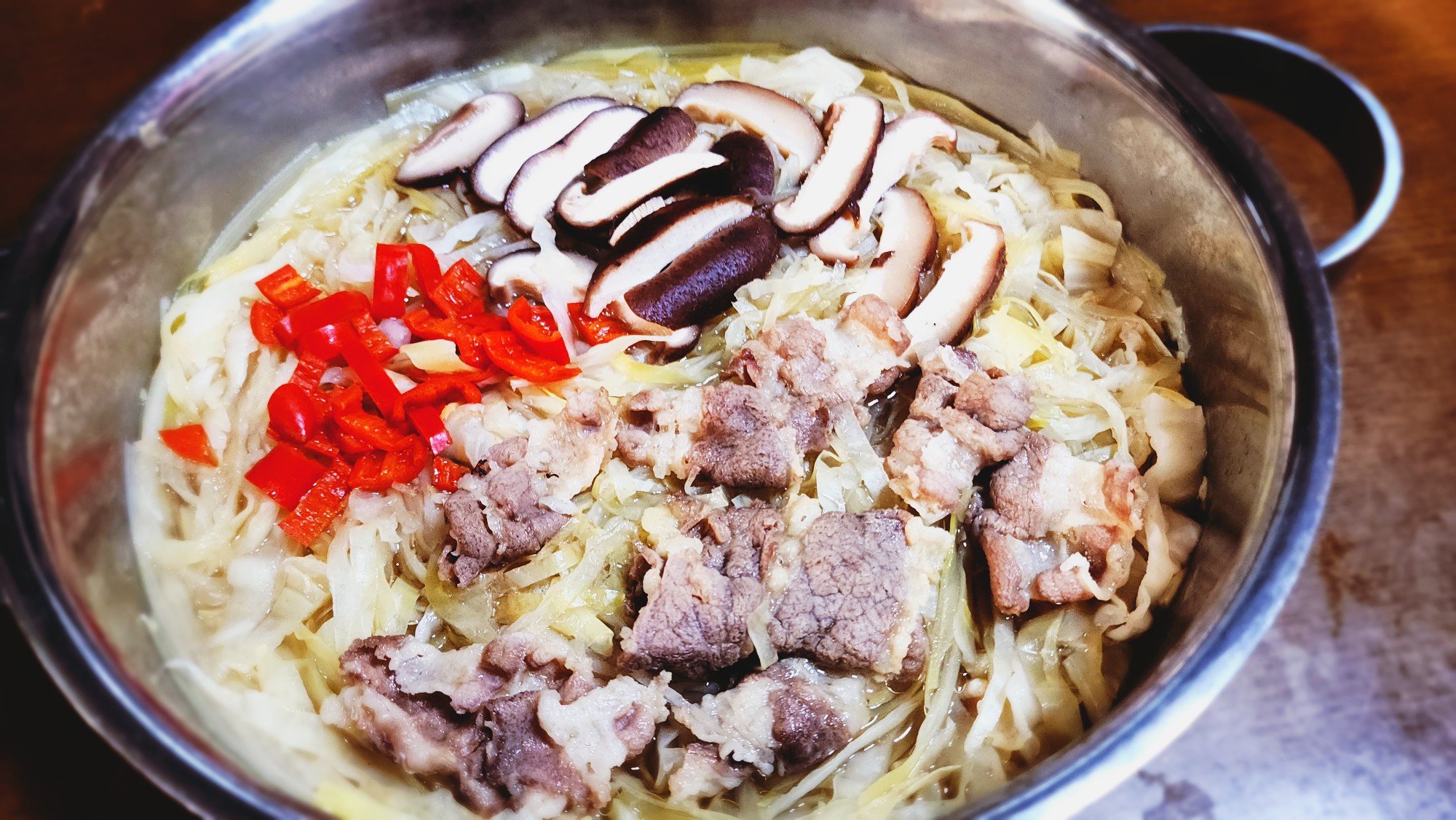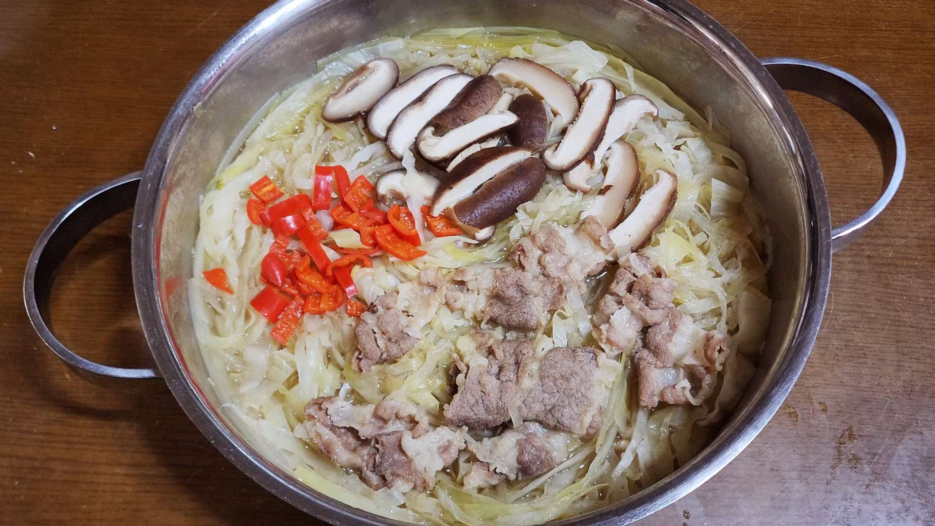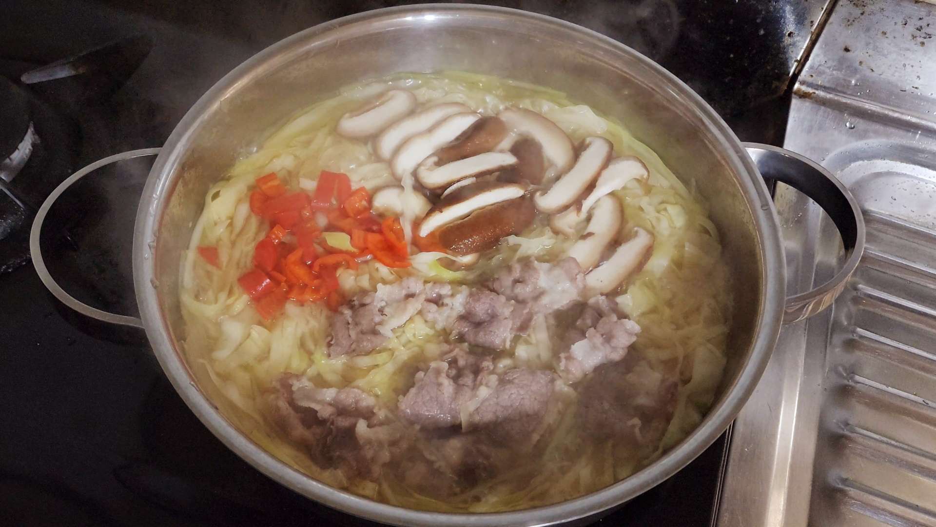 표고버섯, 홍고추, 샤브샤브용 고기를 넣고