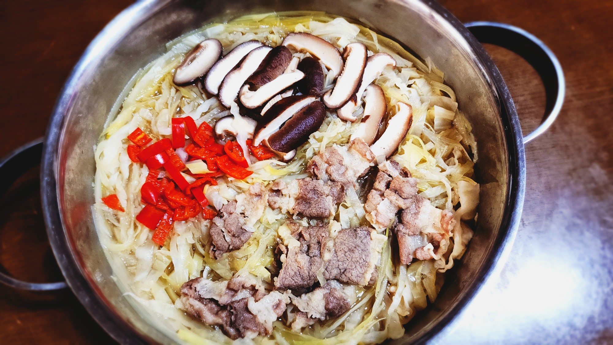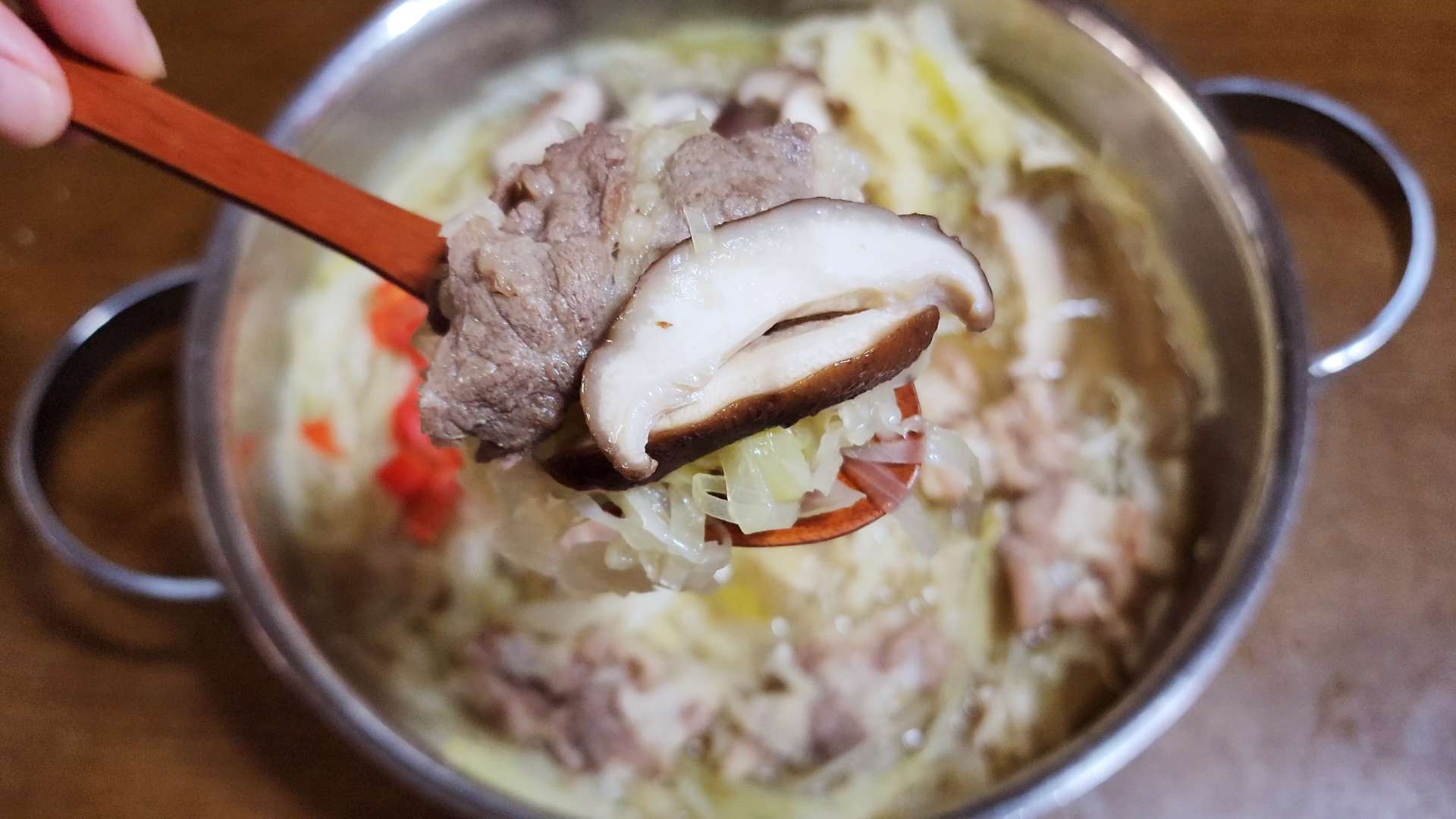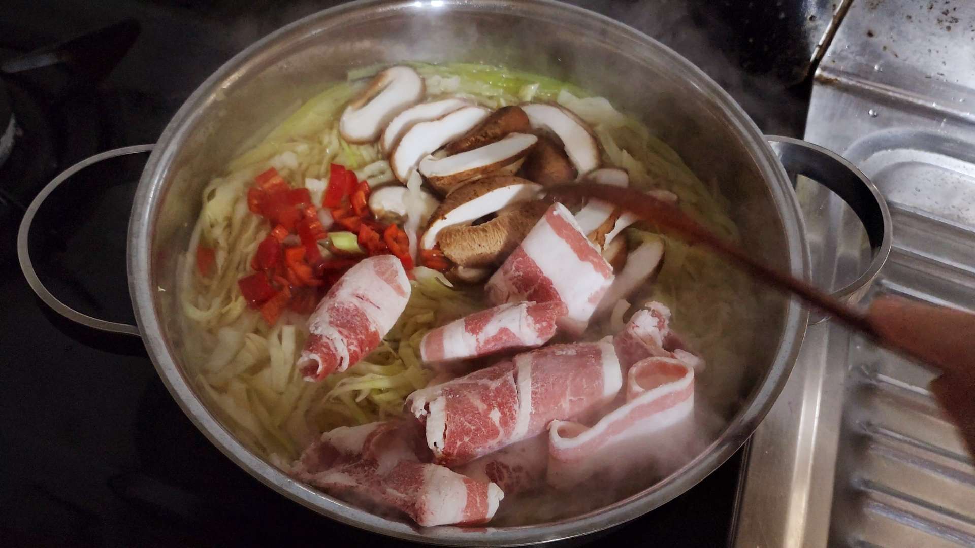 표고버섯, 홍고추, 샤브샤브용 고기를 넣고