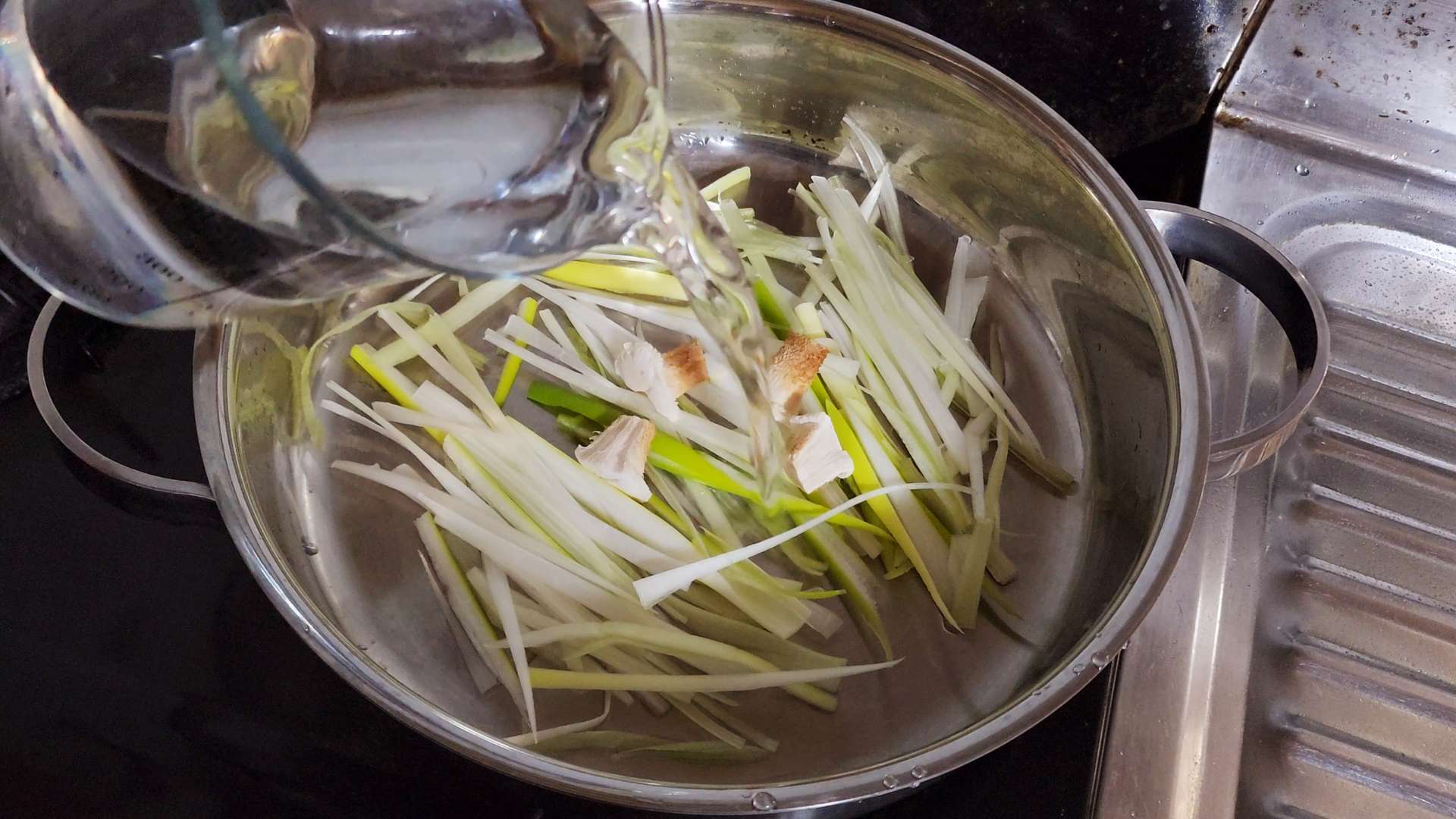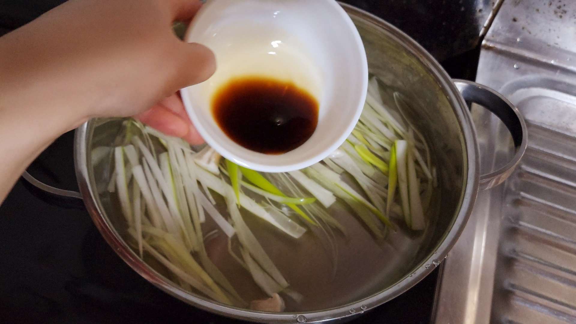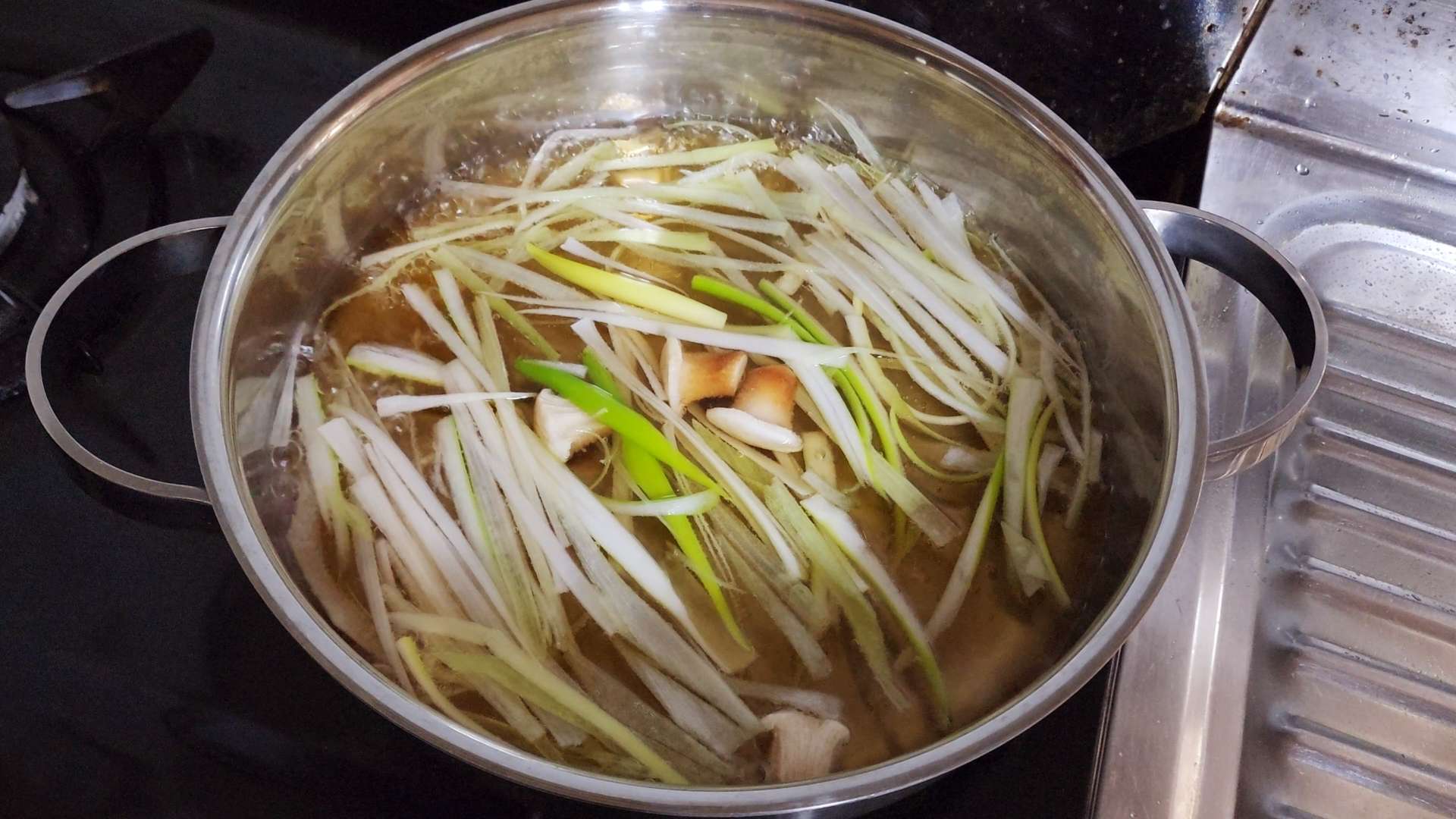 냄비에 채 썬 대파, 표고버섯 밑동, 물 500ml, 홍게맛간장 3T를 넣고 중불에서 끓여줍니다.