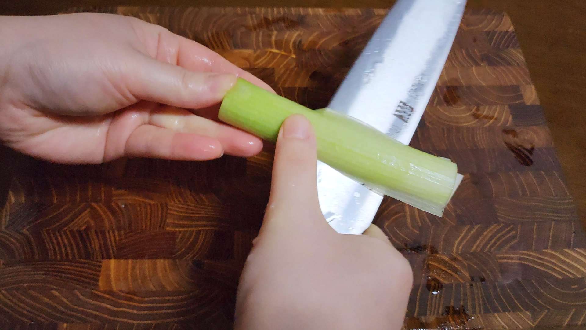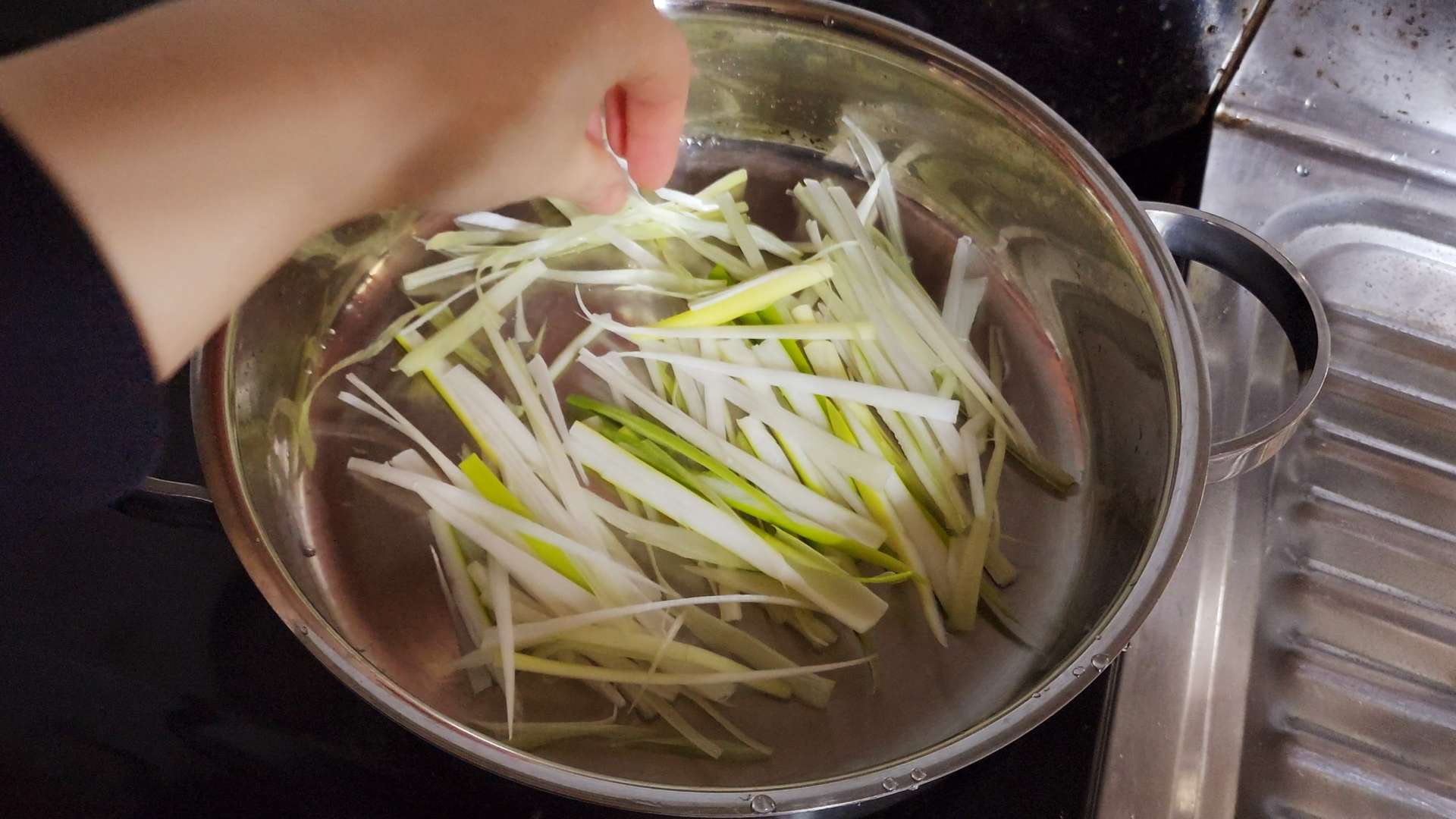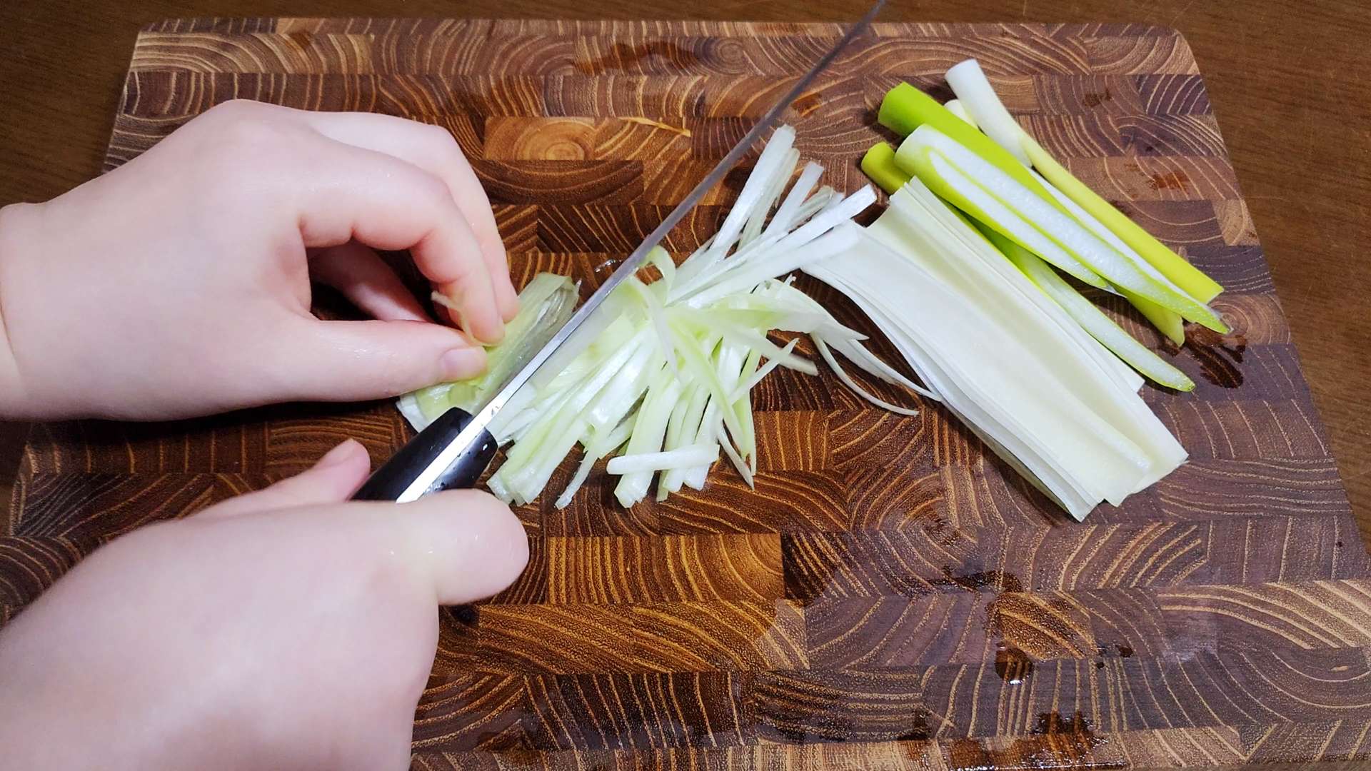 대파는 세로로 반으로 잘라 접어서 얇게 채썰어 줍니다.