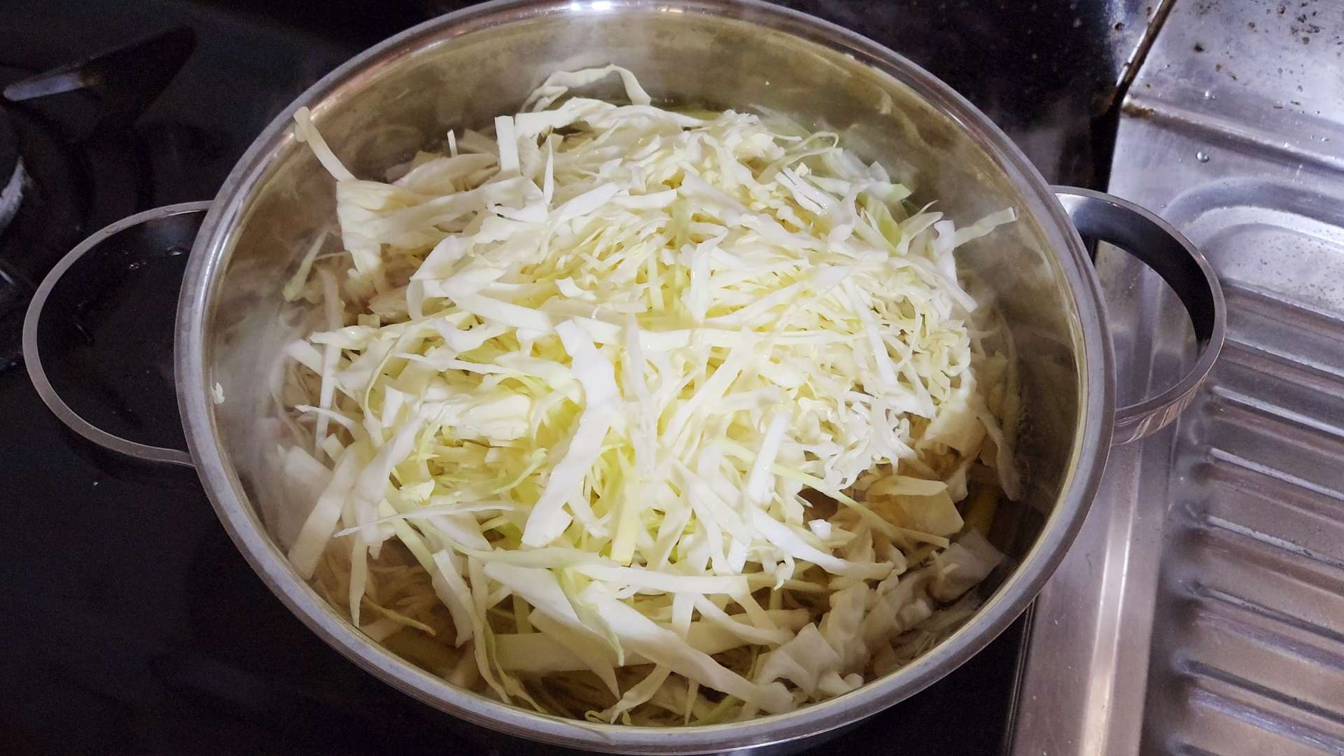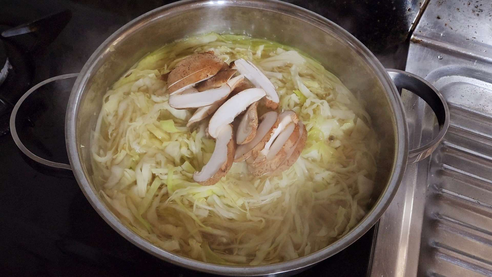 한번 끓어오르면 채 썬 양배추를 넣고 3분 정도 끓여줍니다.