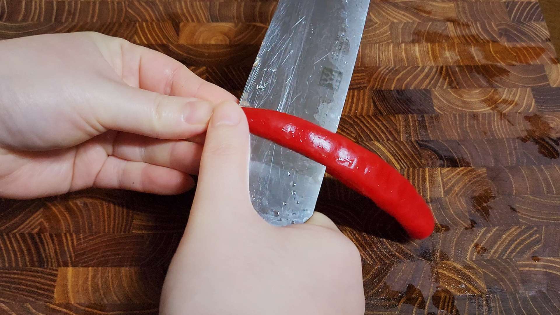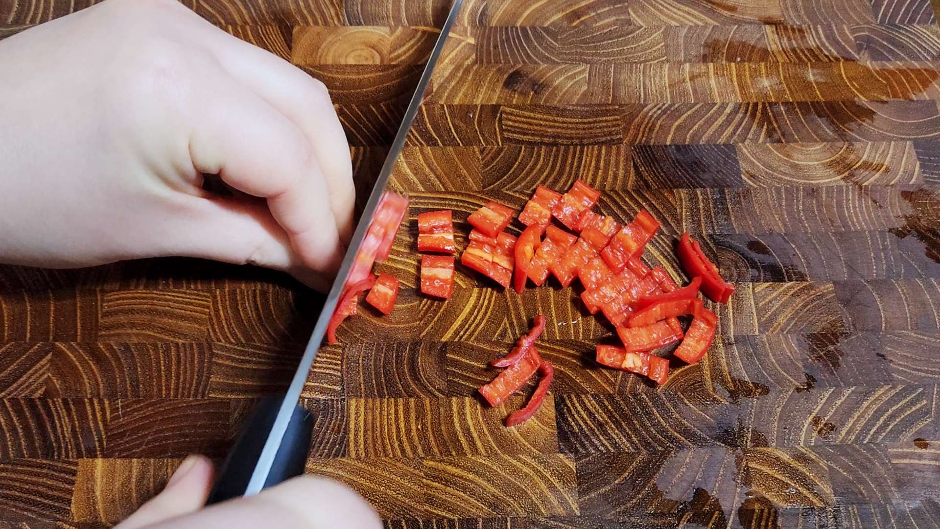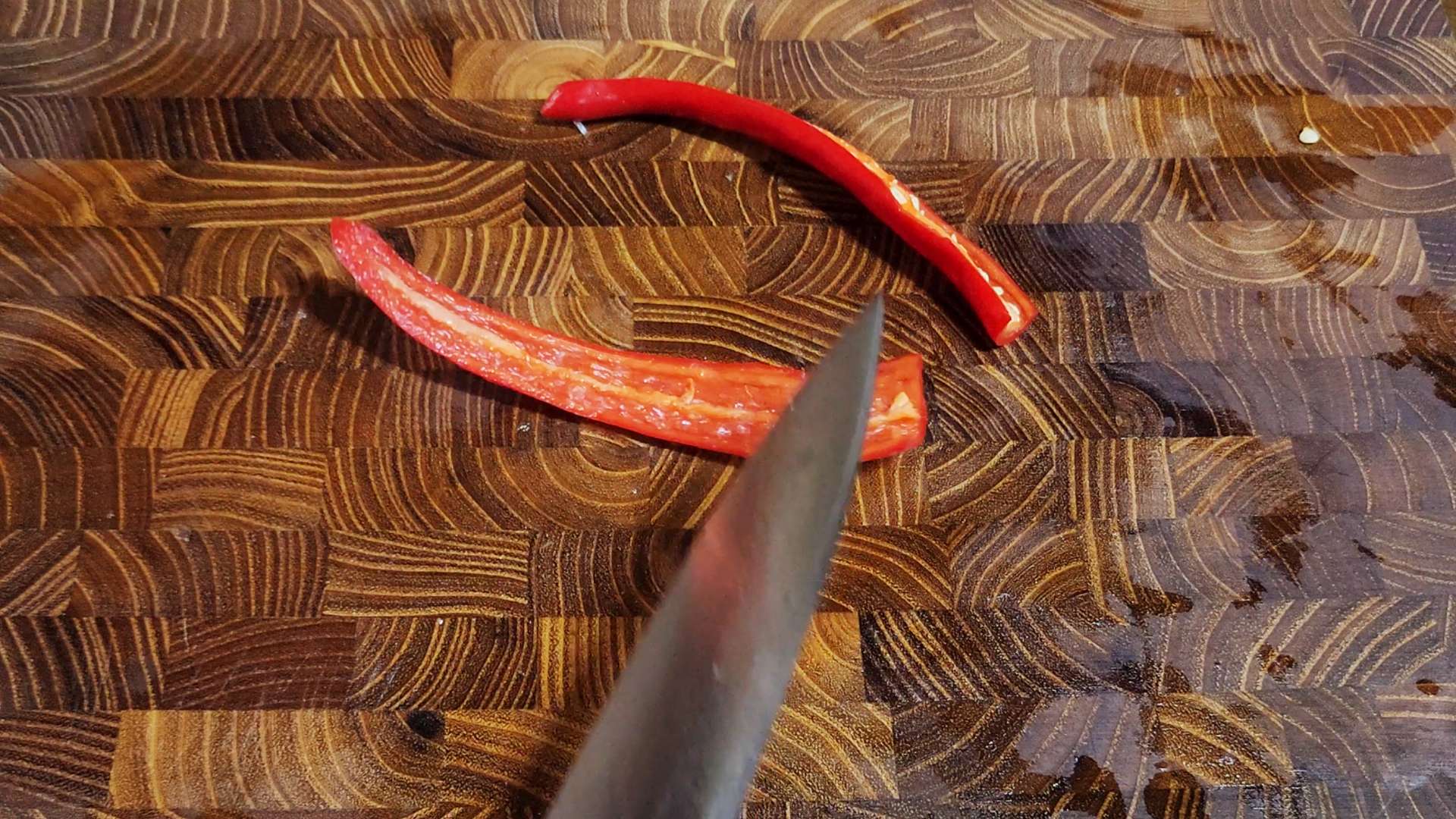 홍고추는 반으로 잘라 씨를 제거하고 송송 잘라줍니다.
