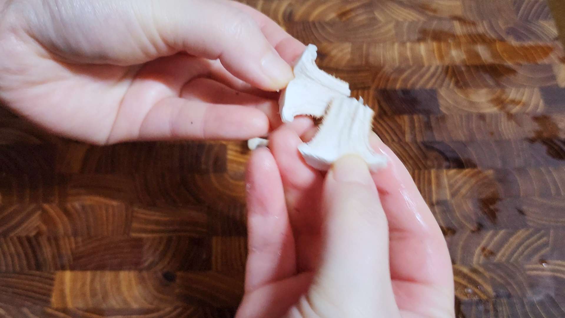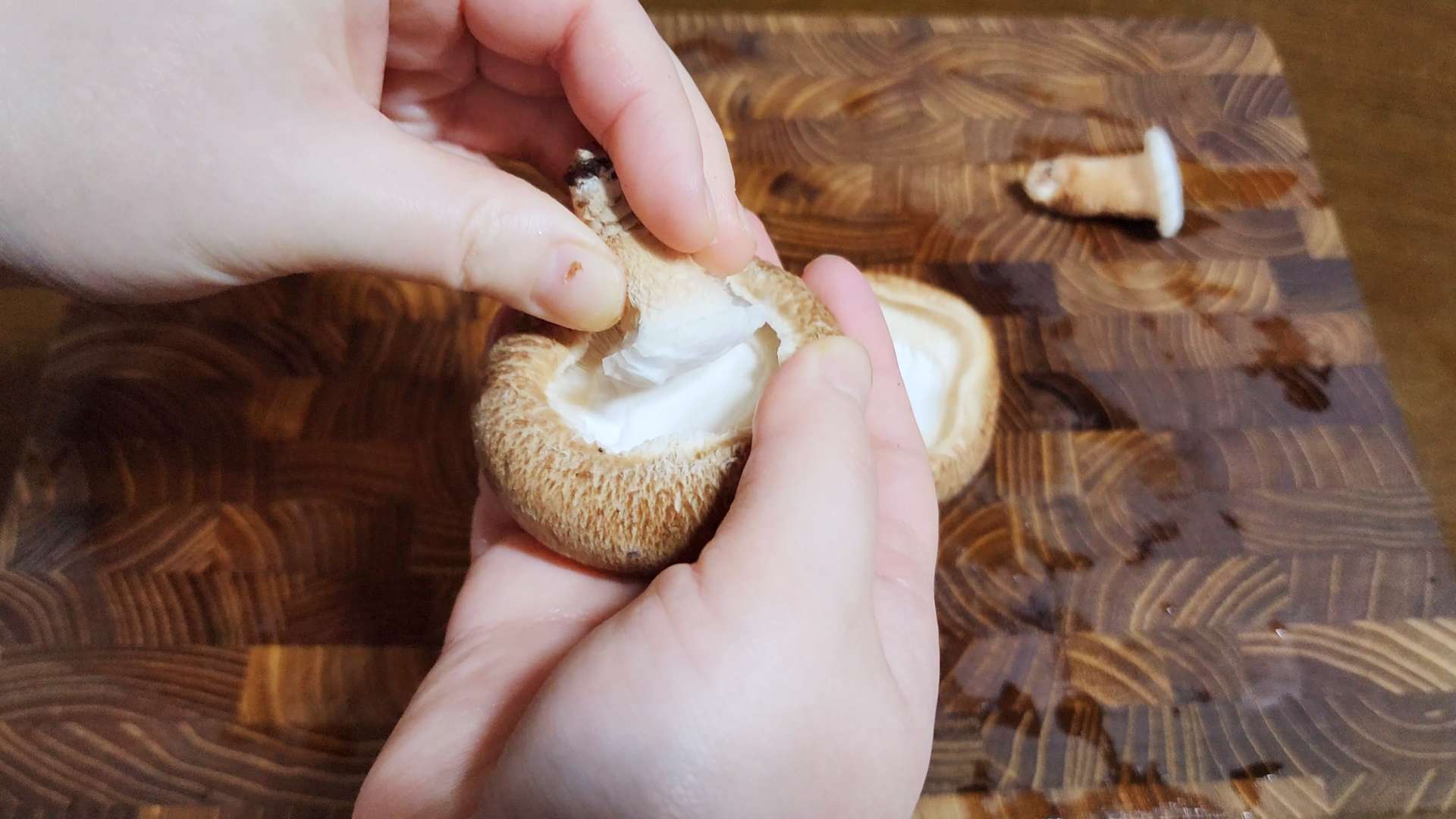딱딱한 부분은 자르고 반으로 찢어줍니다.