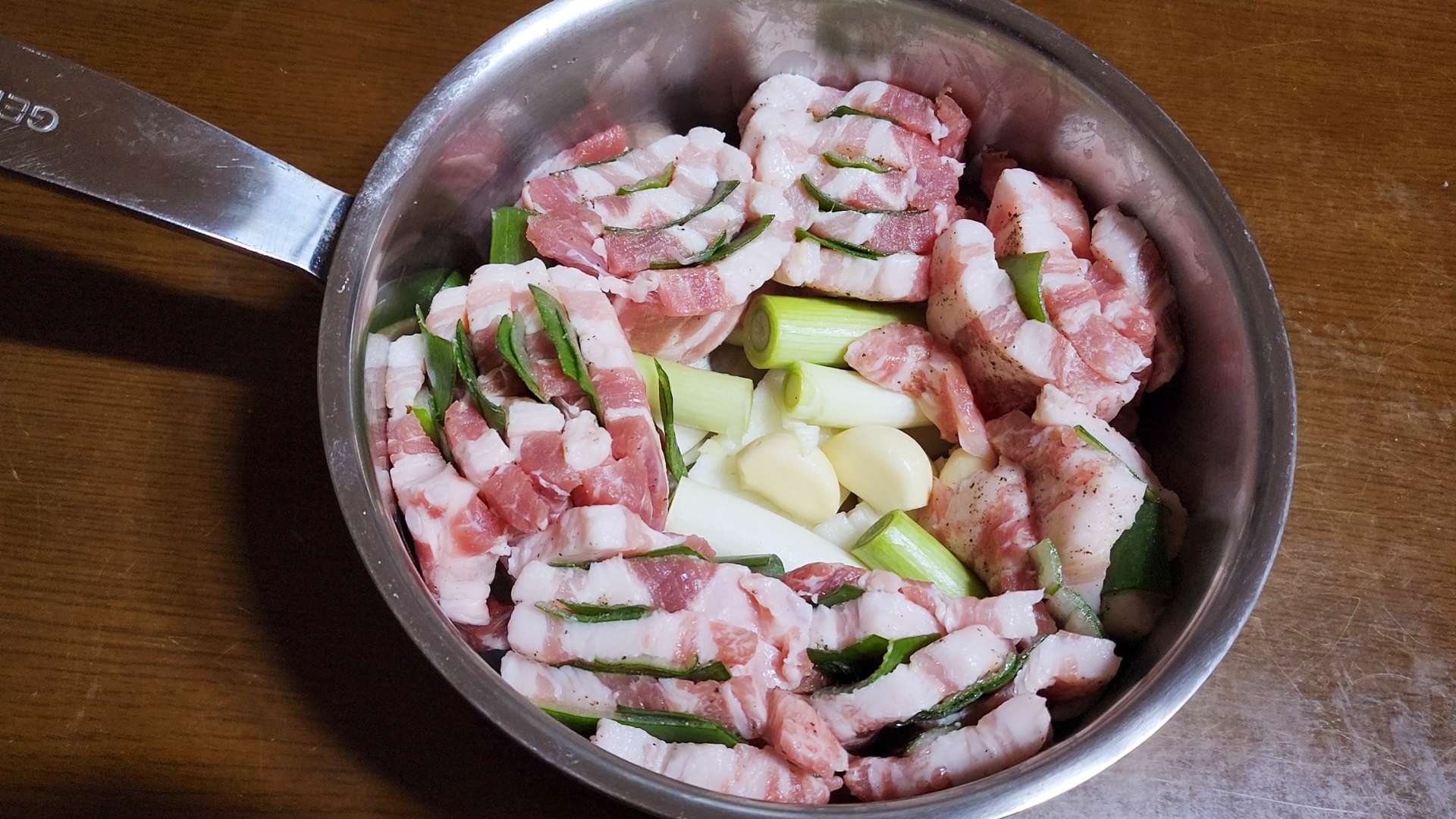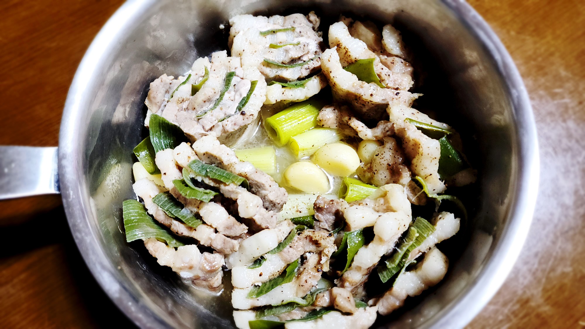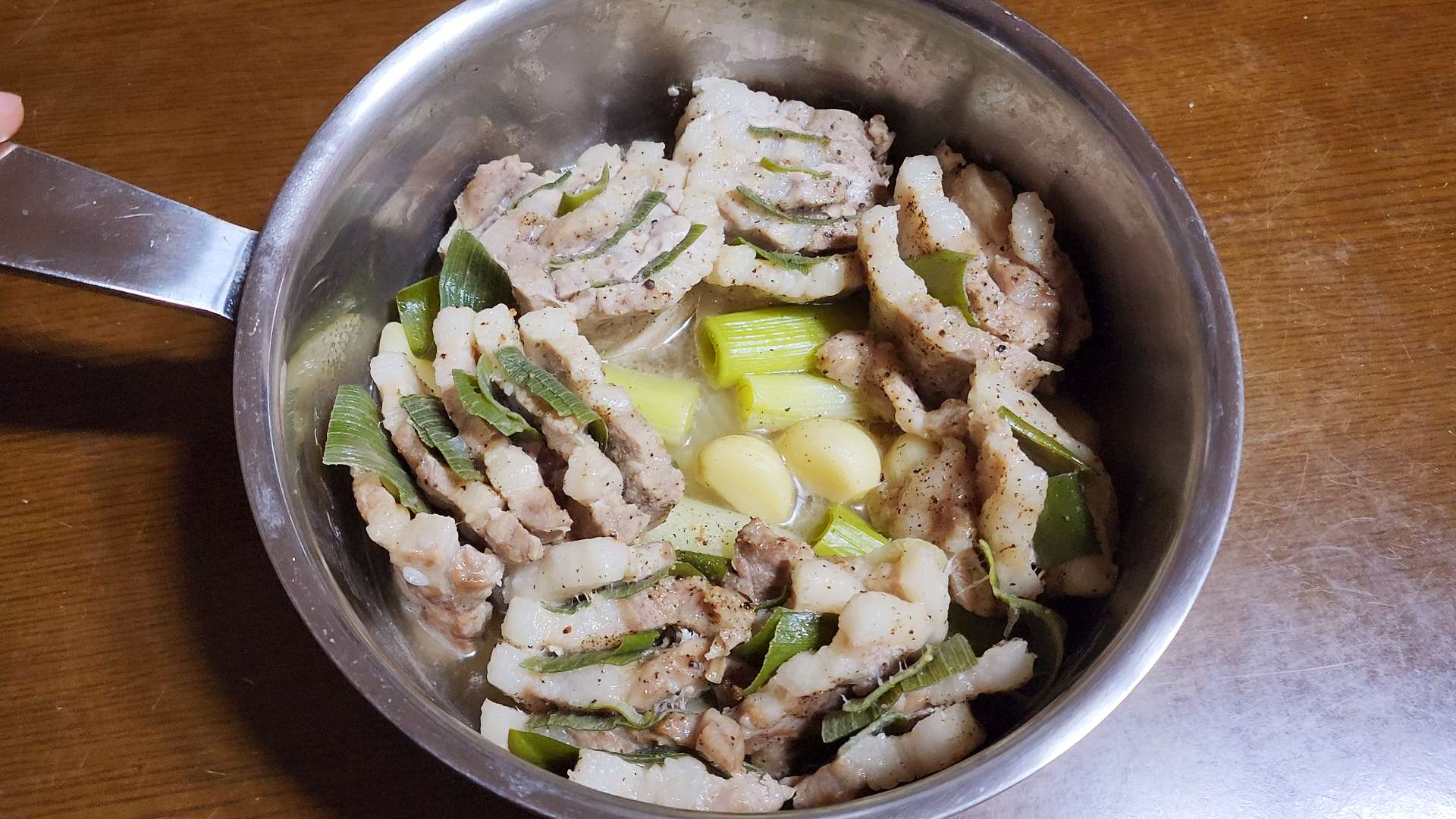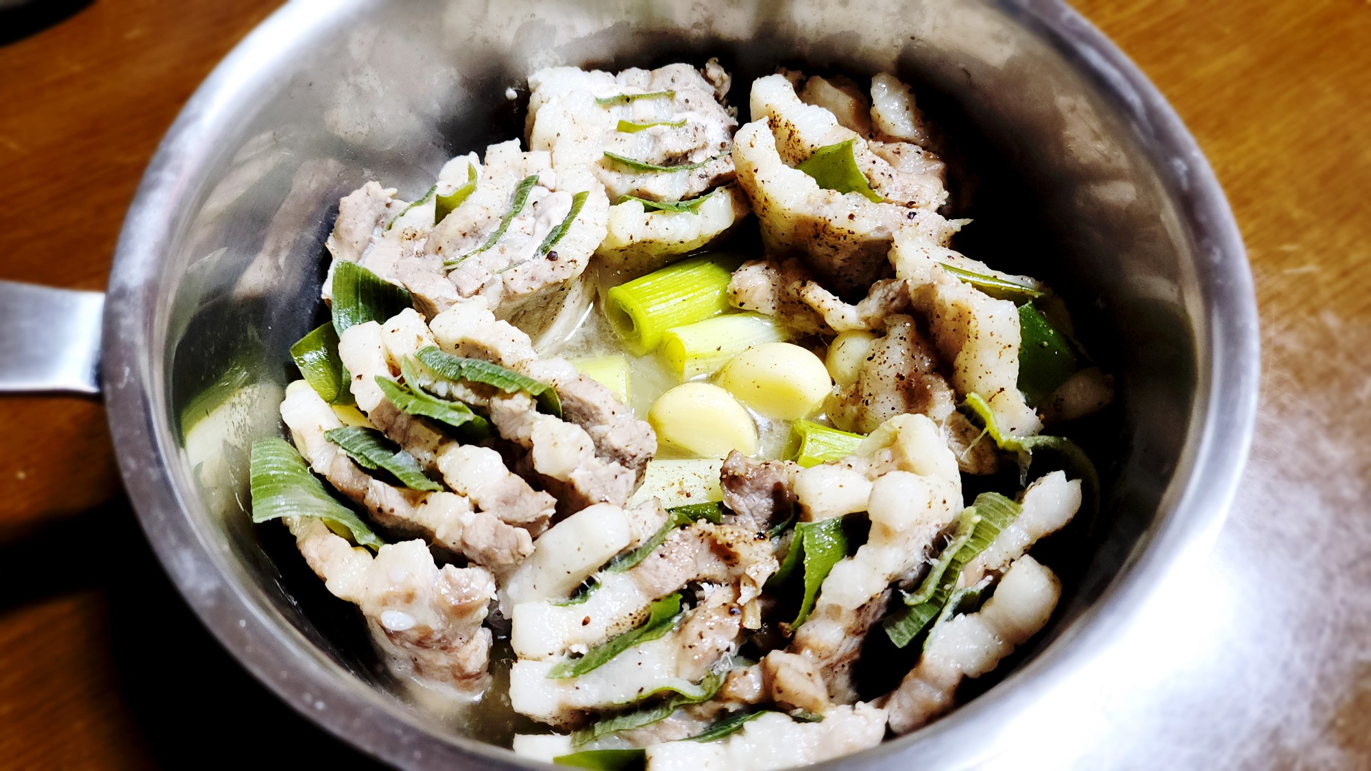 재료: 삼겹살 600g, 대파 2대, 양파 1/2개, 소금 약간, 후추 약간, 후추 약간, 생강 1개, 마늘 한 줌, 소주 약간