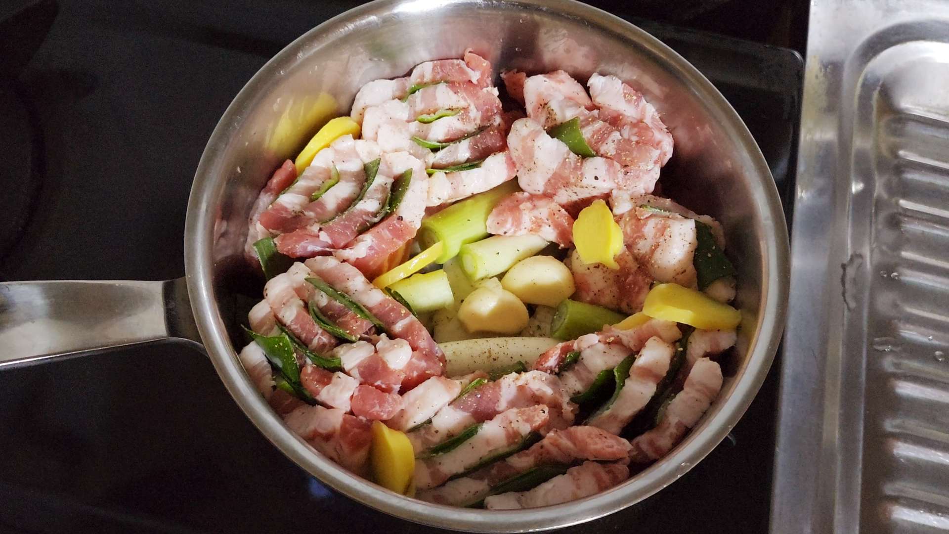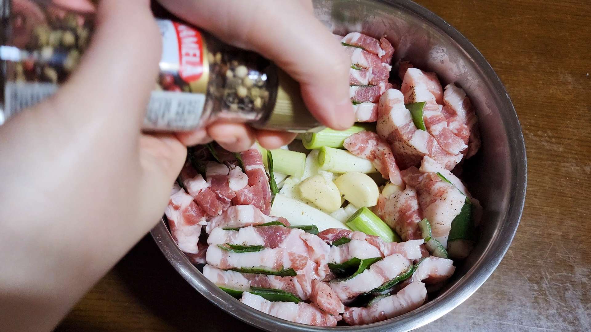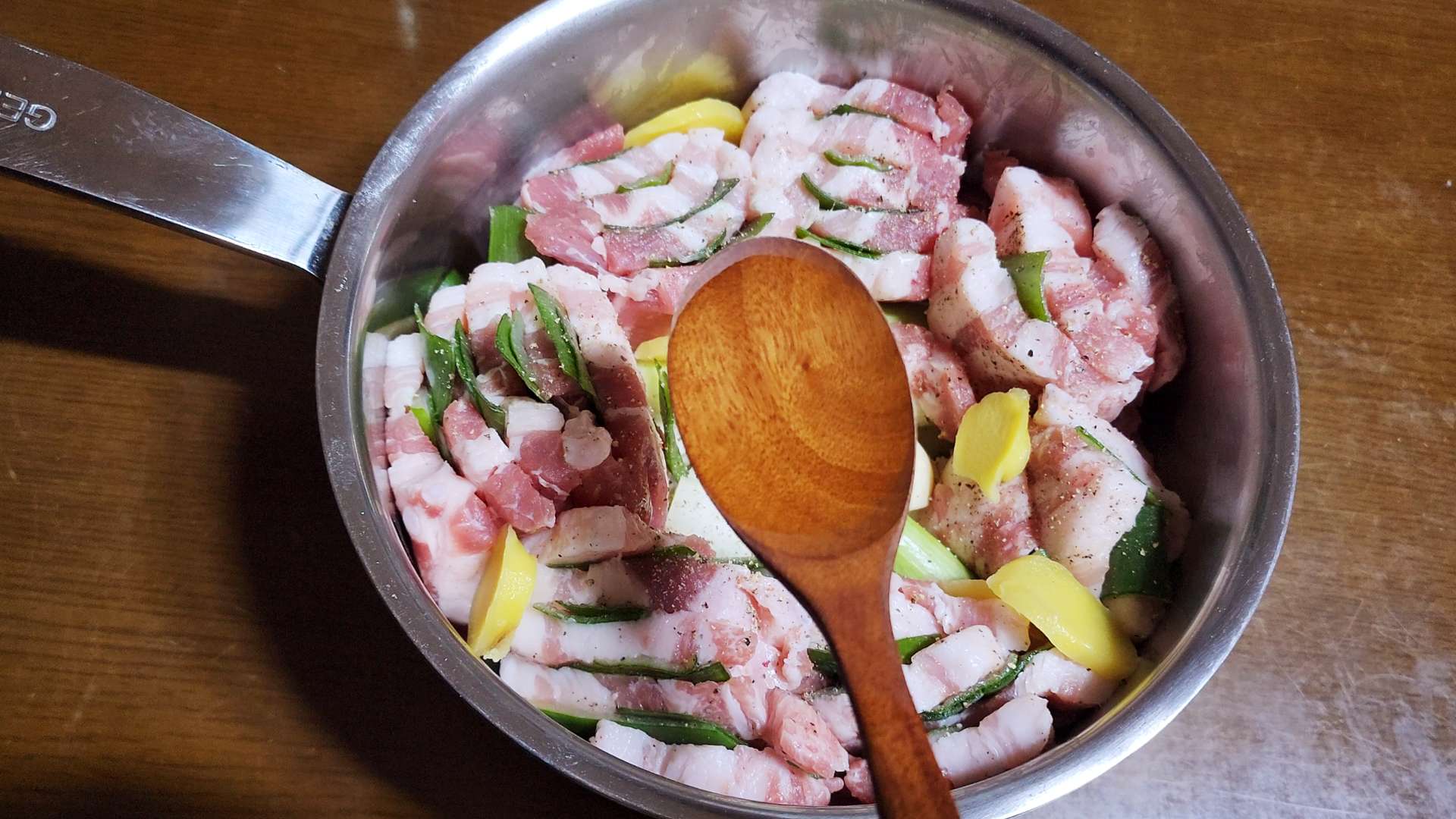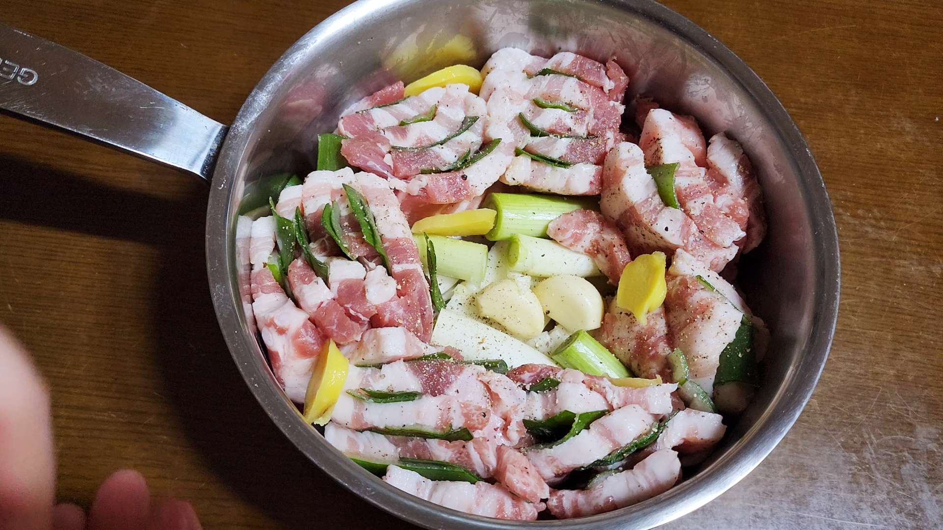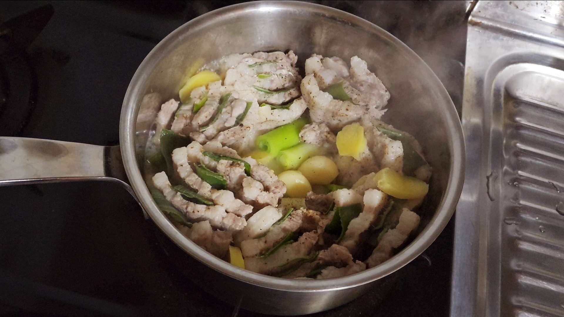 재료: 삼겹살 600g, 대파 2대, 양파 1/2개, 소금 약간, 후추 약간, 후추 약간, 생강 1개, 마늘 한 줌, 소주 약간