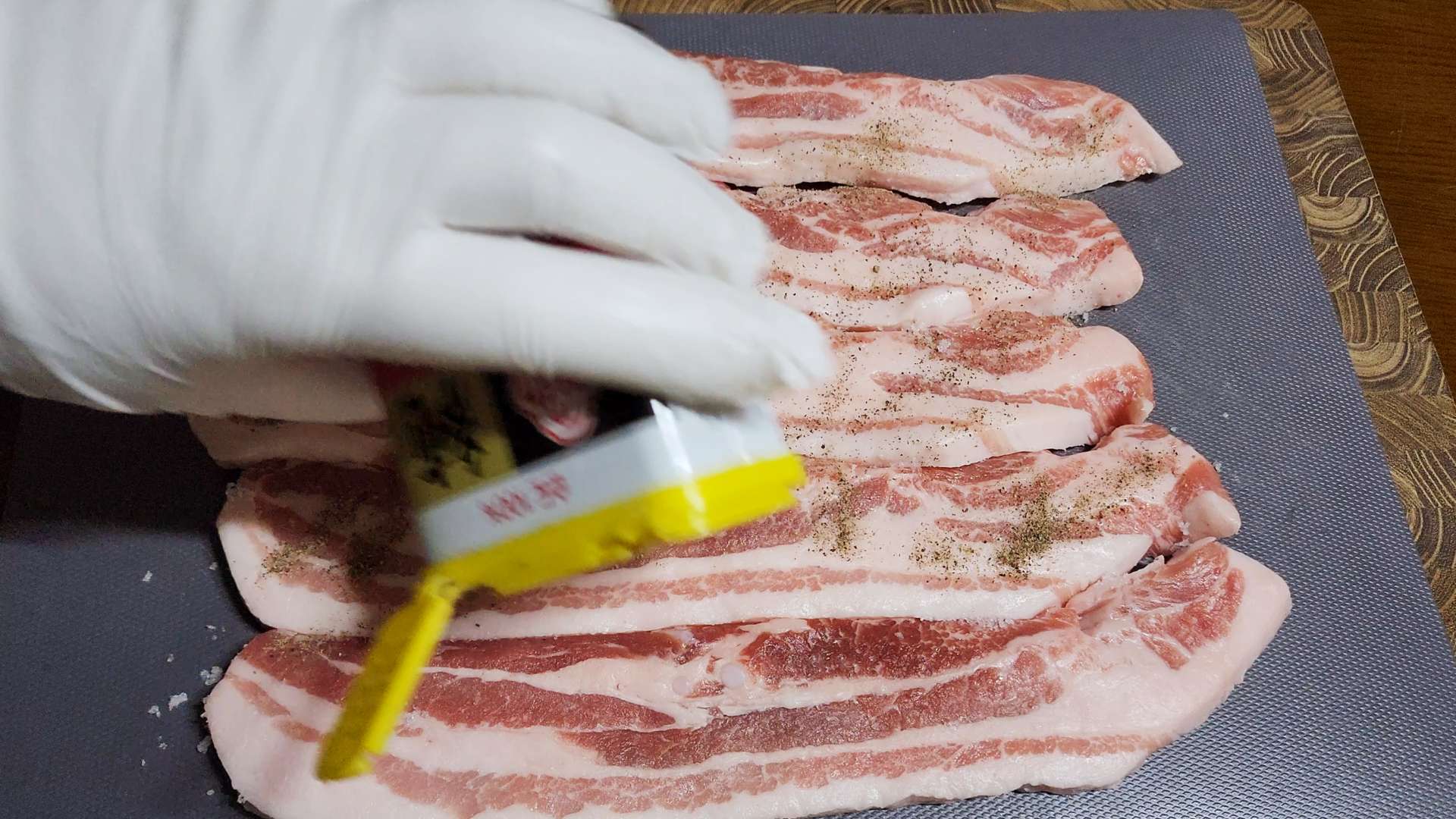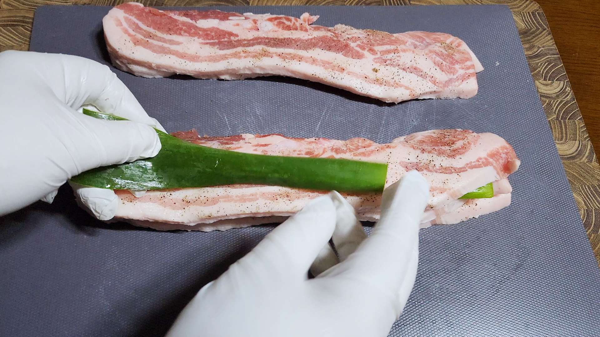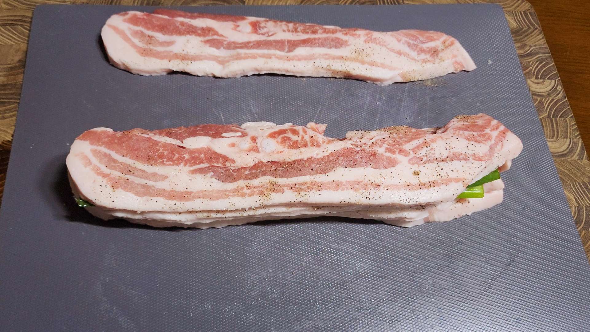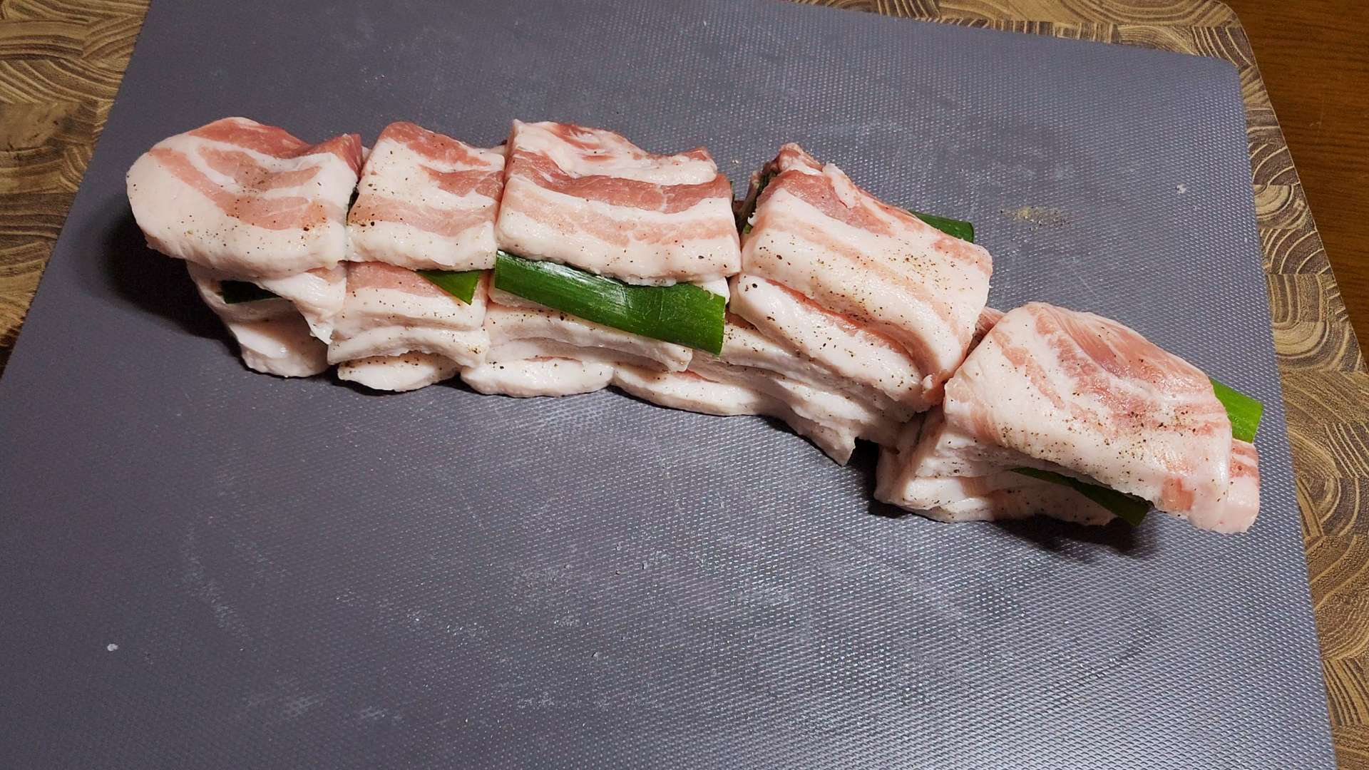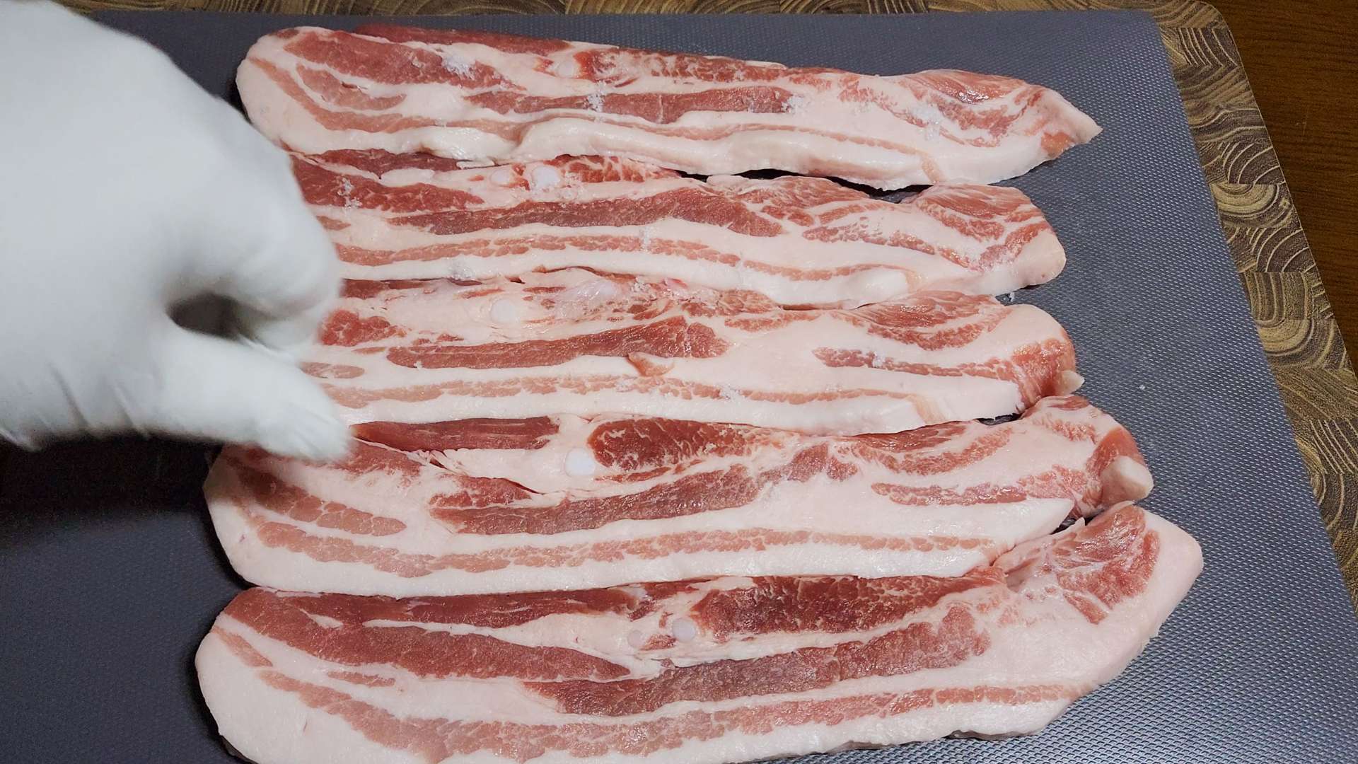 삼겹살은 층이 보이게 세워서 넣어줍니다.