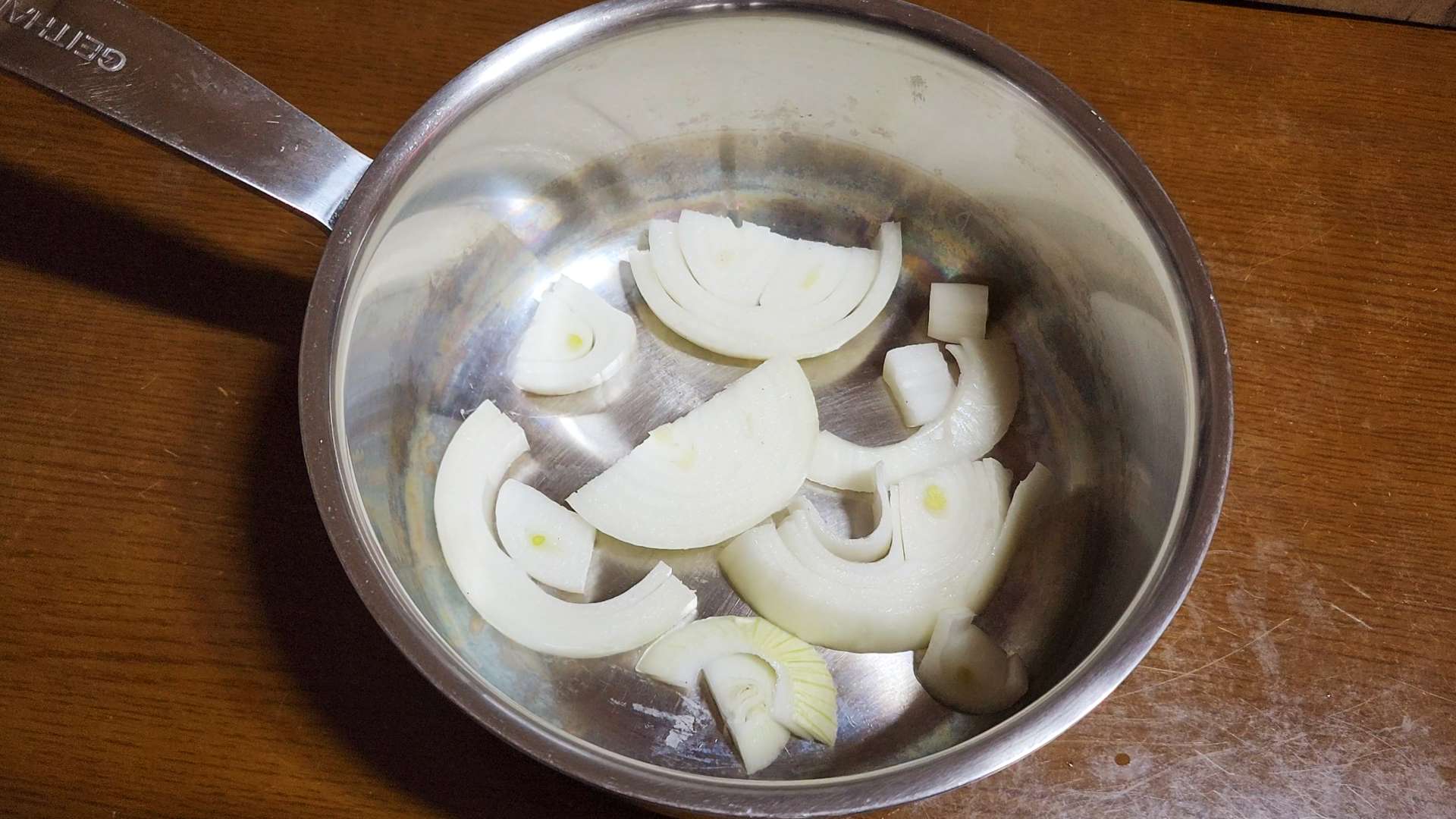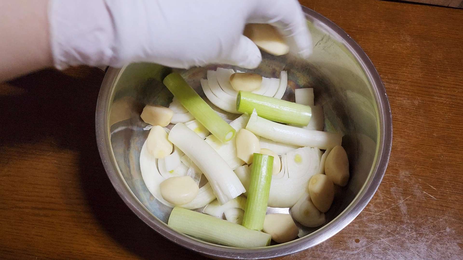 냄비에 양파, 대파 흰 부분, 마늘을 깔아줍니다.