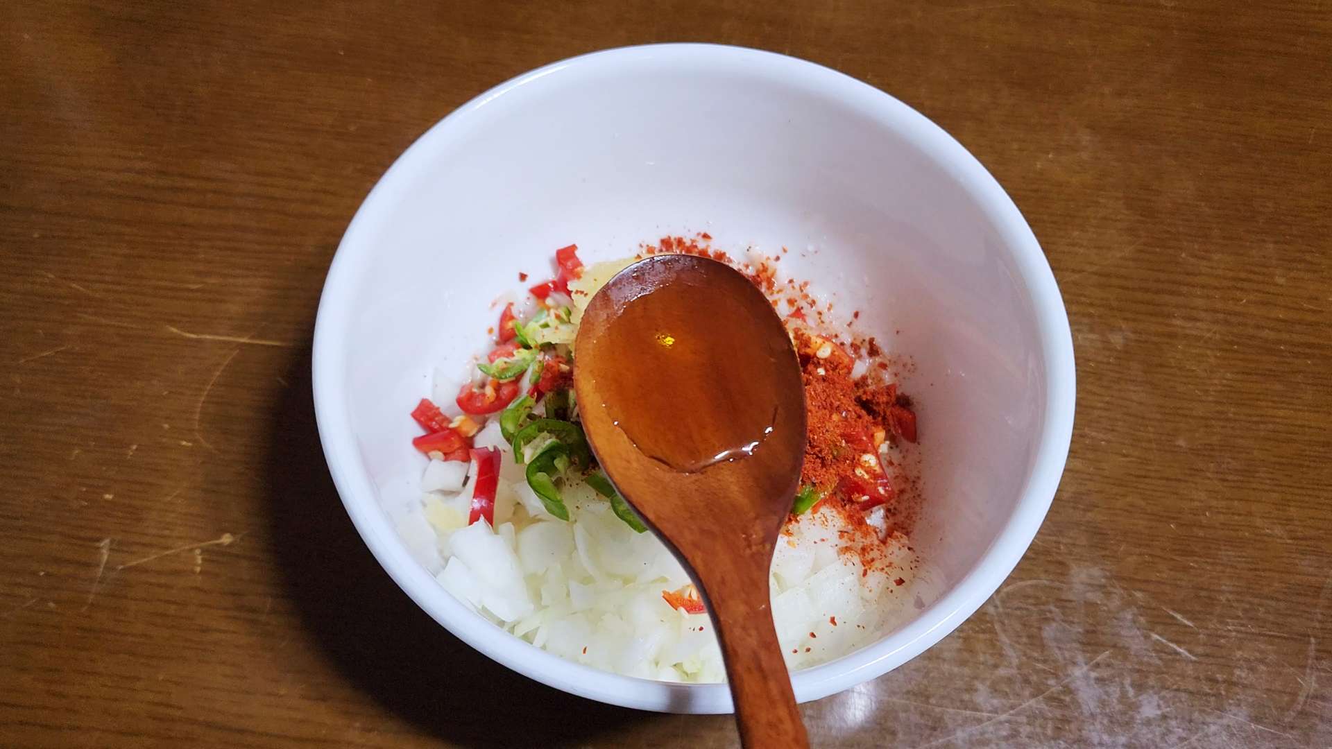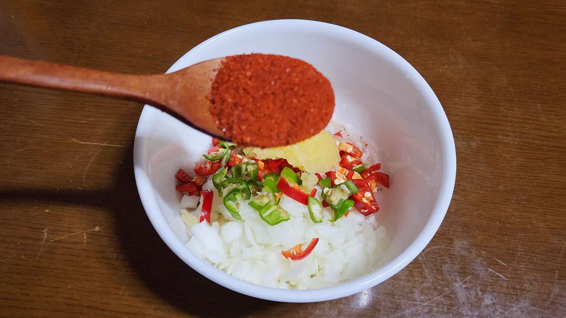 양념: 설탕 2T, 고춧가루 1T, 참기름 1t,