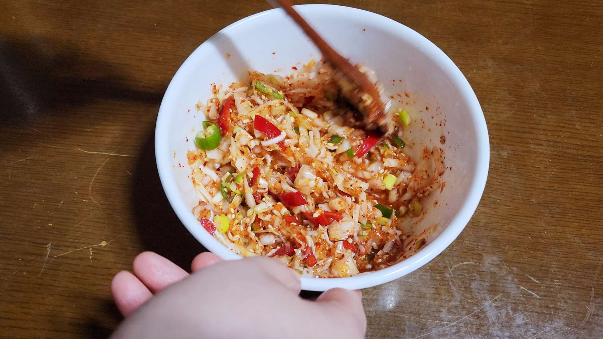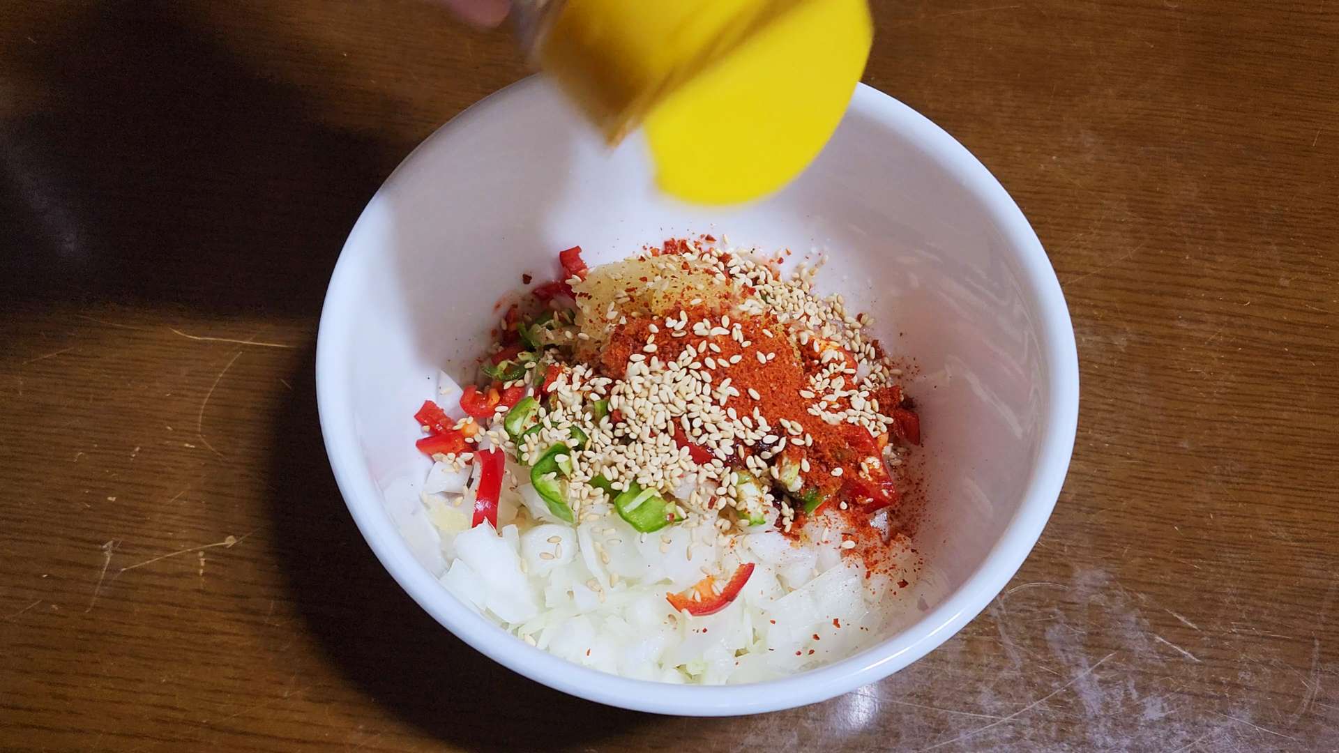 고춧가루 1T, 참기름 1t, 통깨를 넣고 섞어줍니다.