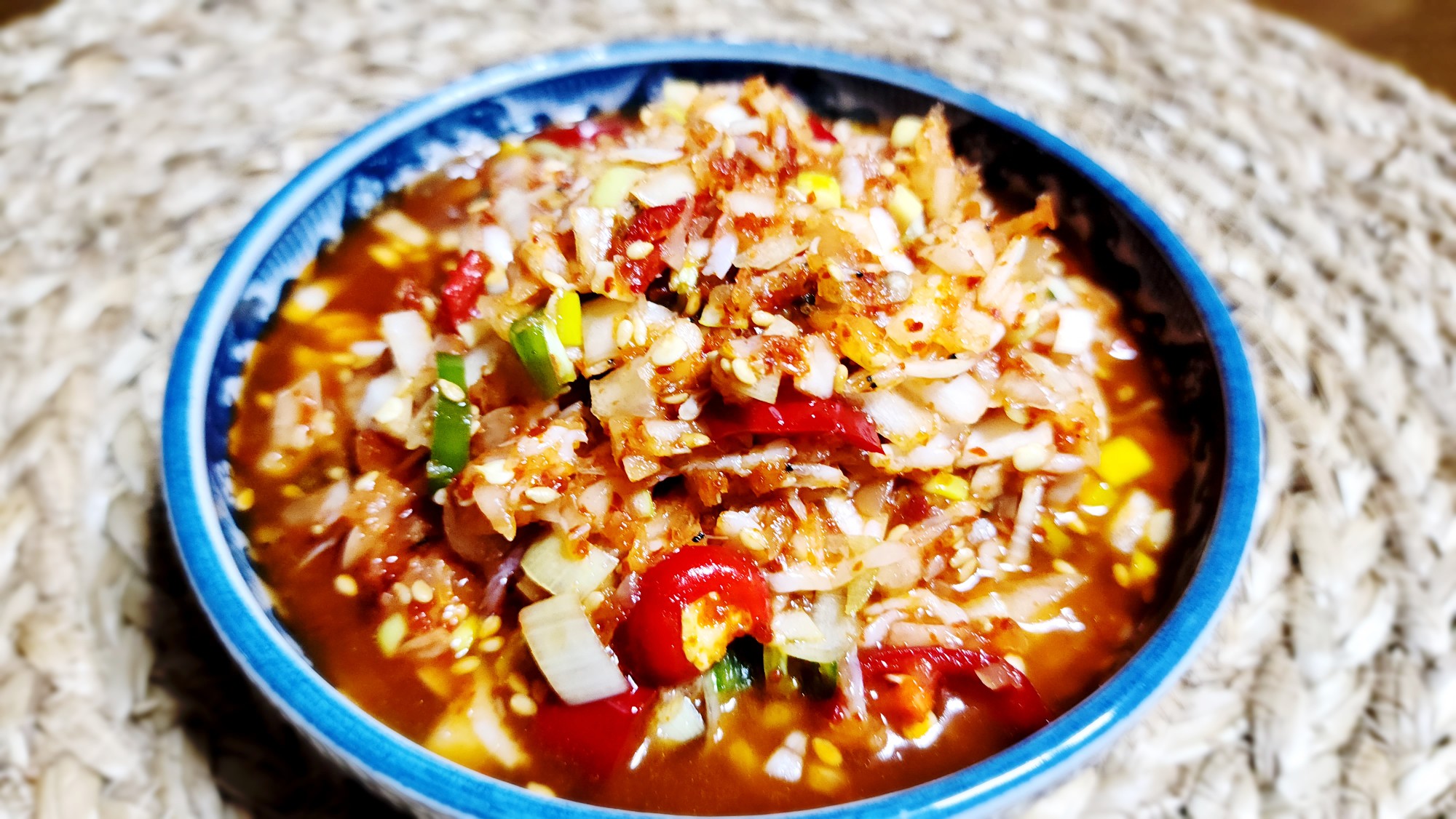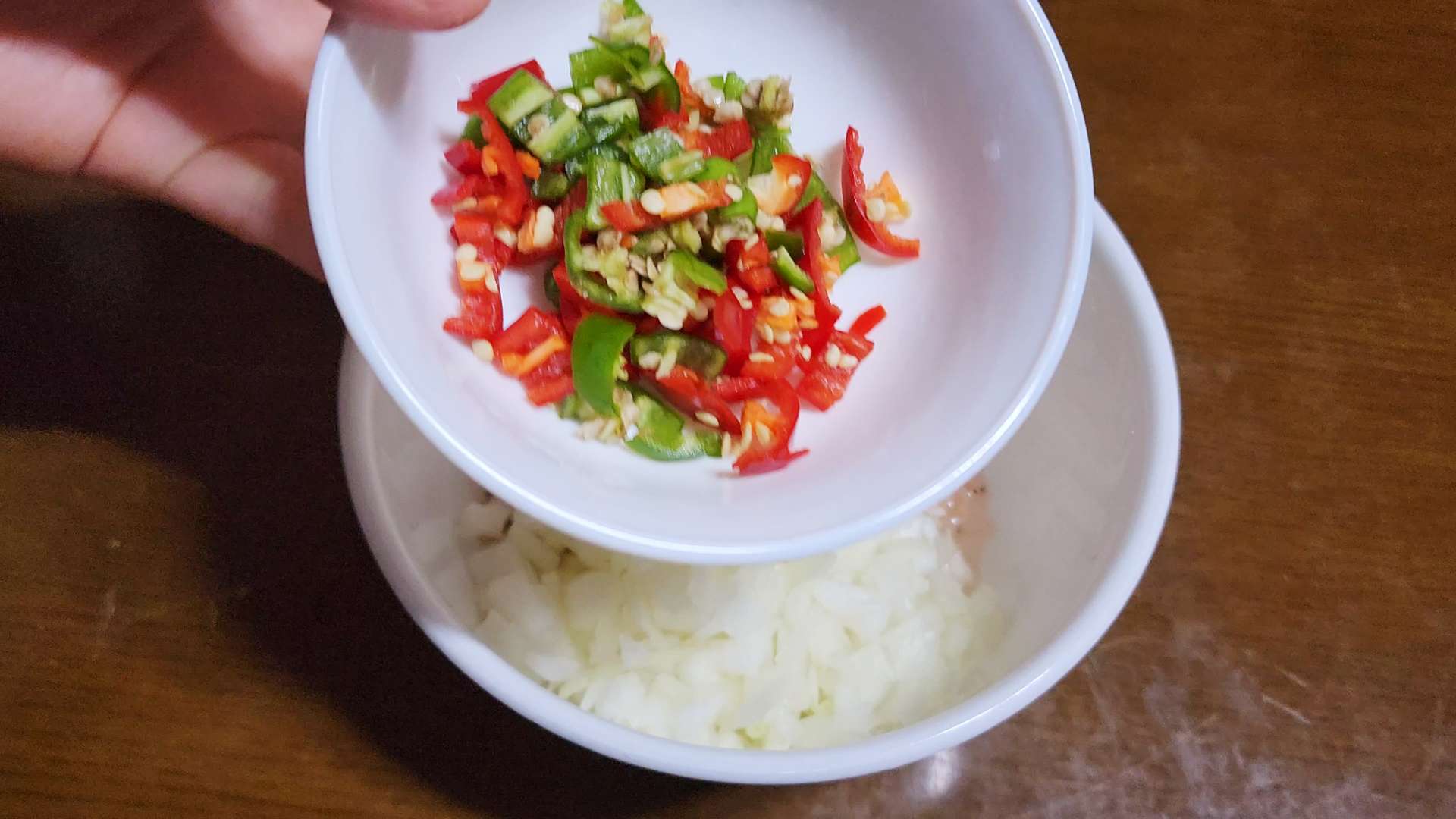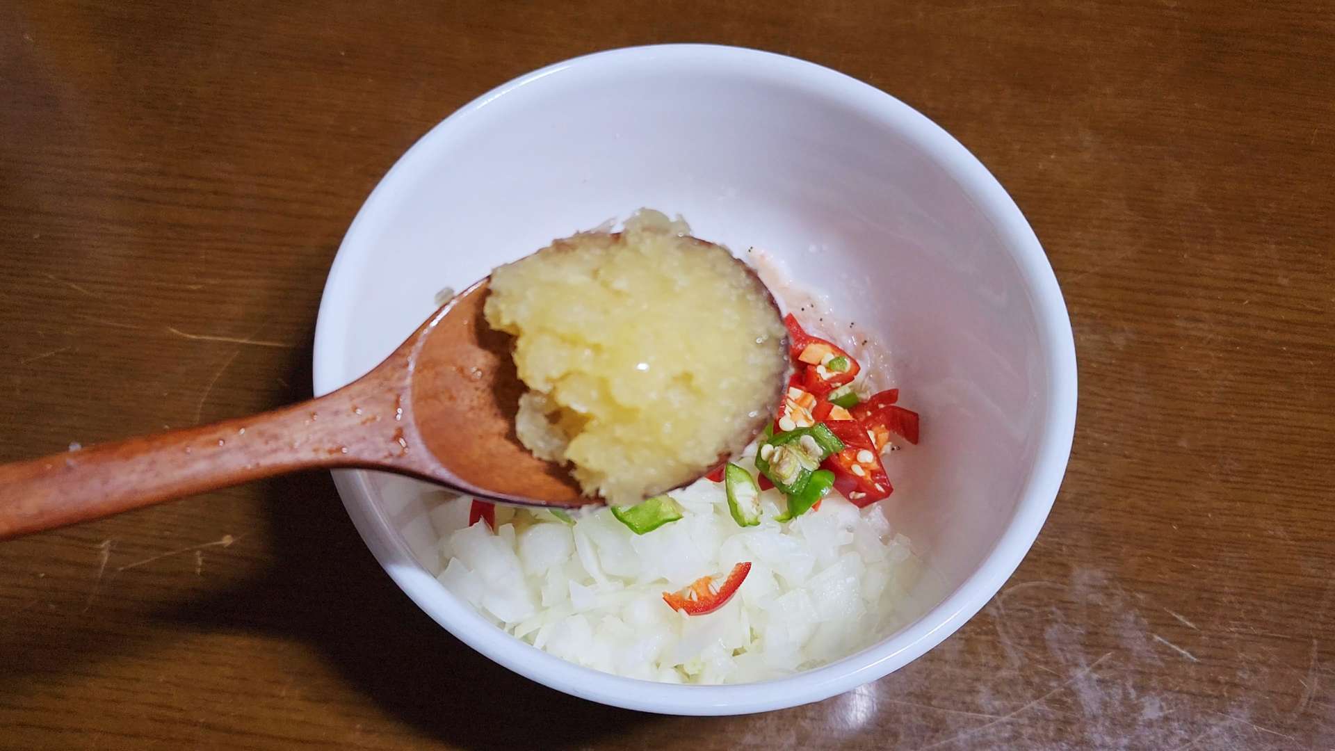 재료: 새우젓 4T, 대파 흰 부분 1대, 홍고추 1개, 청양고추 1개, 양파 1/4개