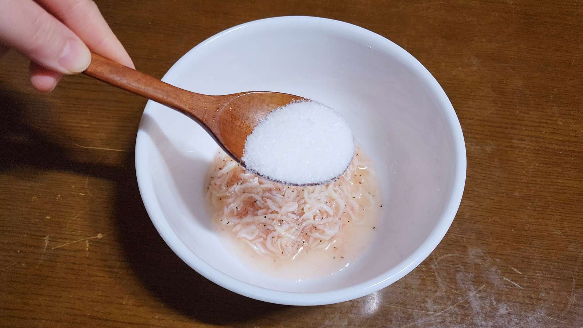 새우젓 4T, 설탕 2T 넣고 섞어줍니다.