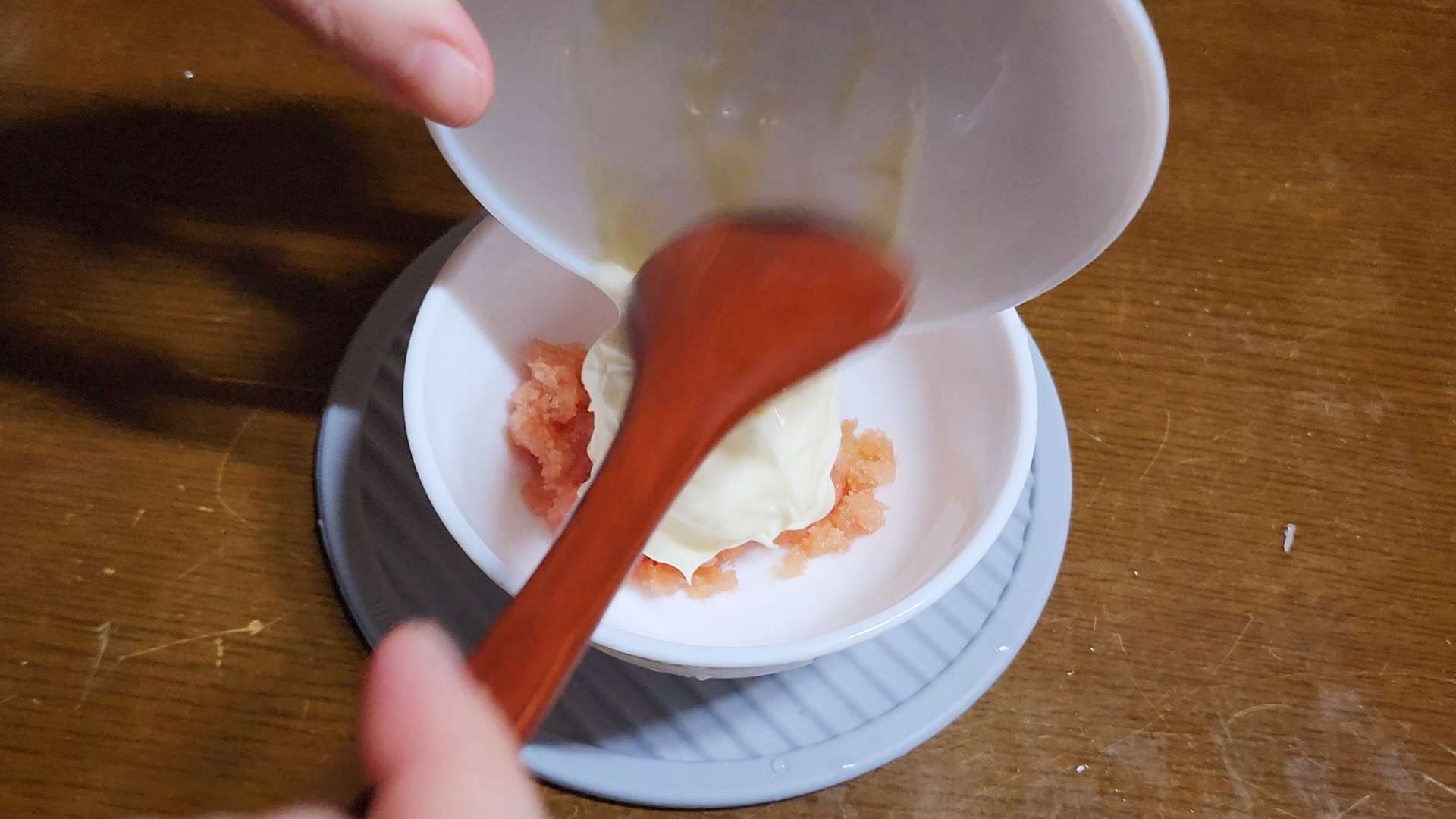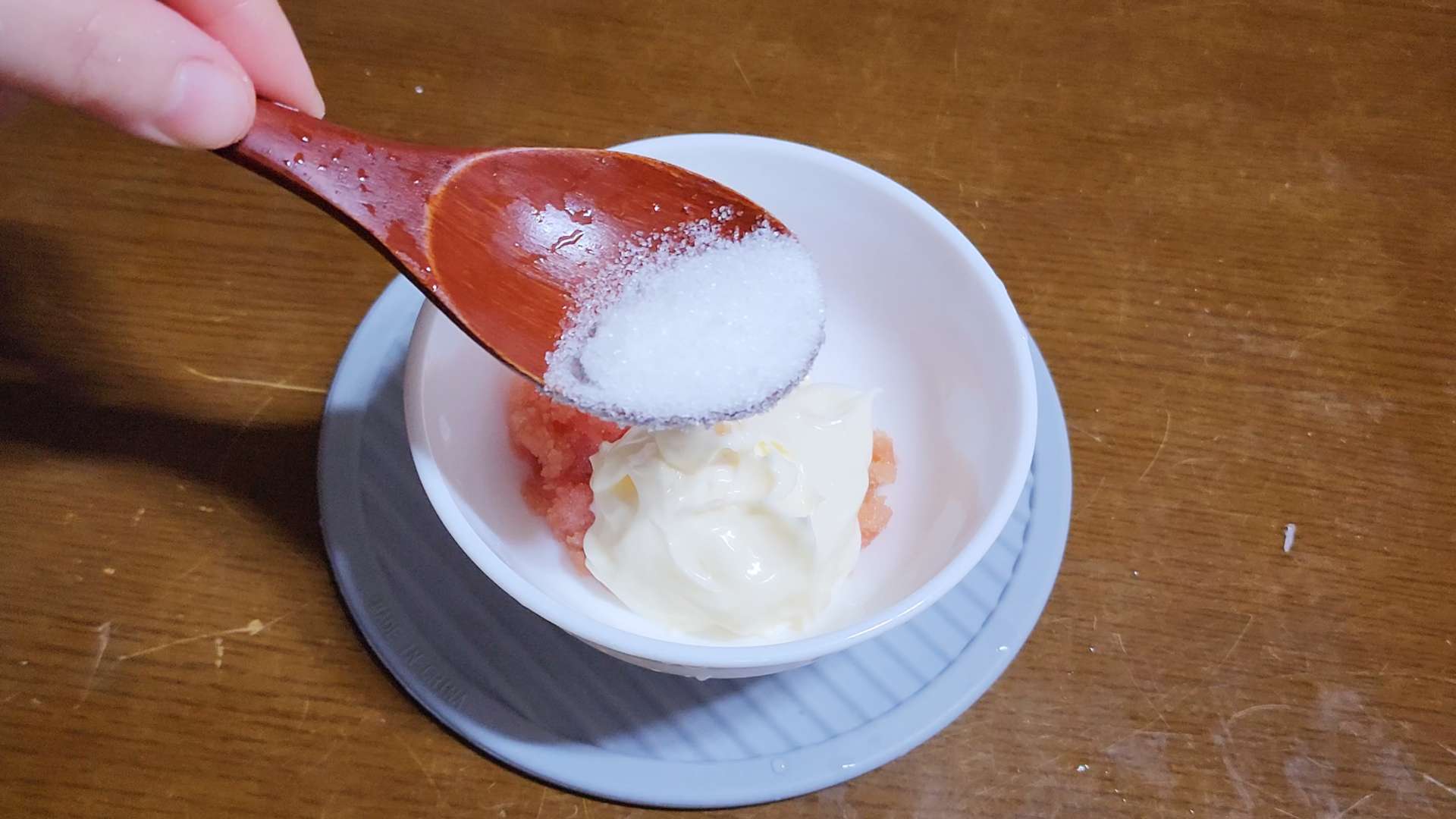 명란젓, 마요네즈 3T, 설탕 0.5T, 참치액 0.5t를 넣고 섞어줍니다.