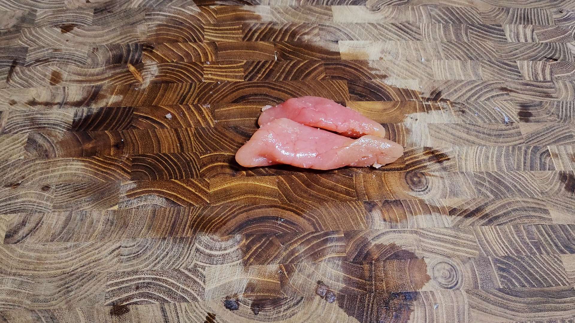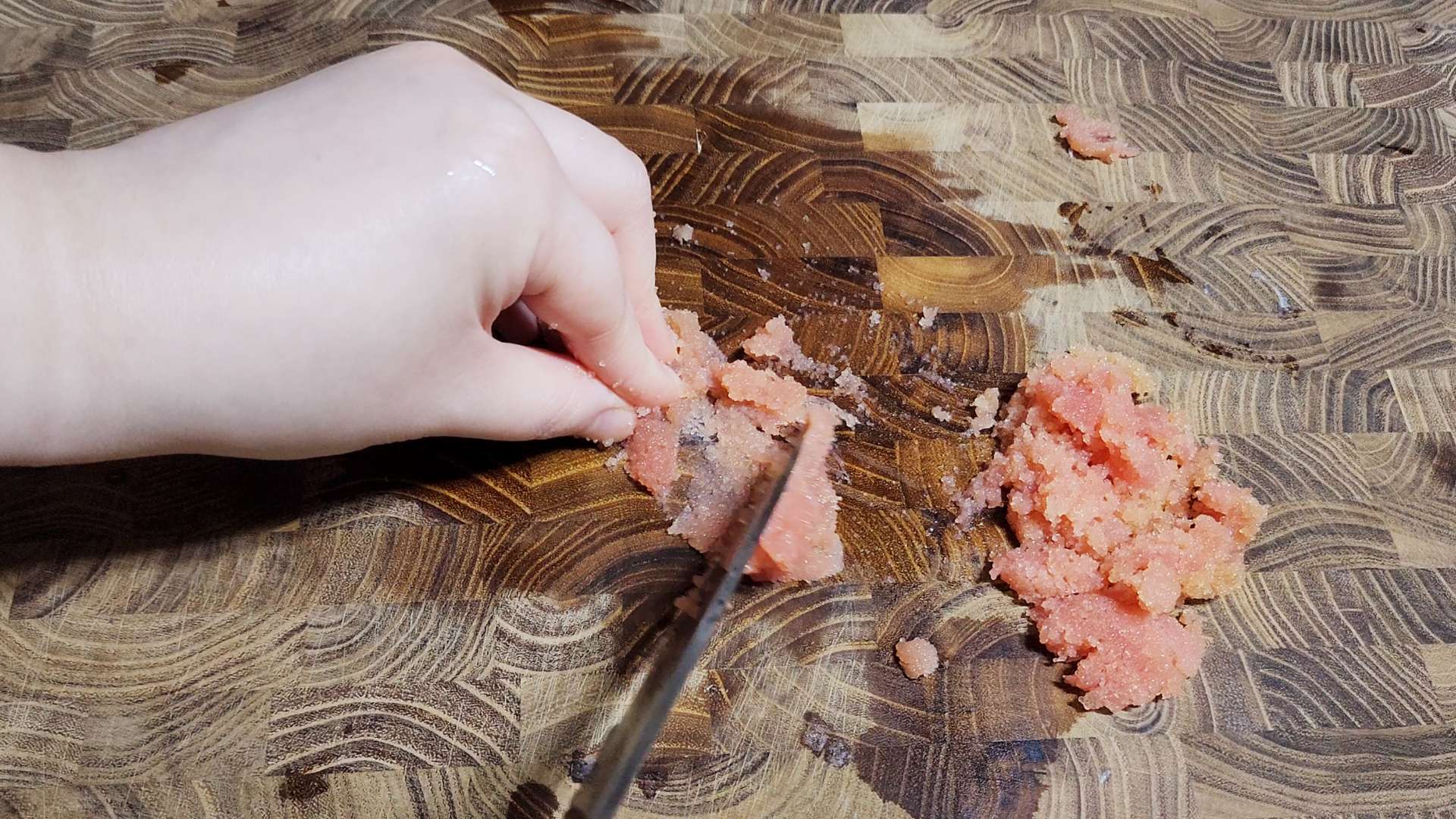명란젓은 반으로 잘라 칼로 밀어 알을 빼줍니다.