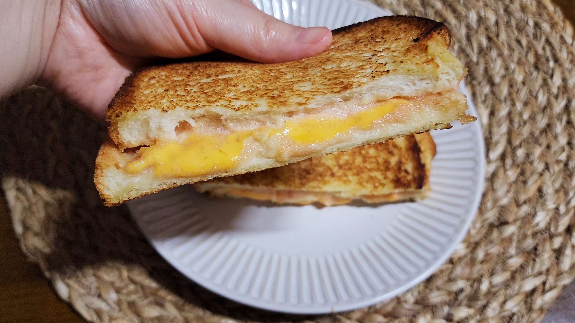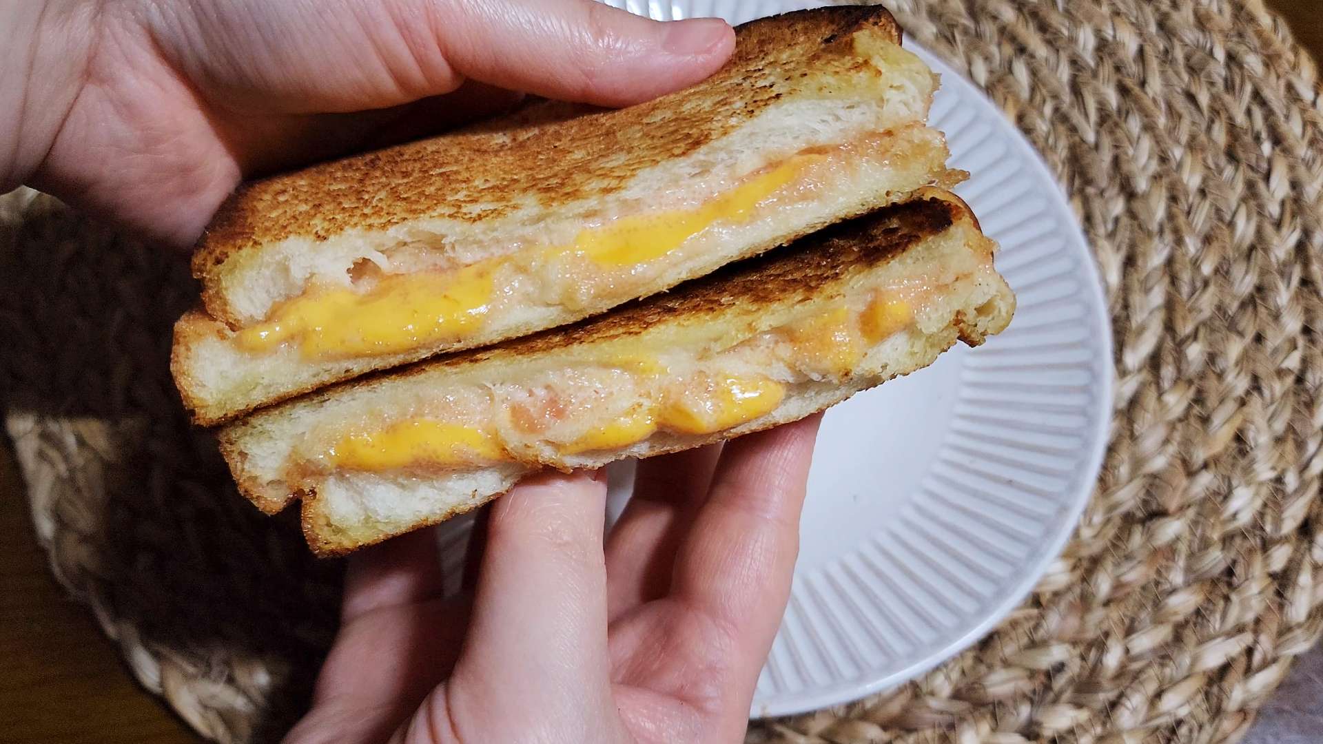 재료: 명란젓 1개, 슬라이스 치즈 1장, 마요네즈 3T, 설탕 0.5T, 참치액 0.5t, 식빵 2장, 버터 20g