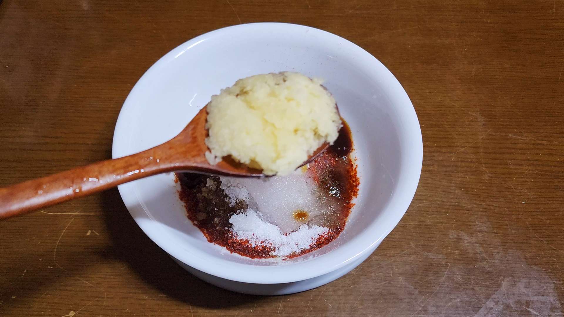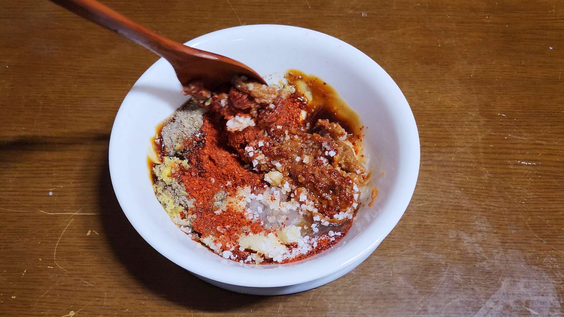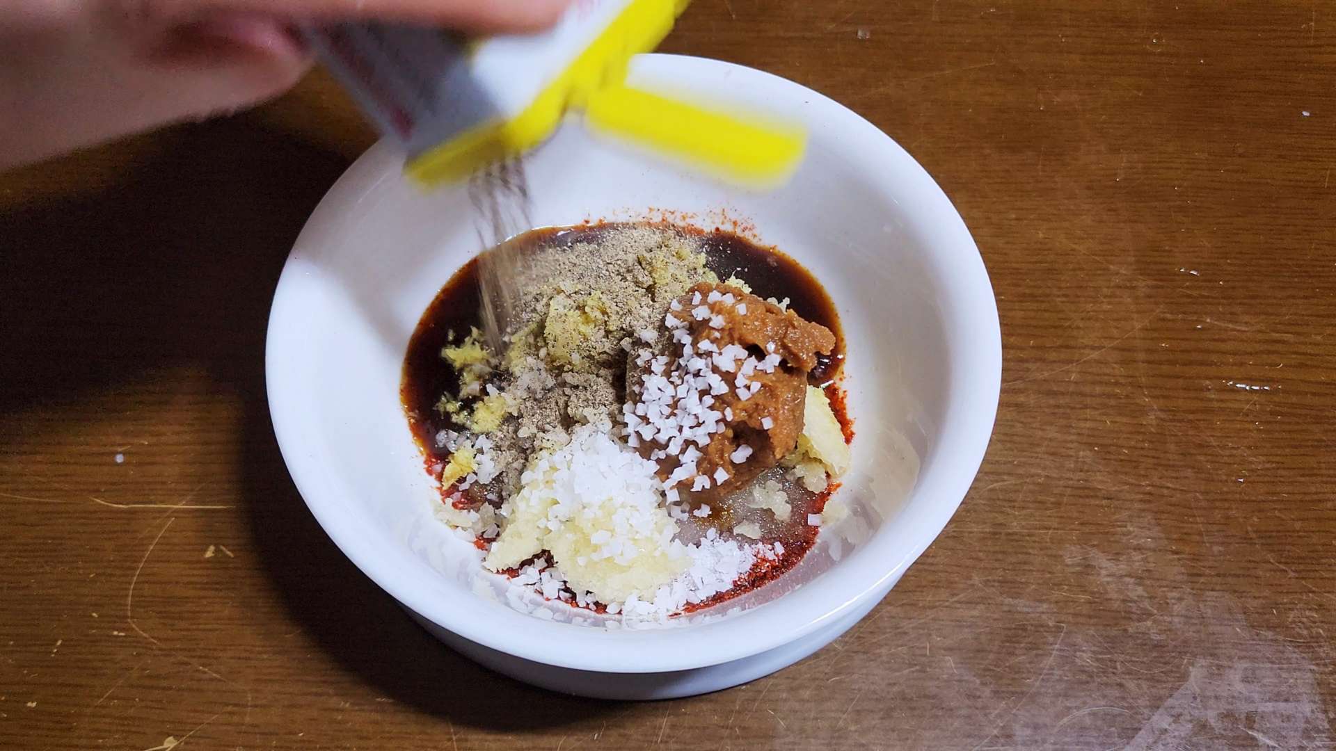 간장 5T, 고춧가루 4T, 설탕 3T, 굴소스 2T, 식초 1T, 된장 듬뿍 1T, 다진마늘 1T, 다진생강 1/2T, 굵은소금 1/3T, 후추를 넣고 섞어줍니다.