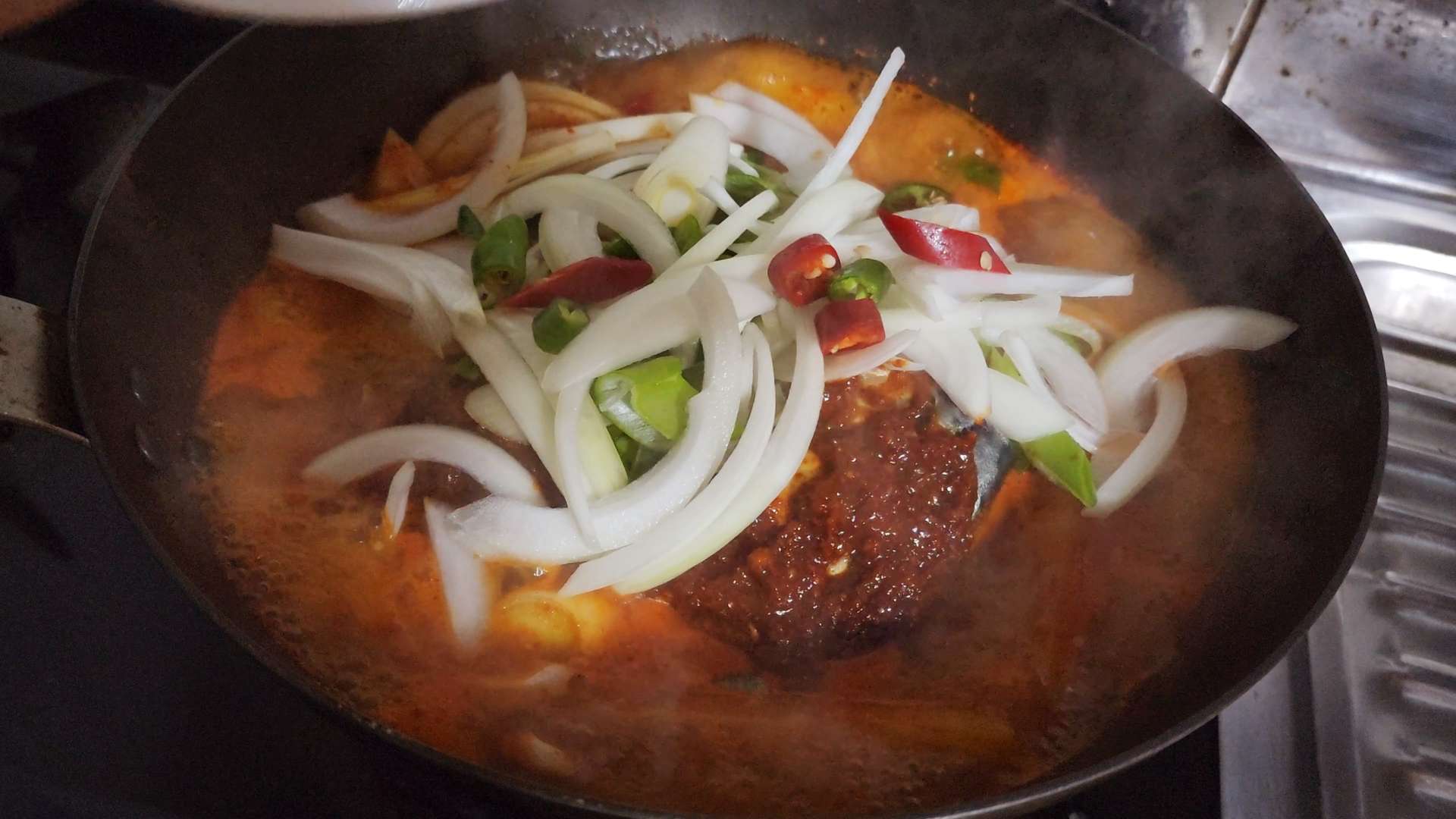 고등어를 넣고 위에 양념장을 1T씩 발라줍니다.
