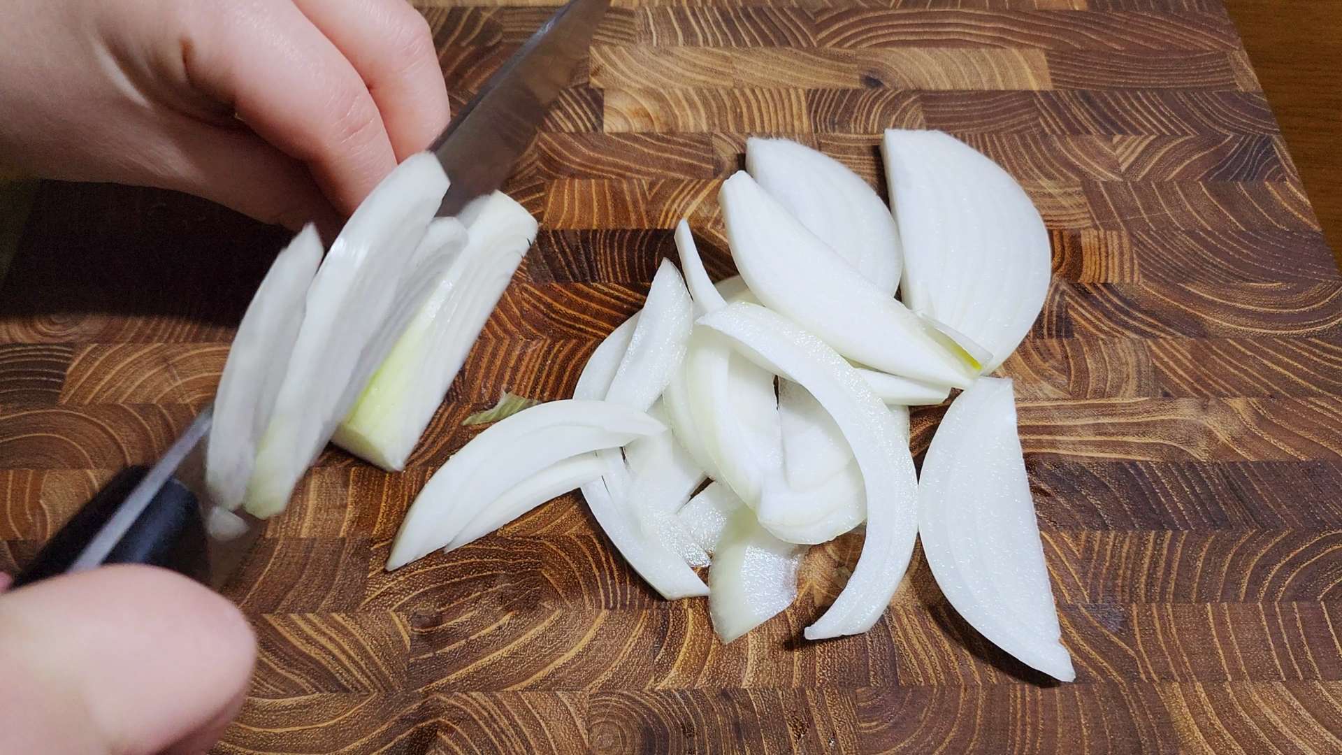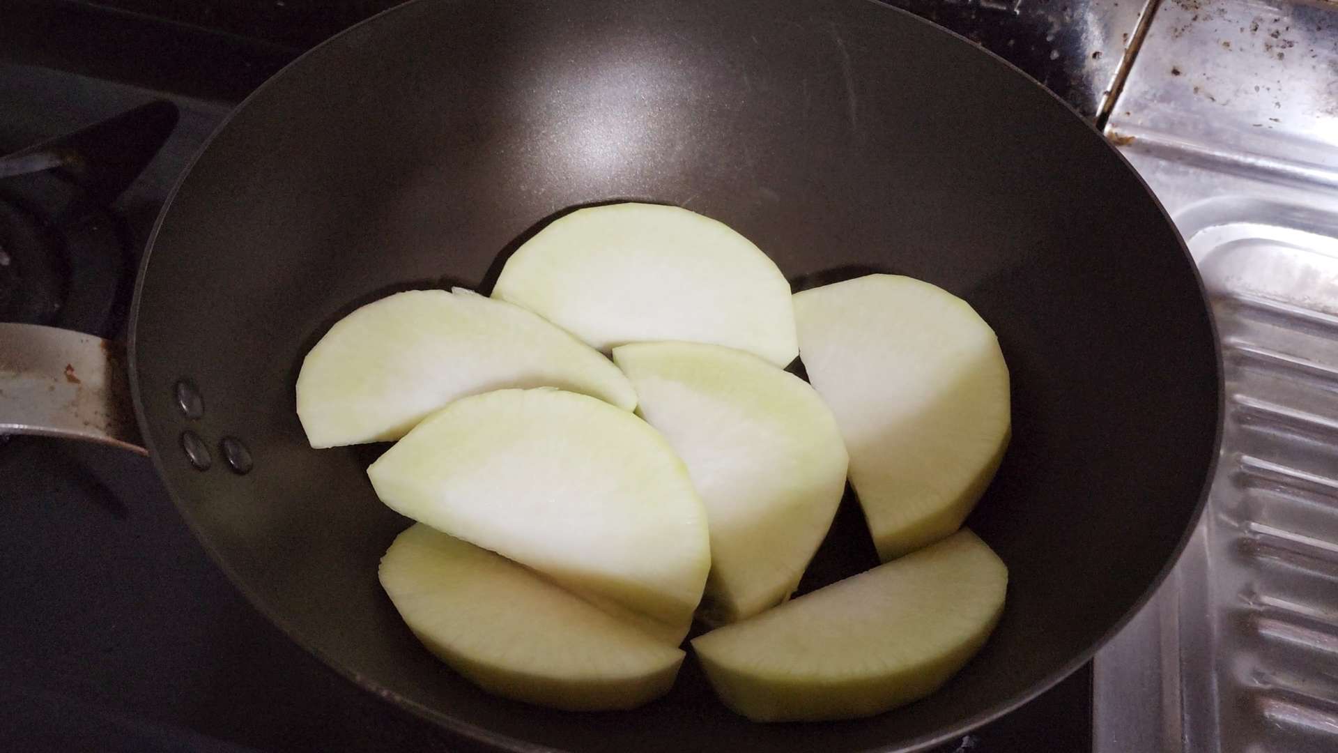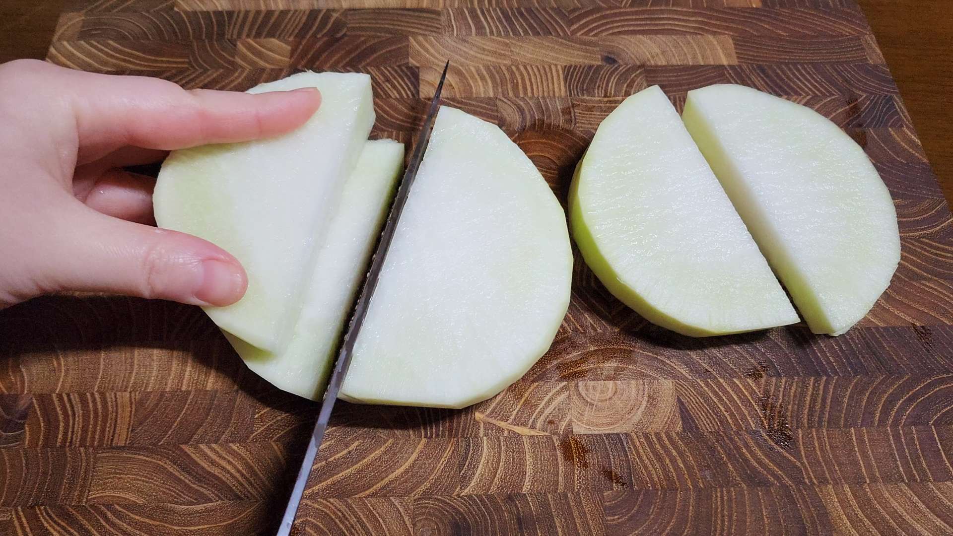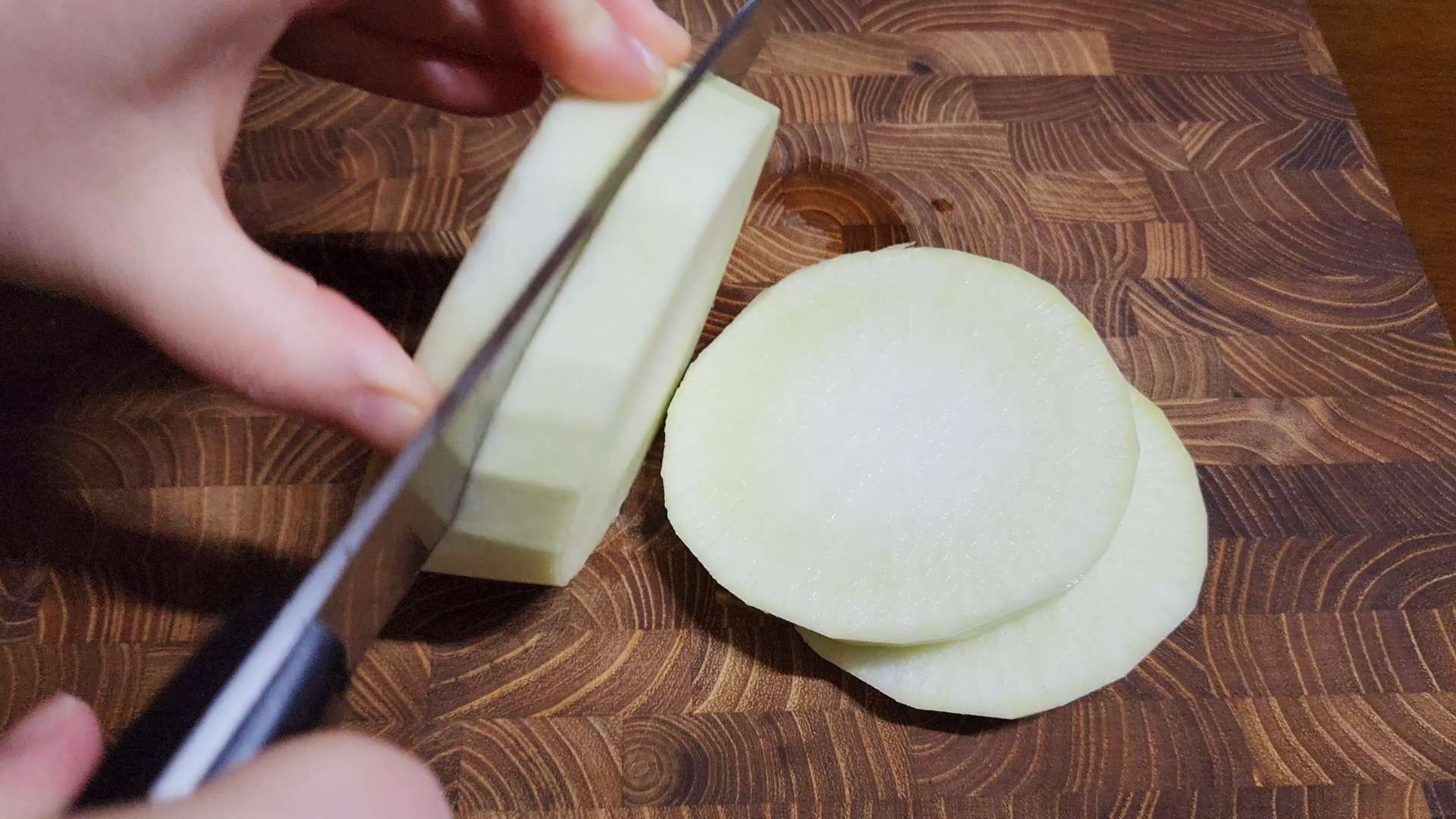 무는 껍질을 벗기고 1cm 두께로 자르고 2등분 해줍니다.