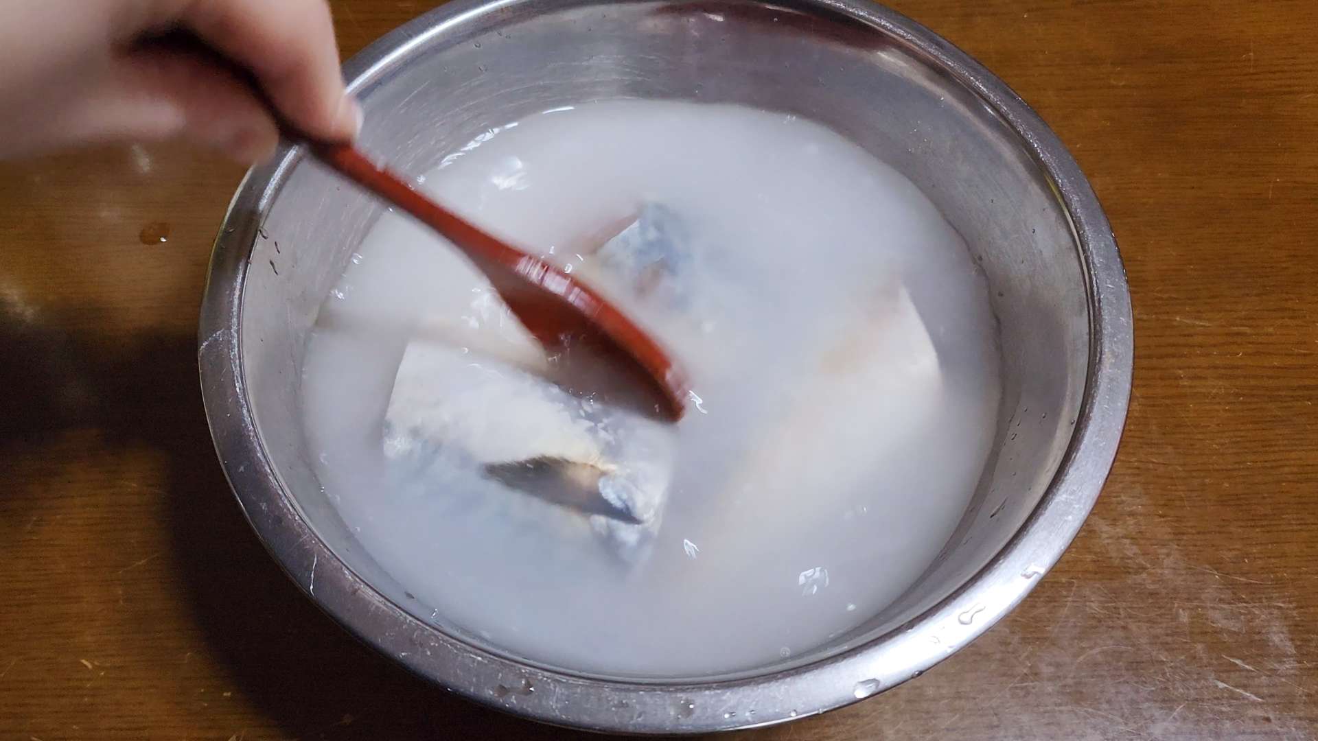 고등어, 굵은소금 1T, 식초 1T, 밀가루 1T, 찬물을 넣고 20분간 담가줍니다.
