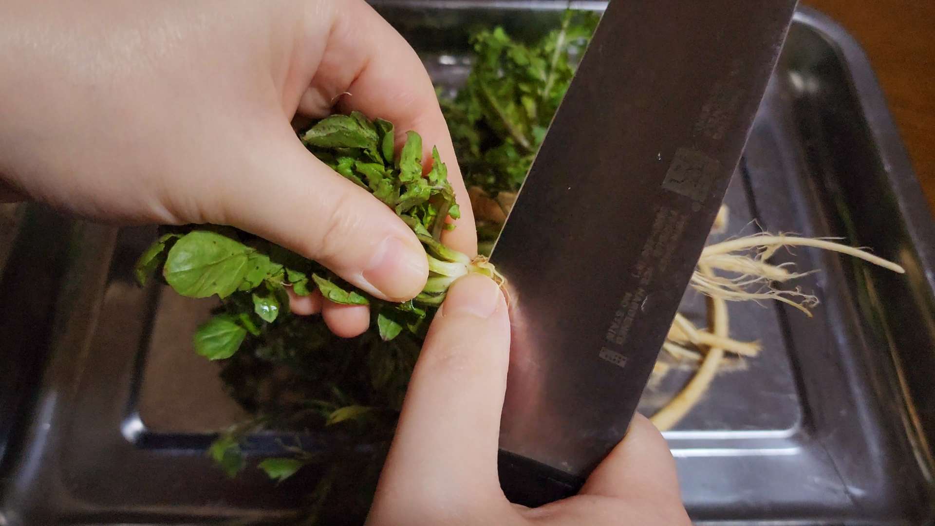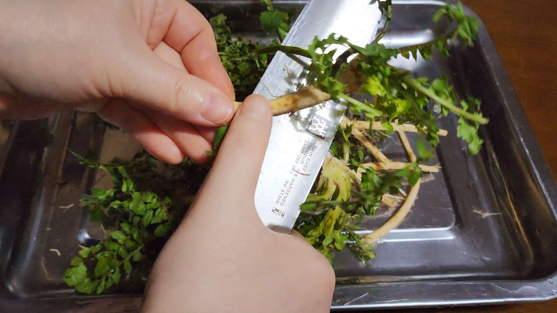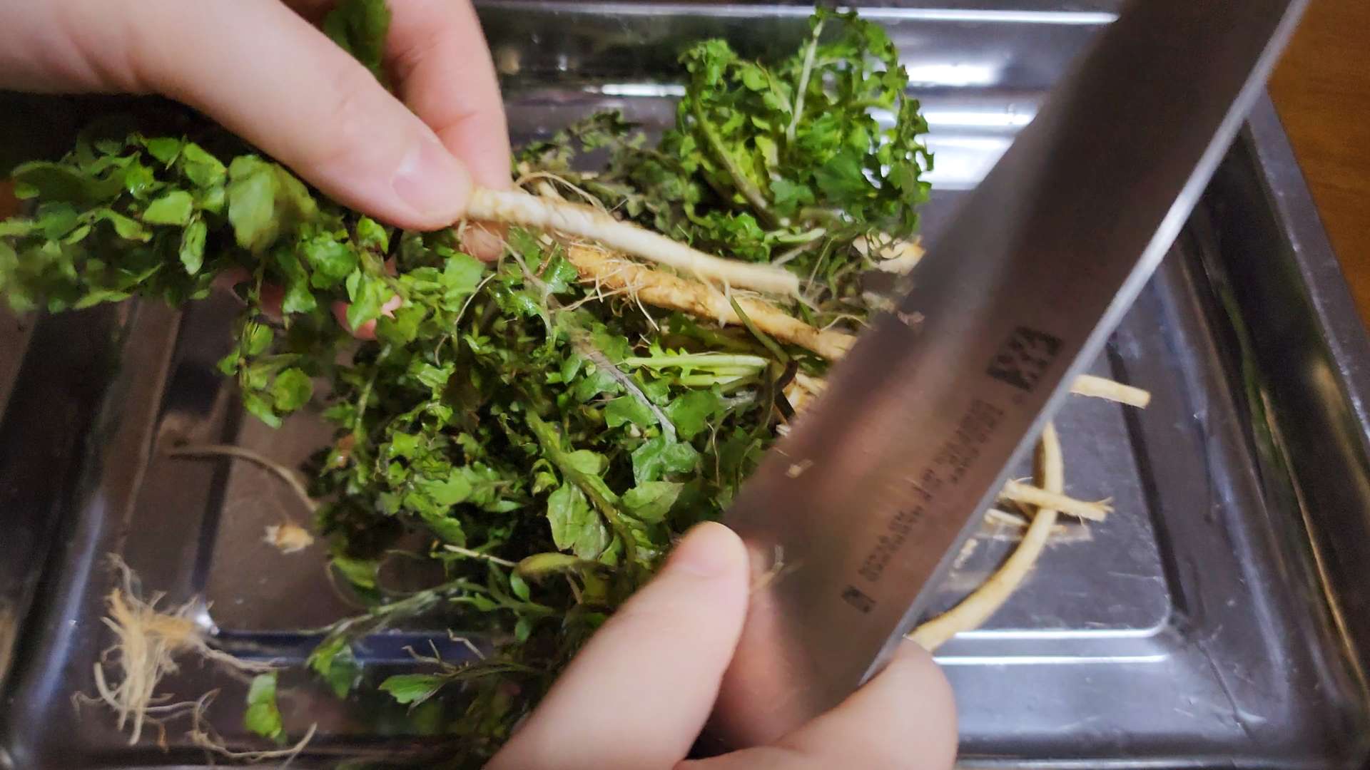 냉이는 흙을 털어내고 뿌리와 잎 사이를 칼로