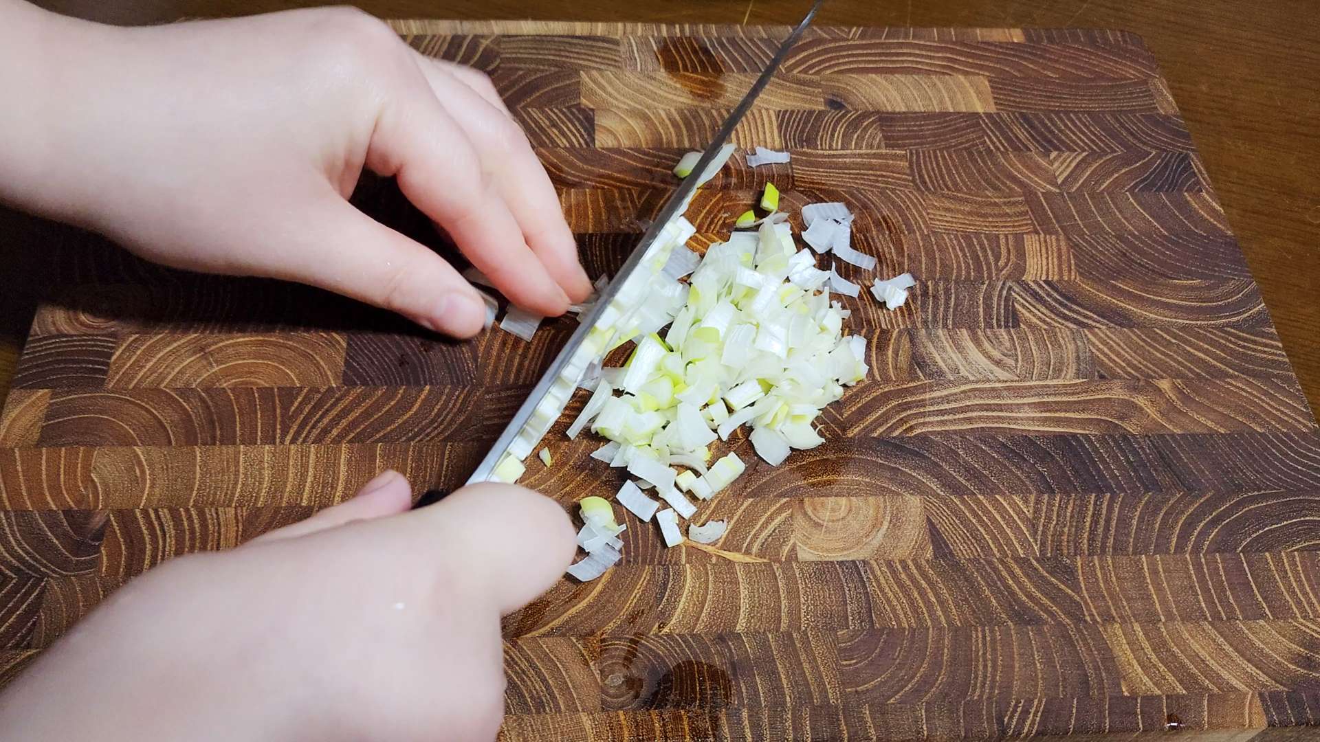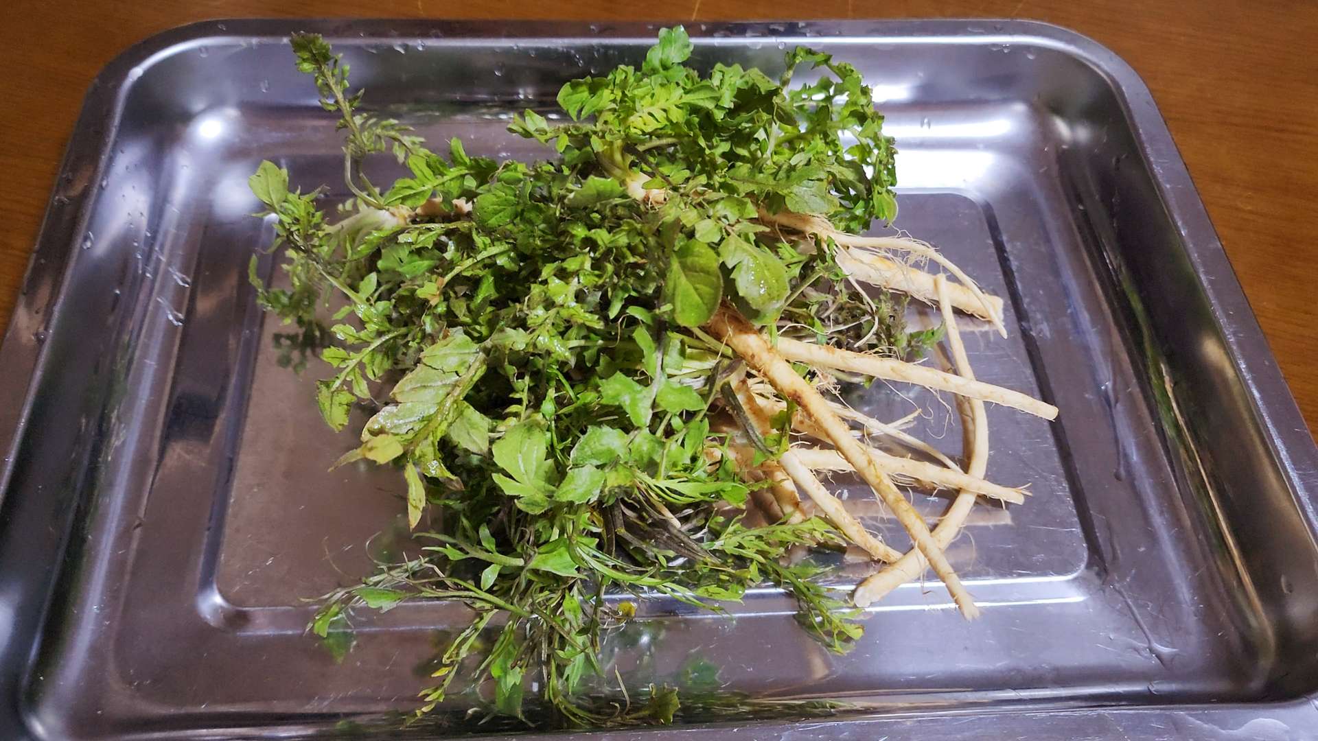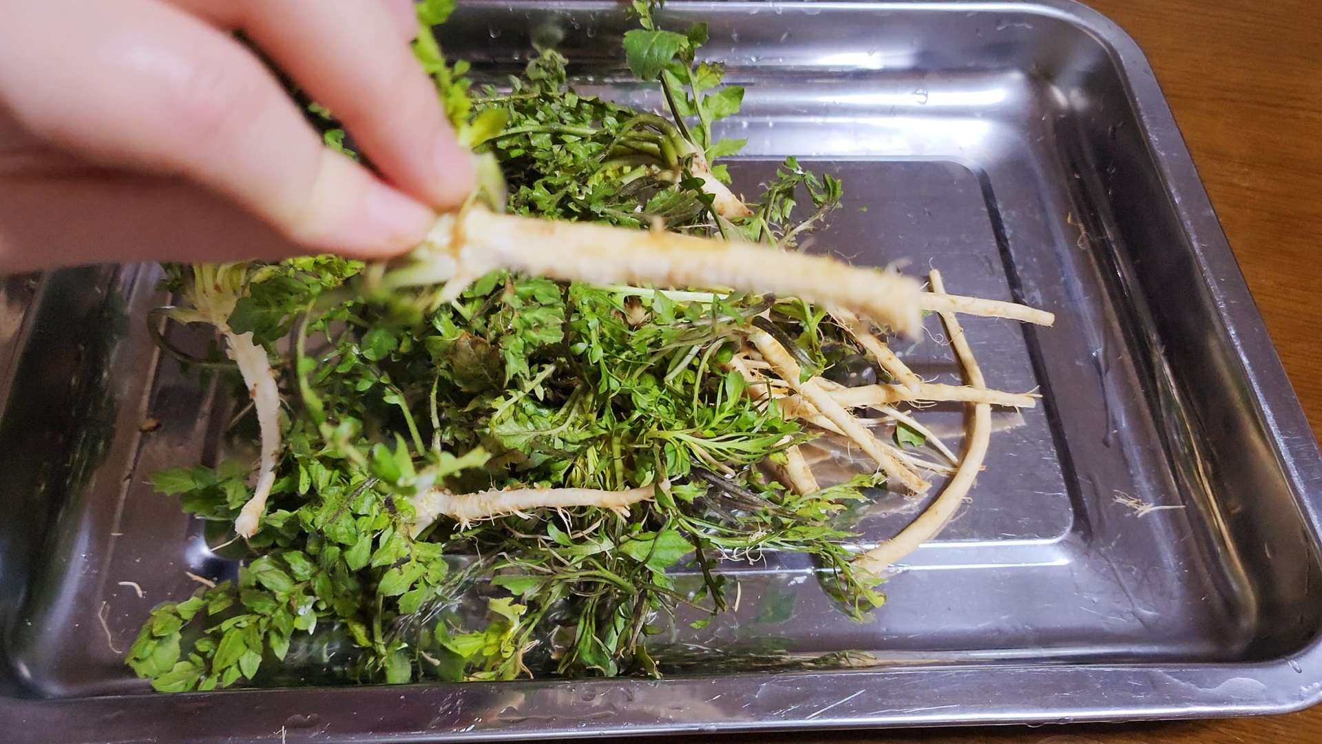 냉이는 흙을 털어내고 뿌리와 잎 사이를 칼로