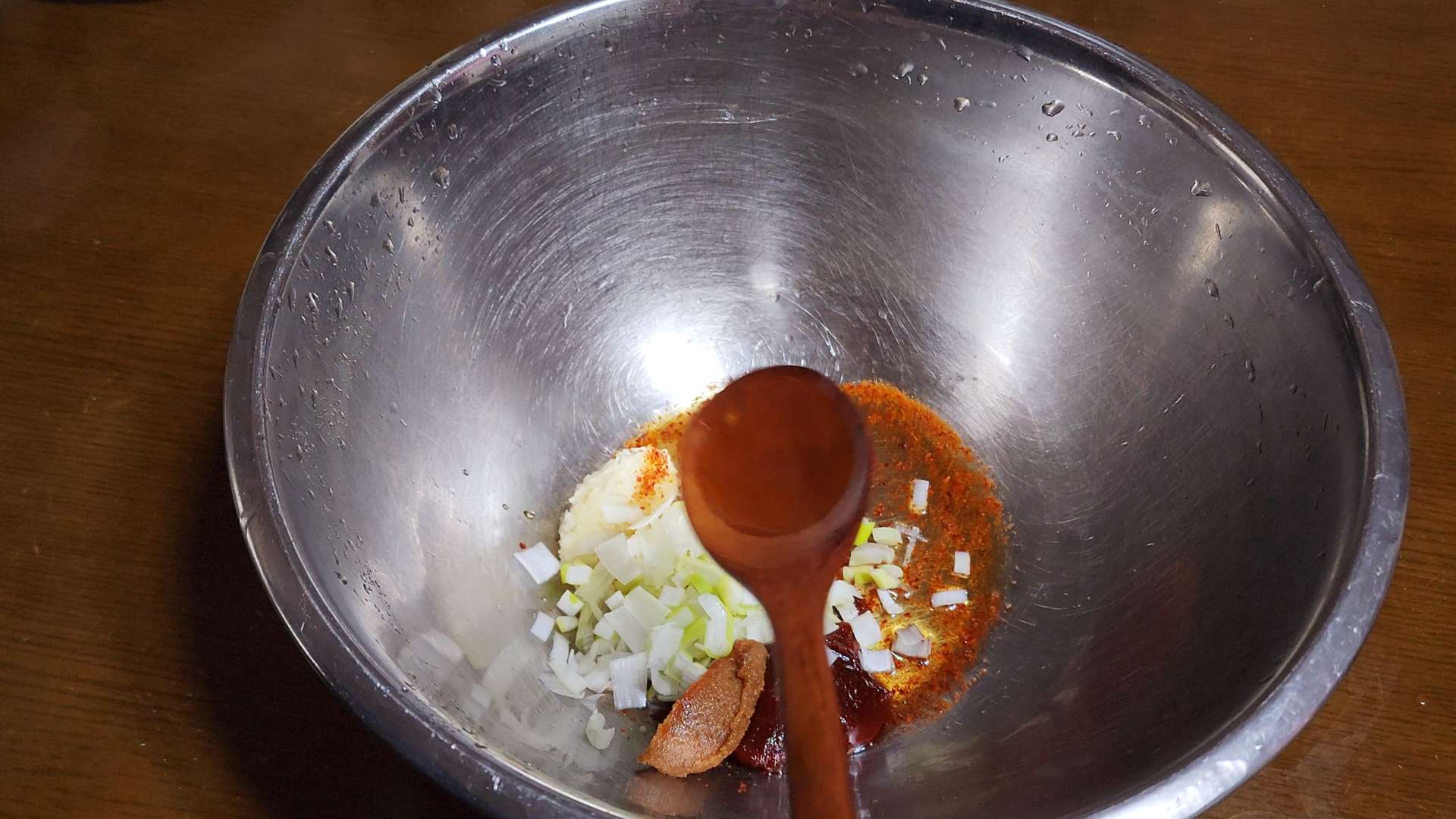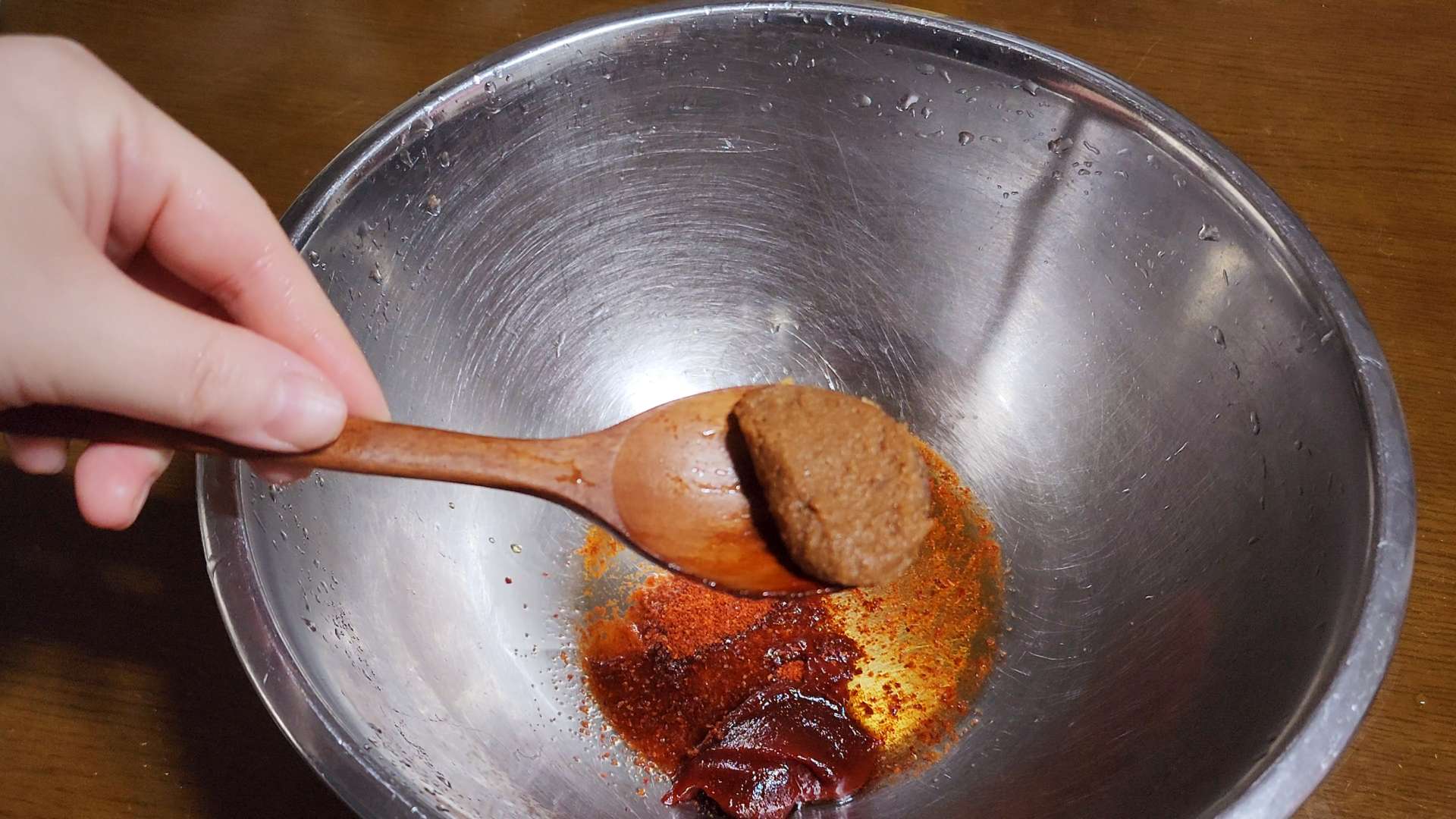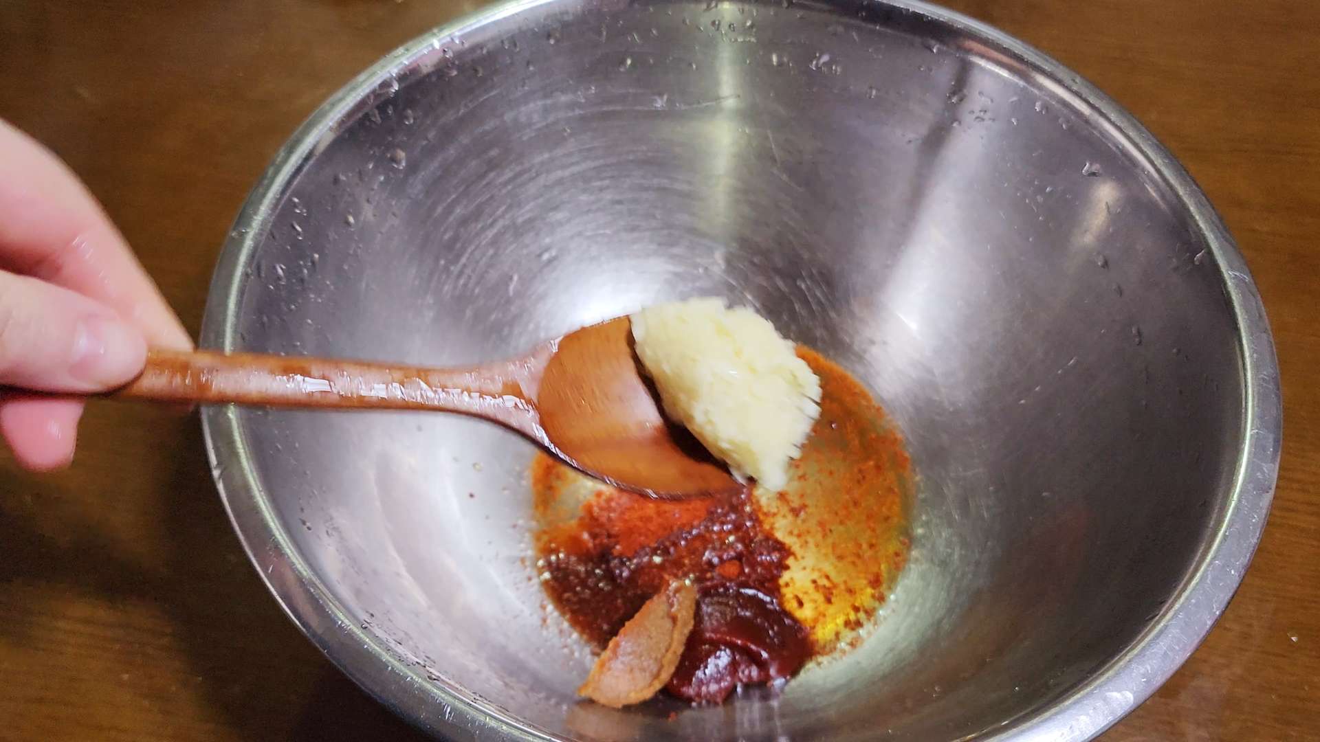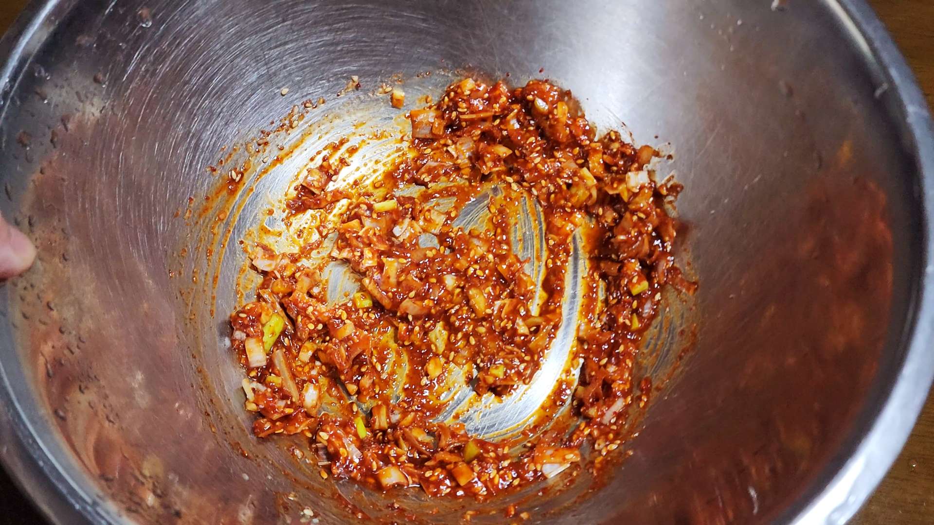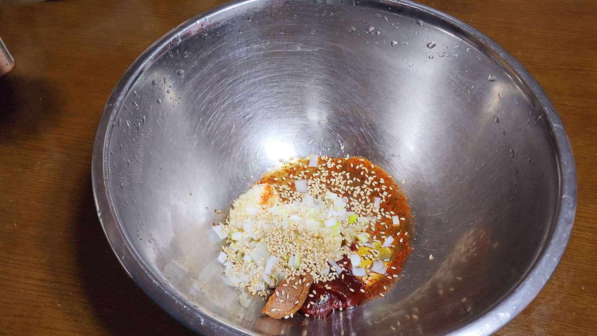 양념: 고춧가루 0.5T, 매실액 2T, 고추장 2T,
