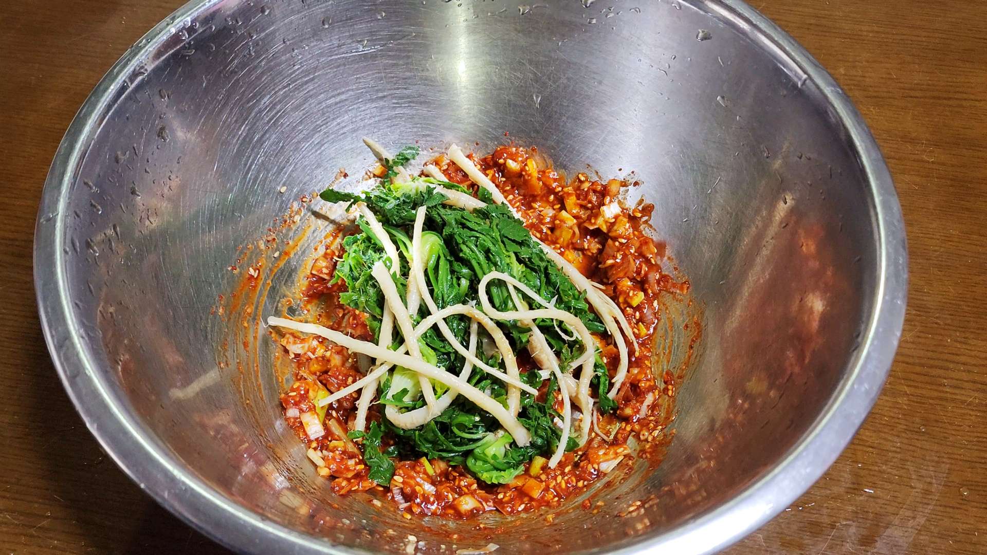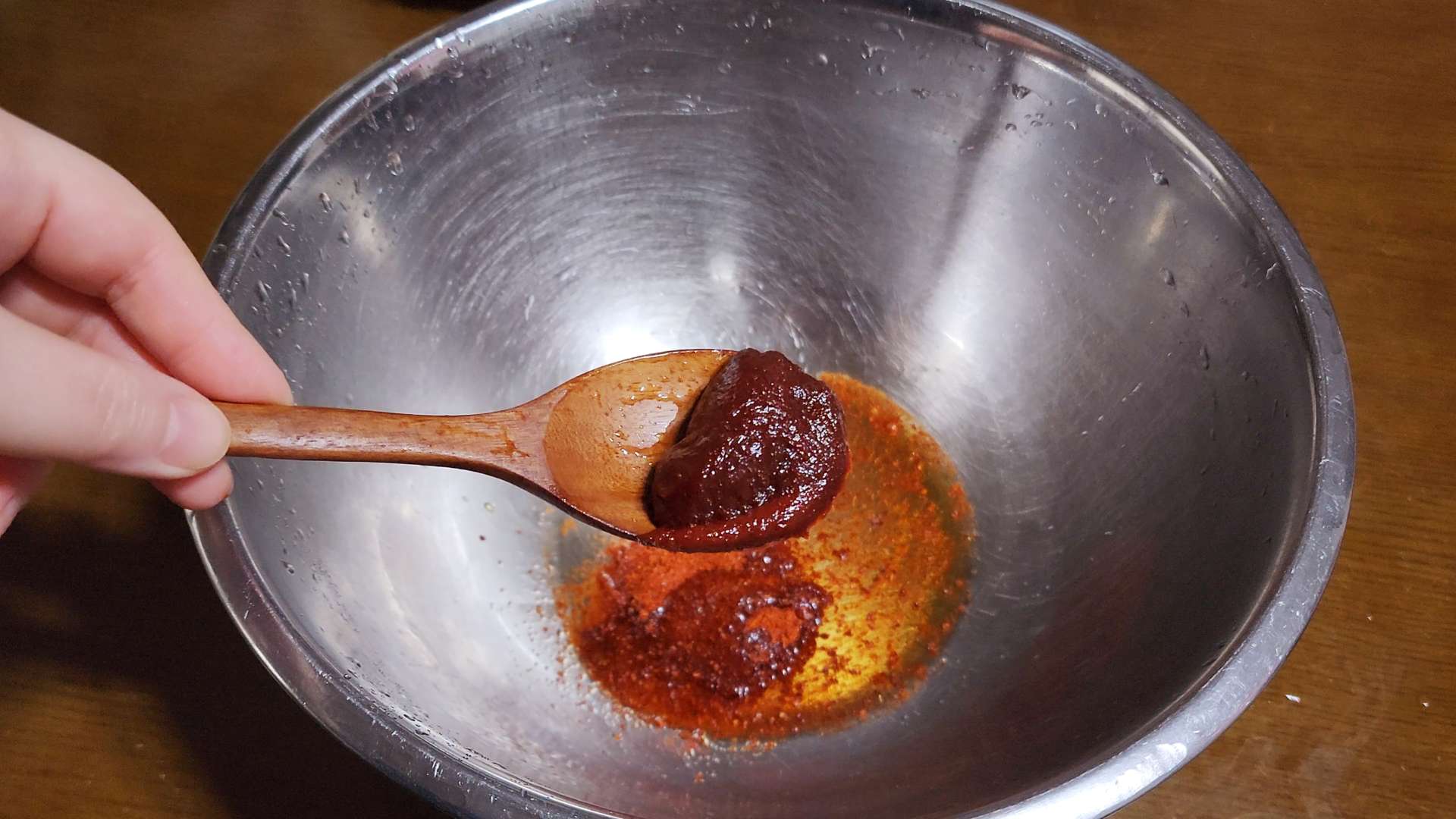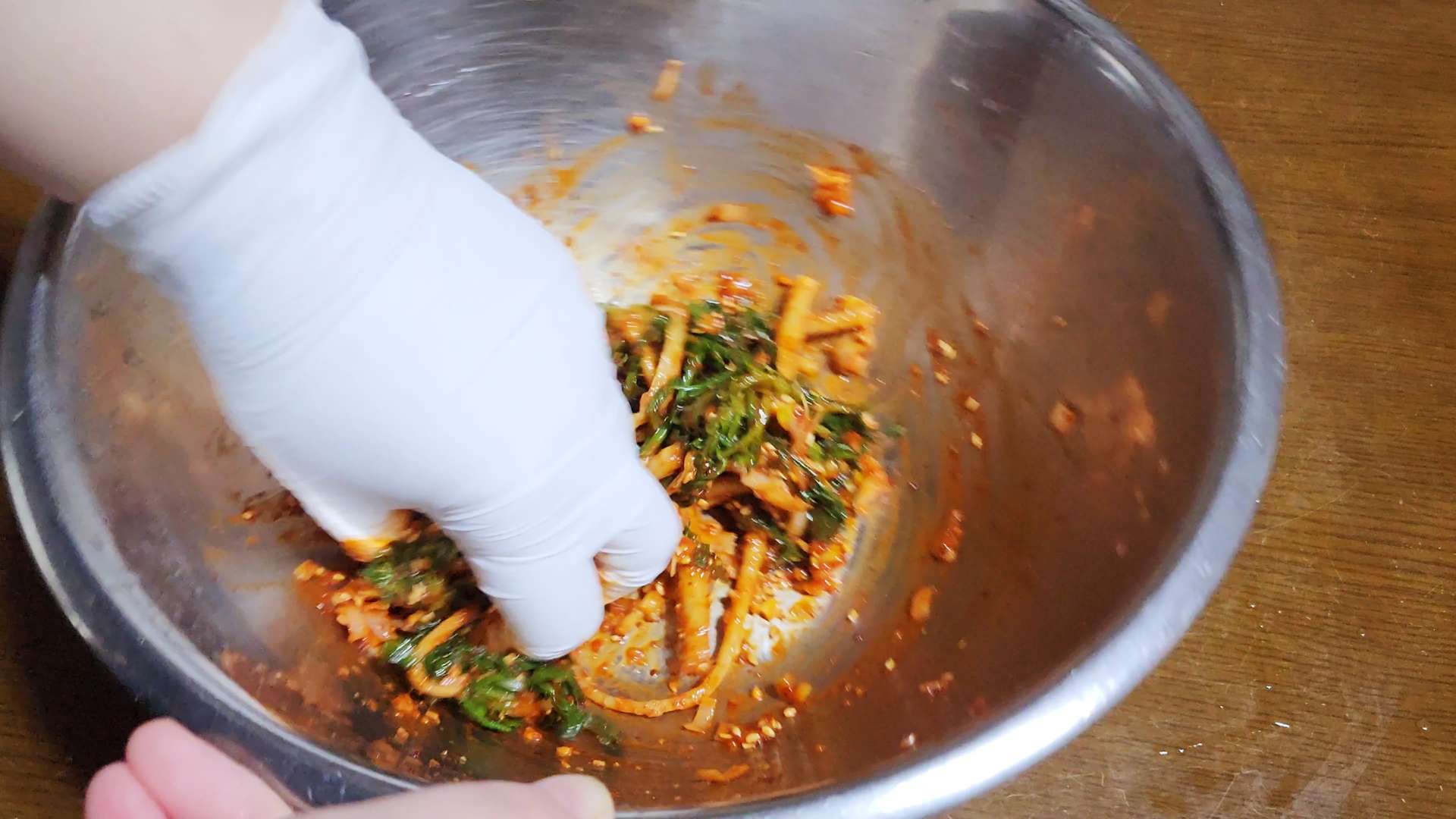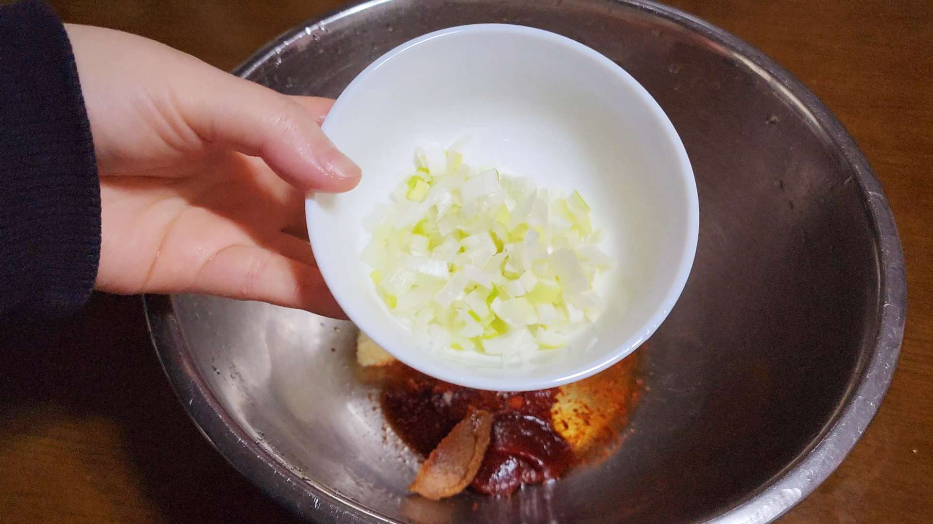 양념: 고춧가루 0.5T, 매실액 2T, 고추장 2T,