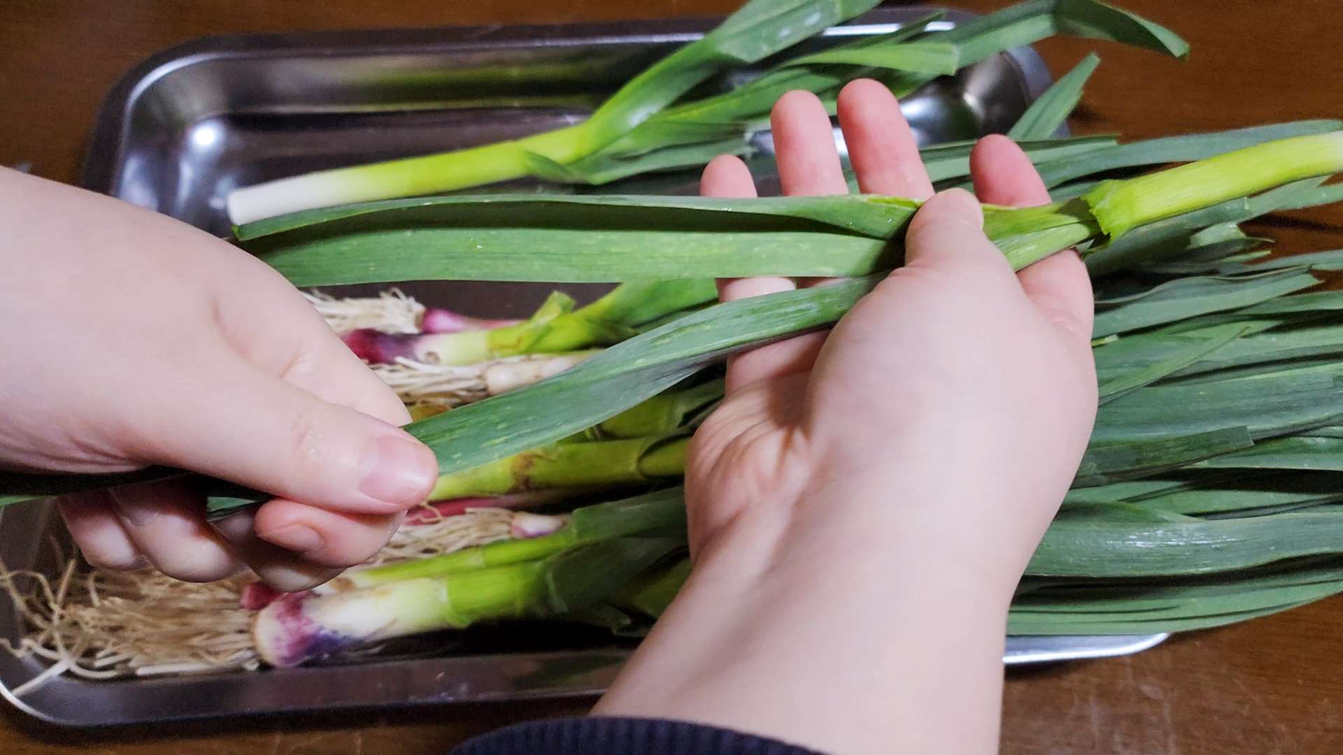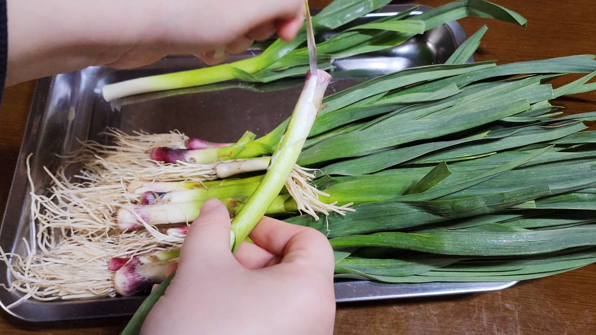 풋마늘은 뿌리를 자르고 손질해 줍니다.