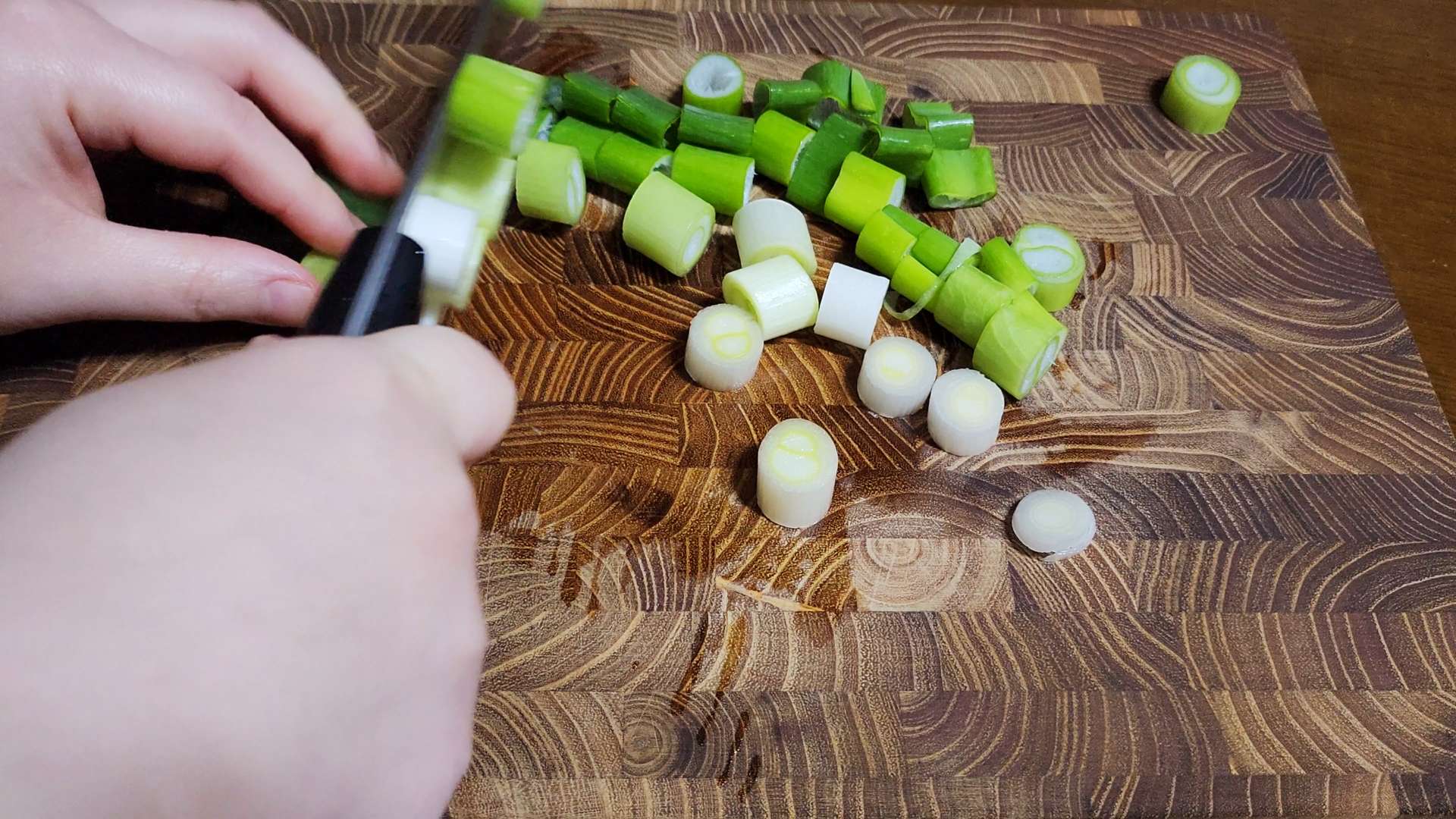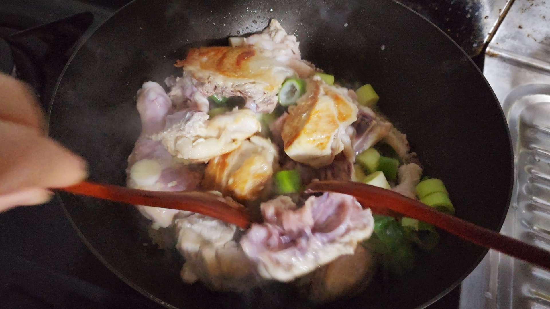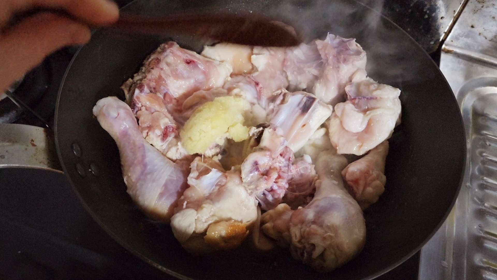 닭에서 기름이 나오면 다진마늘 1T, 대파를 넣고 볶아줍니다.