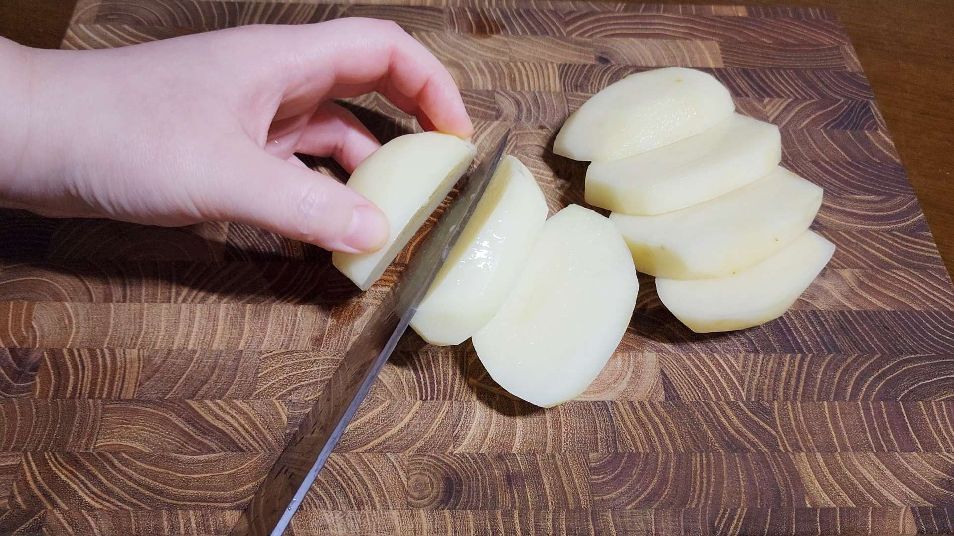 감자는 껍질을 벗기고 1cm 두께로 썰어줍니다.