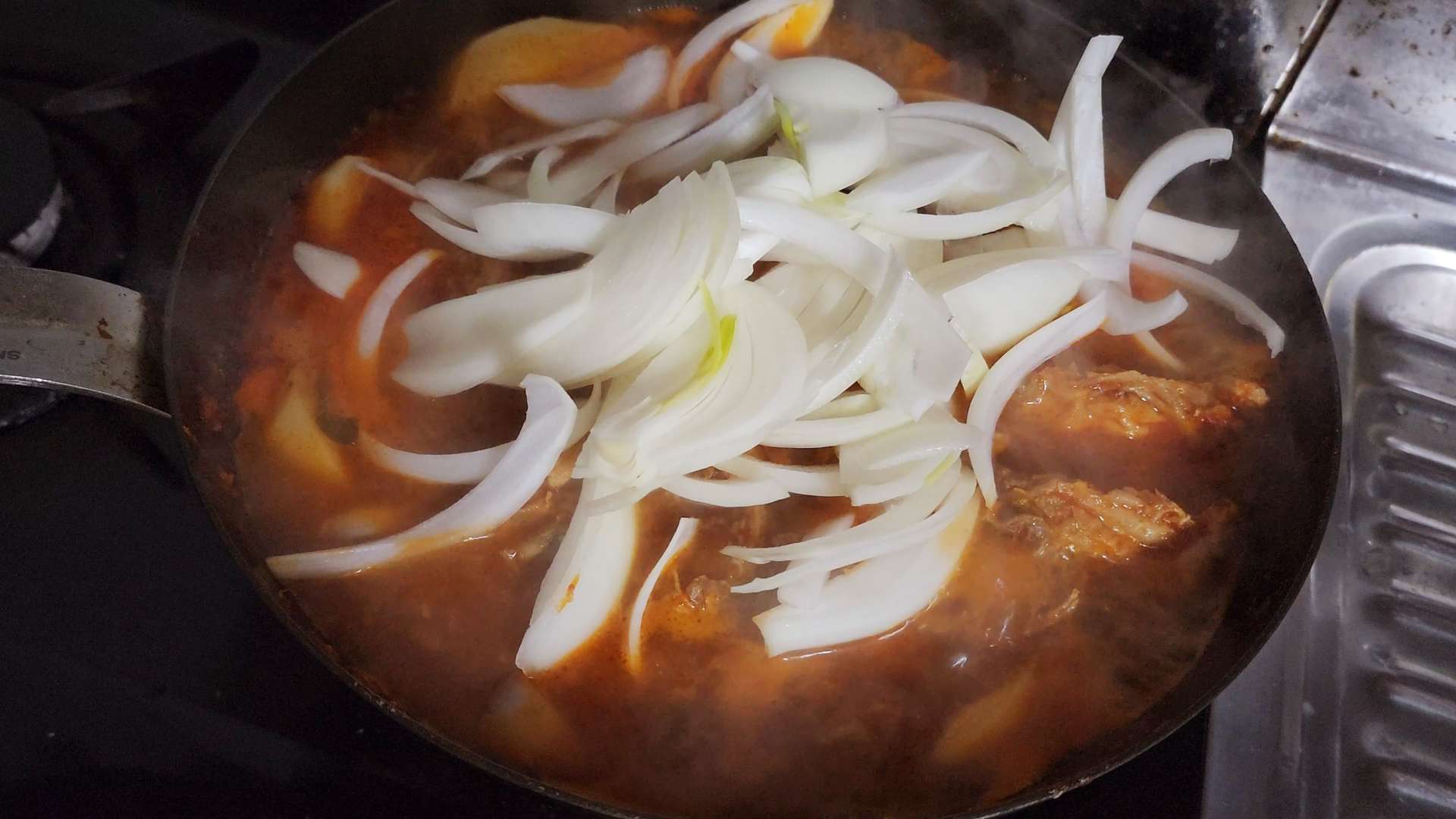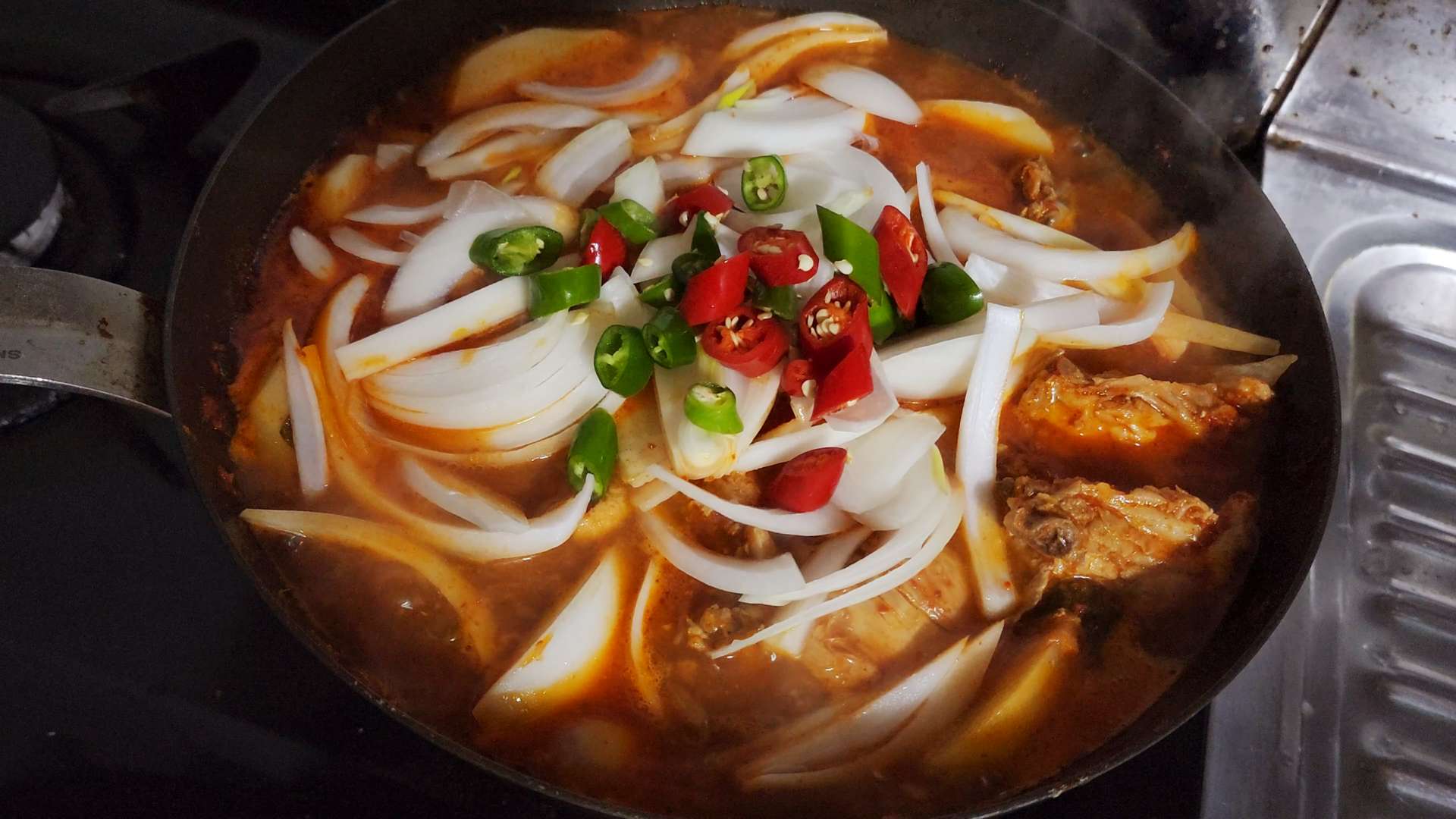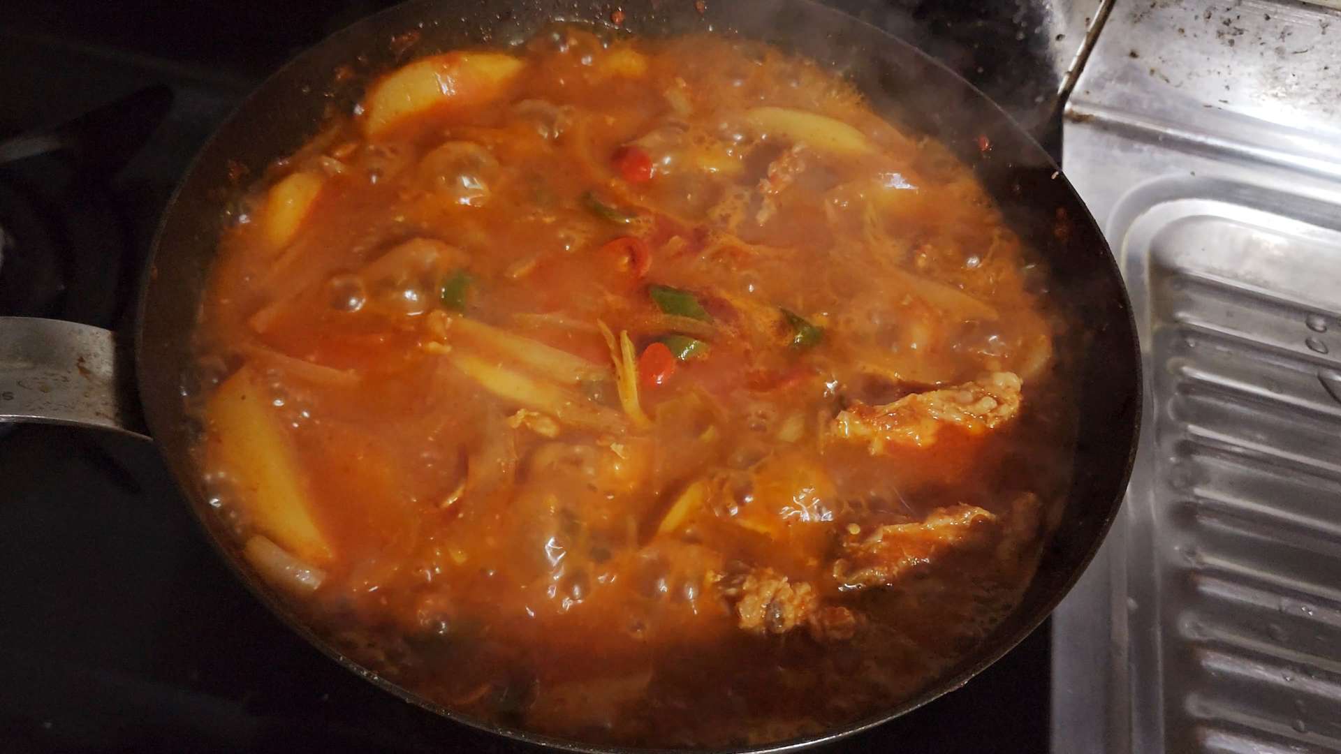 감자, 양파, 청양고추, 홍고추 넣고 뚜껑 닫고 중불에서 15분 끓여줍니다.
