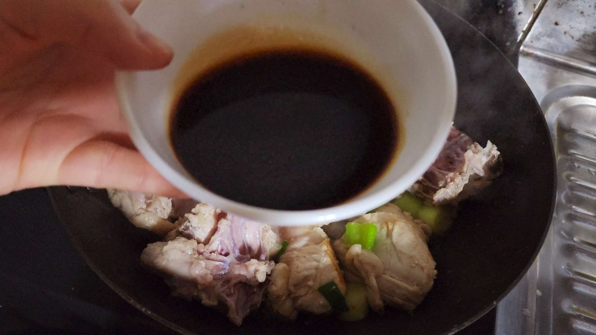 닭에서 기름이 나오면 다진마늘 1T, 대파를 넣고 볶아줍니다.
