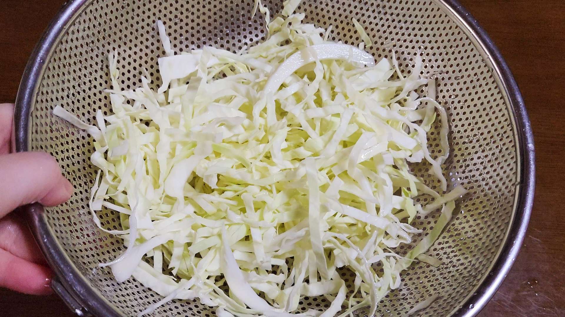 양배추는 채썰고 씻은 뒤 체반에 밭쳐 물기를 제거해줍니다.