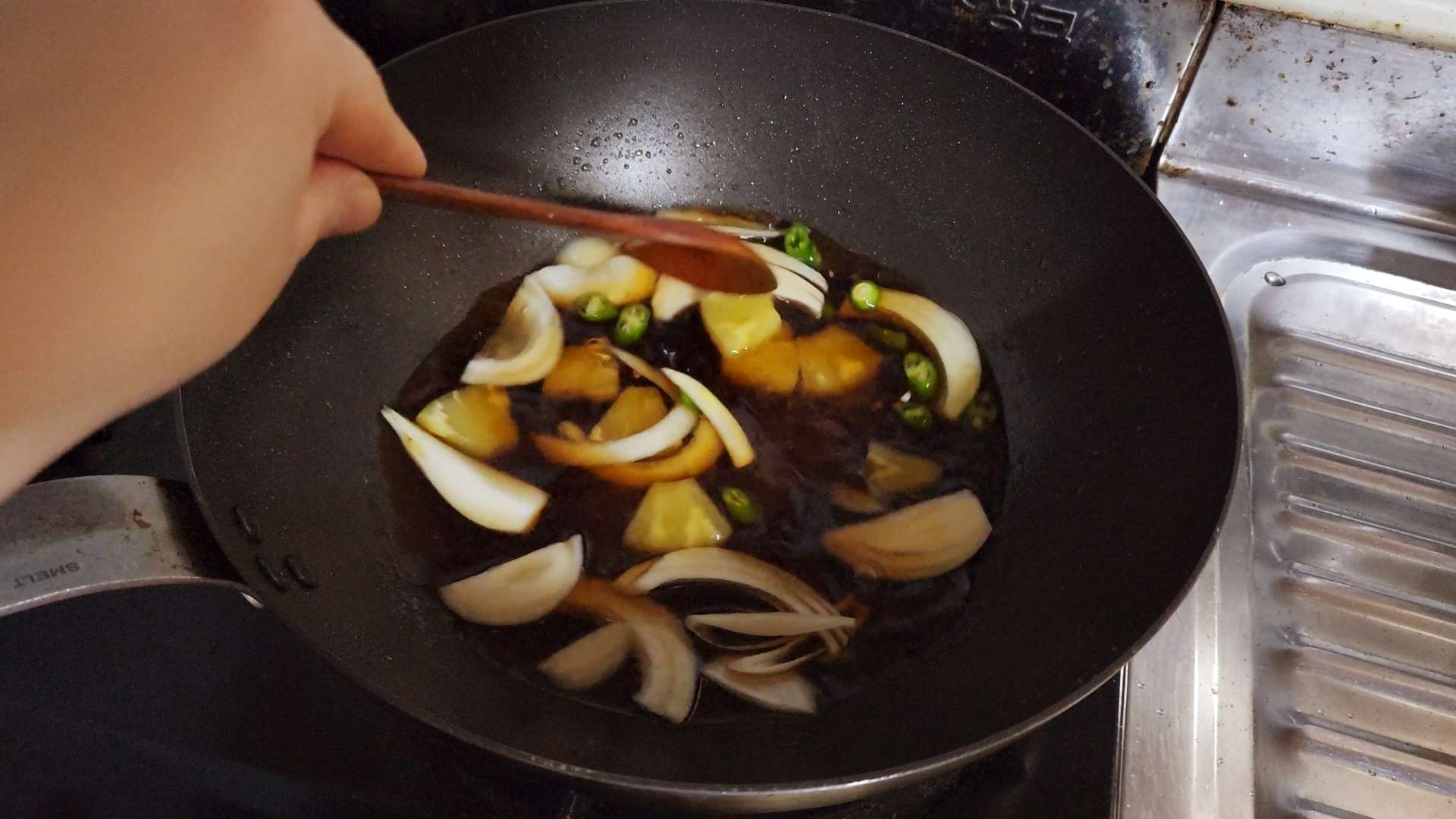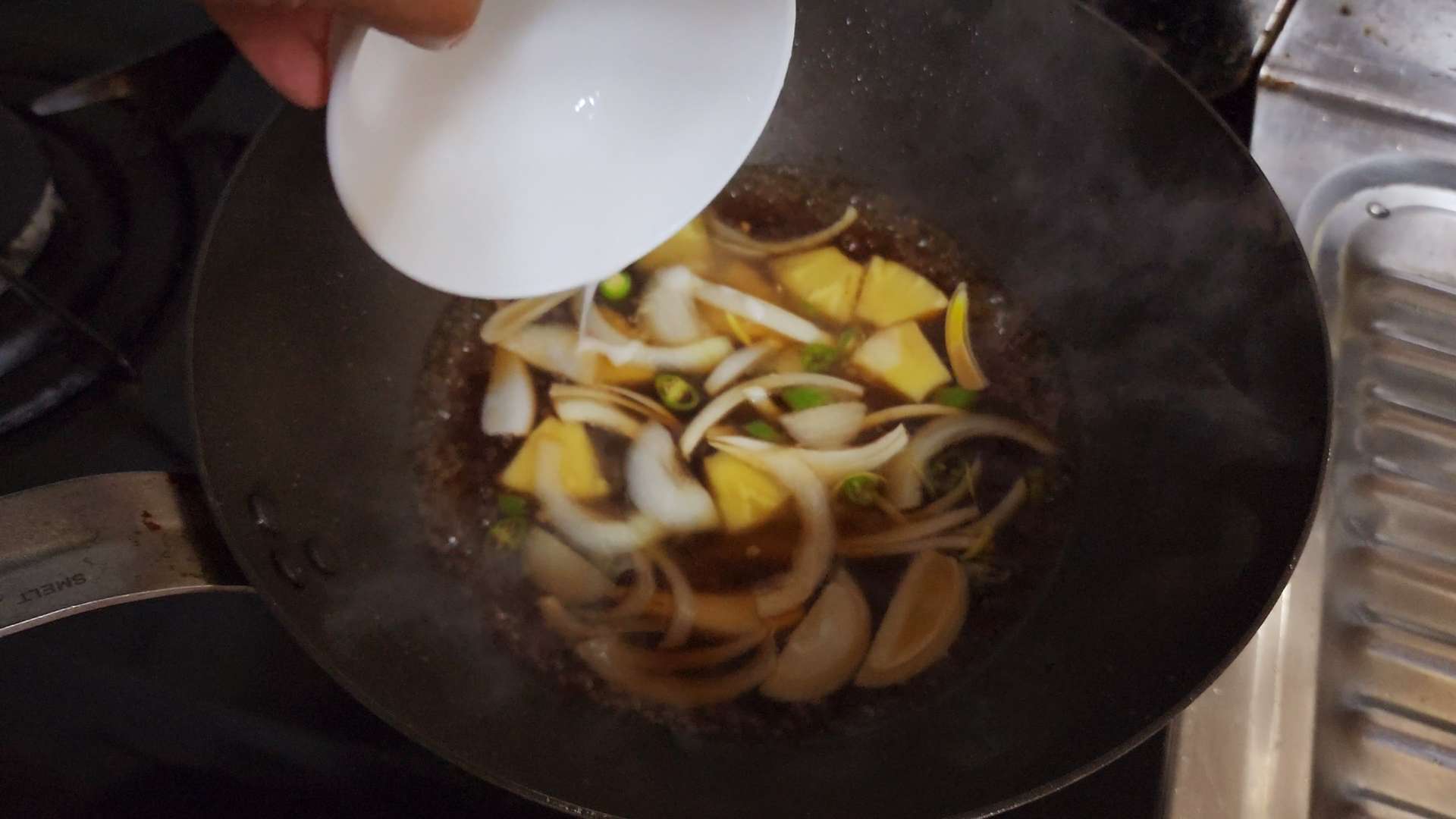 탕수육 소스, 채썬 양파, 송송 썬 청양고추, 파인애플를 넣고 끓여줍니다.