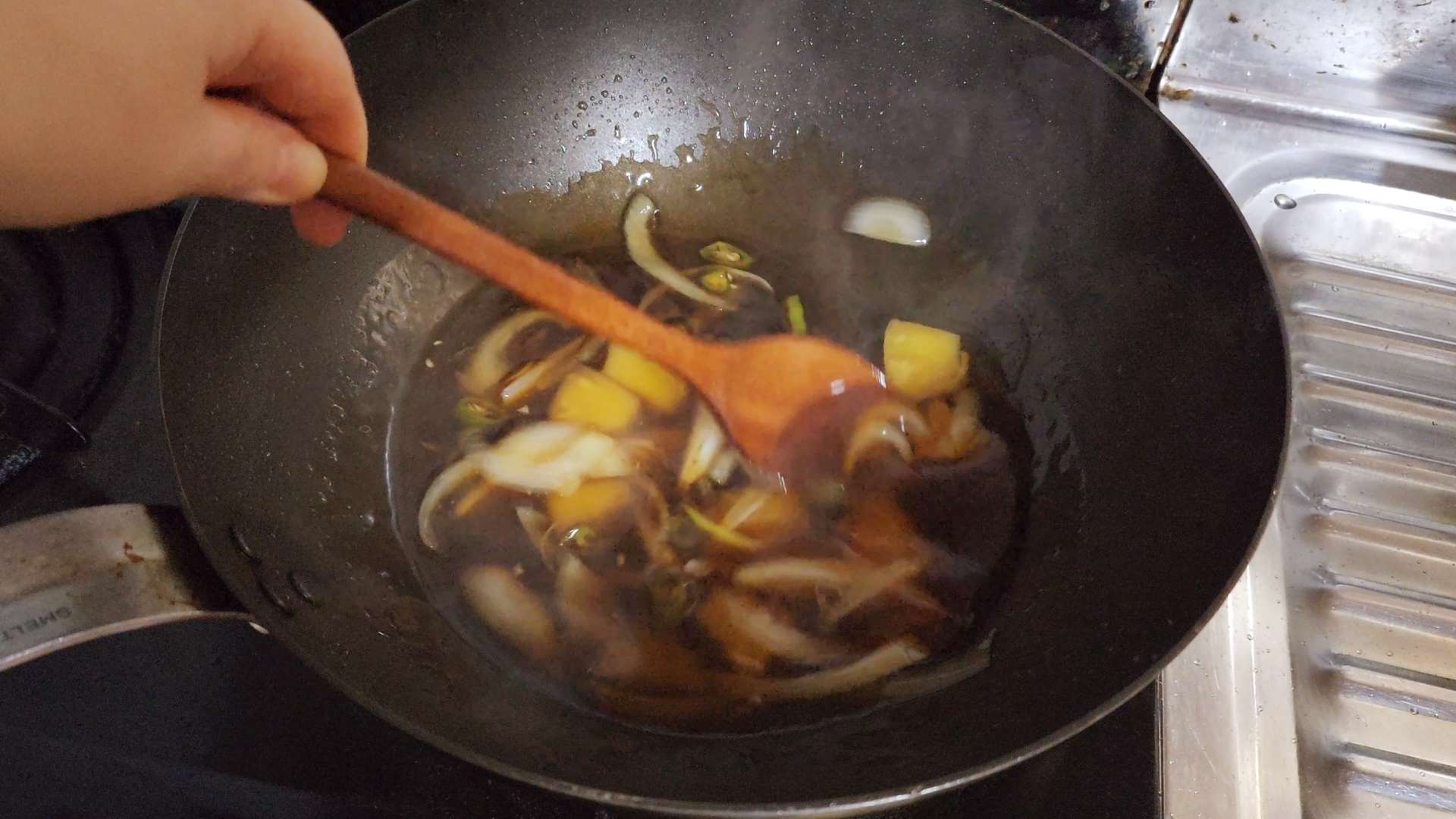 양파가 투명해지면 전분물을 조금씩 넣고 저어가며 농도를 맞춰줍니다.