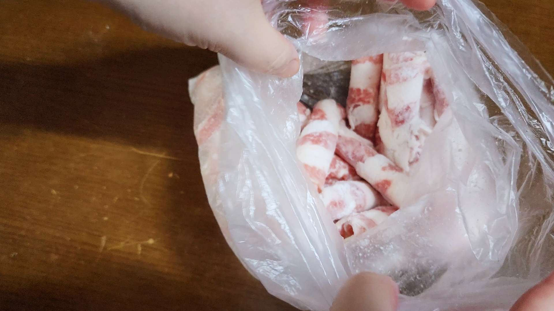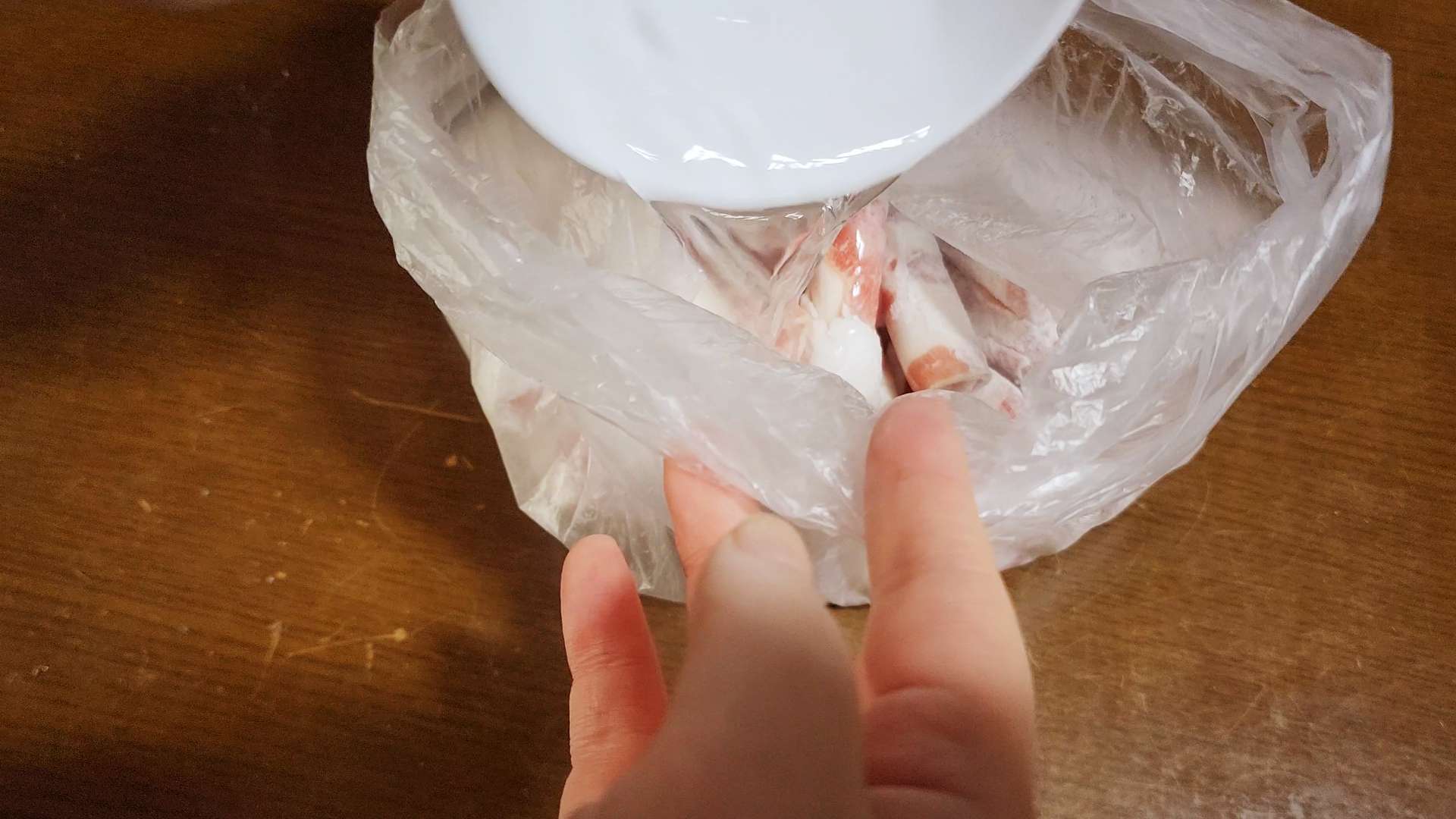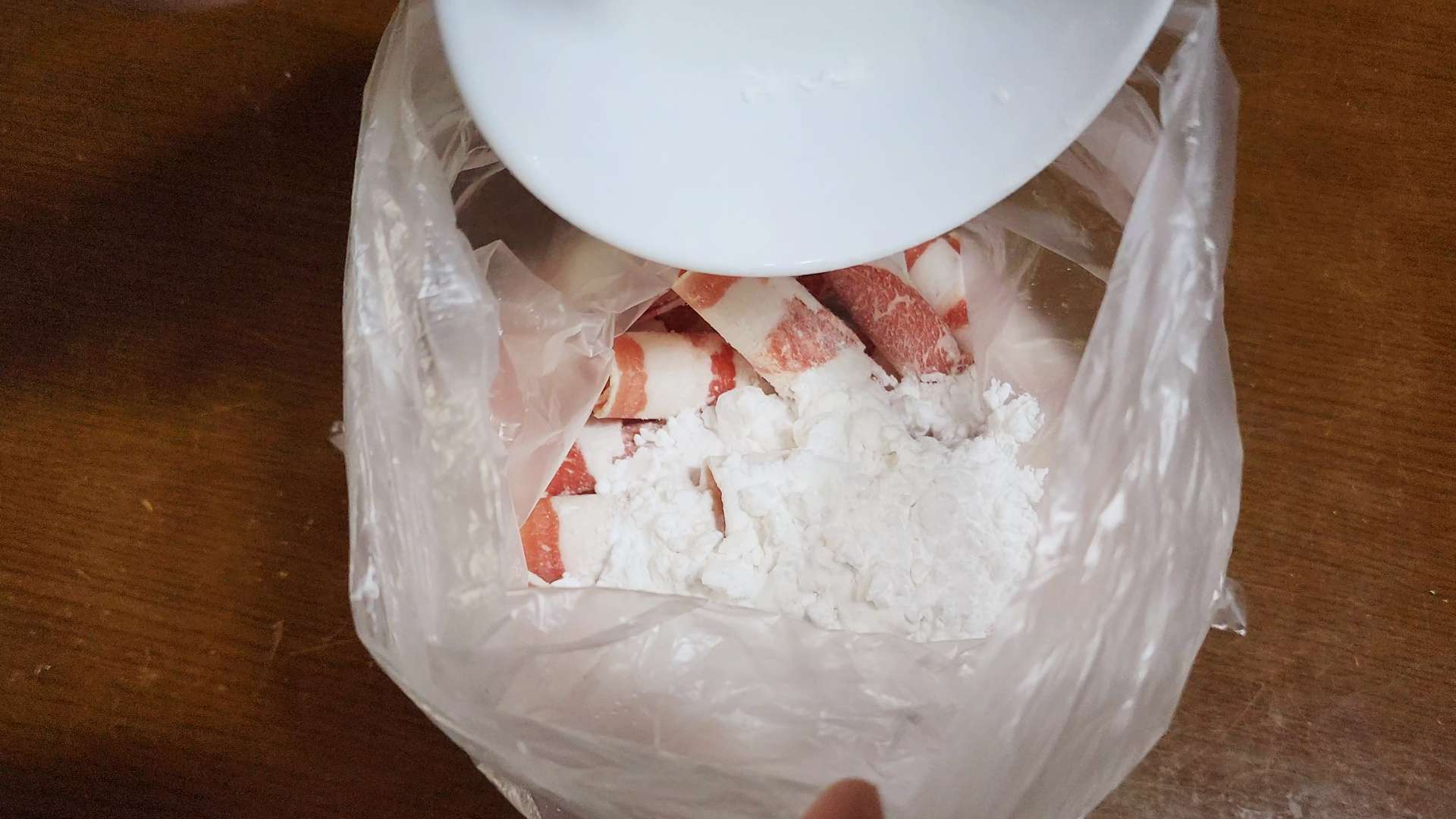 위생 비닐에 우삼겹 500g, 전분가루 200g 소금 한 꼬집을 넣고 흔들어 섞어줍니다.