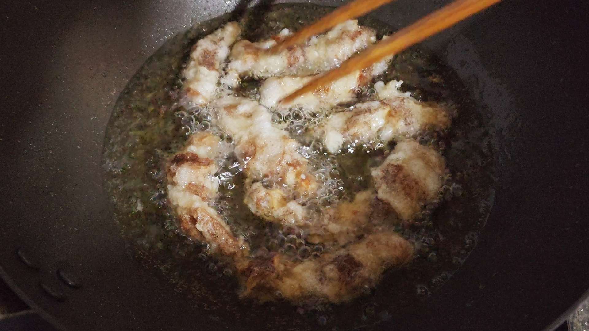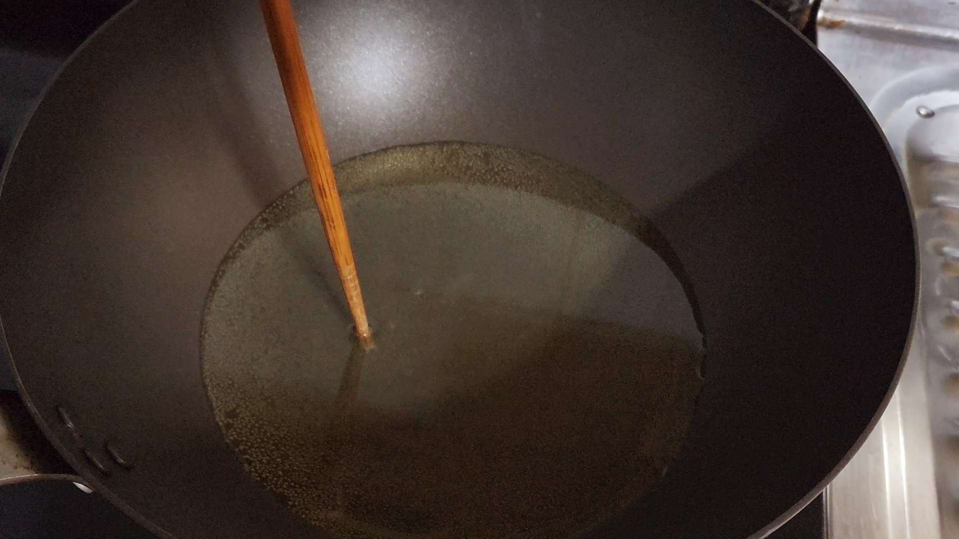 나무젓가락을 넣었을 때 기포가 보글보글 올라오면 알맞은 온도입니다.