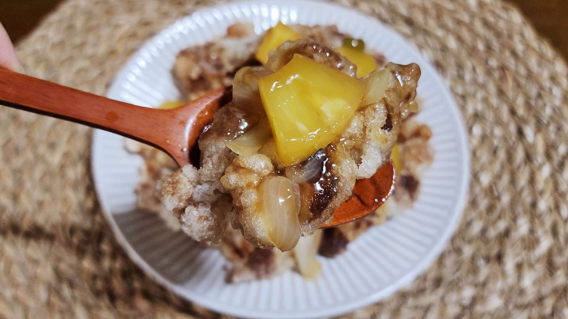 그릇에 고기튀김을 담고 소스를 올려줍니다.