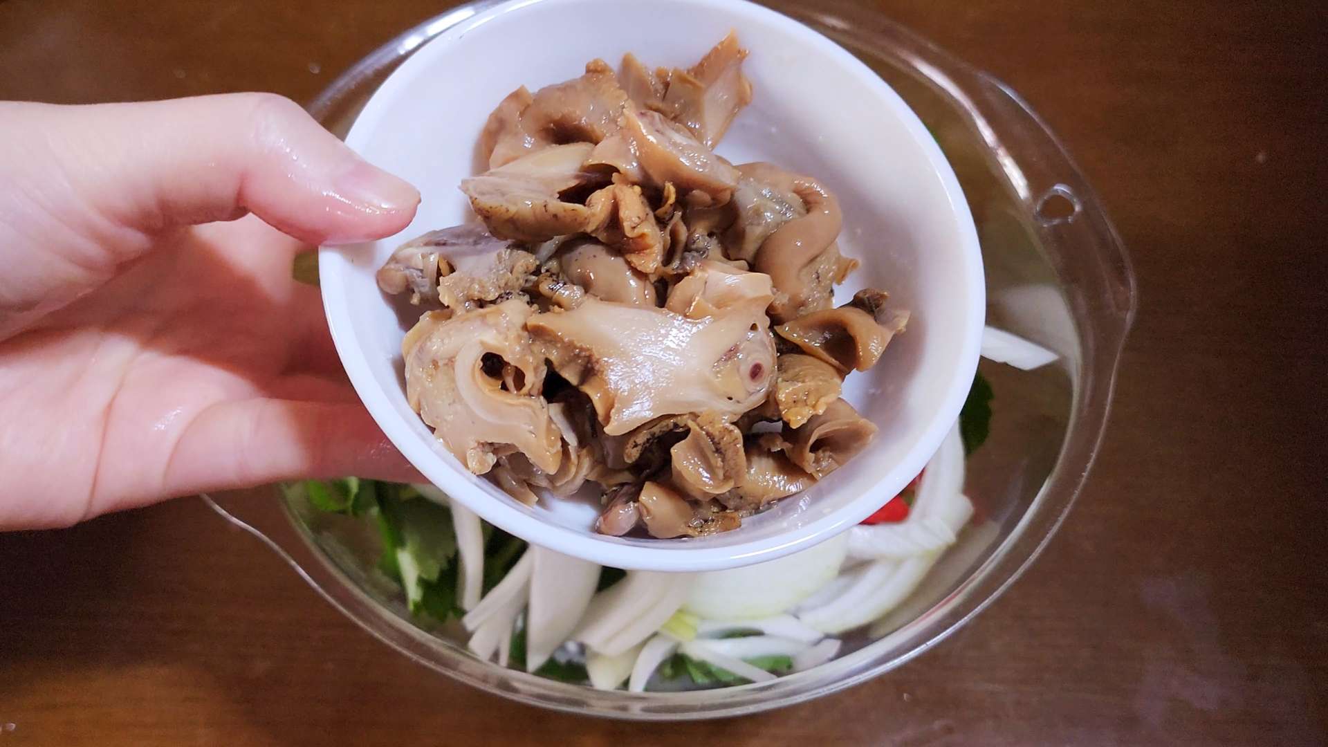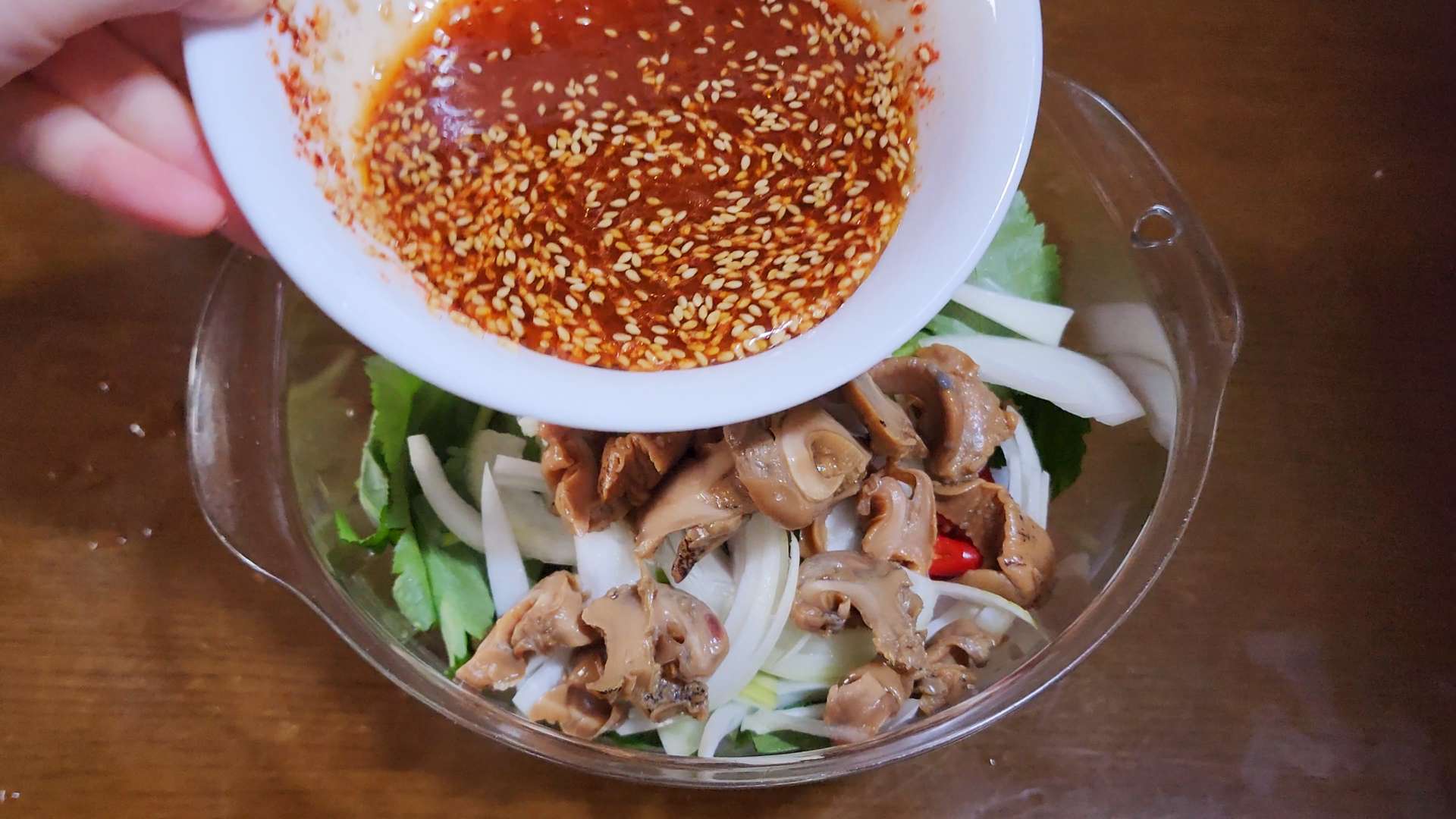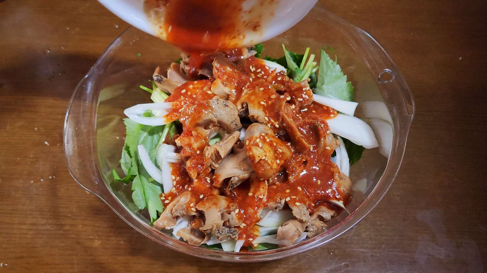 양념: 골뱅이 국물, 고춧가루 1T, 식초 1T, 진간장 1T, 다진마늘 0.5T, 올리고당 1T, 참기름 1T, 통깨