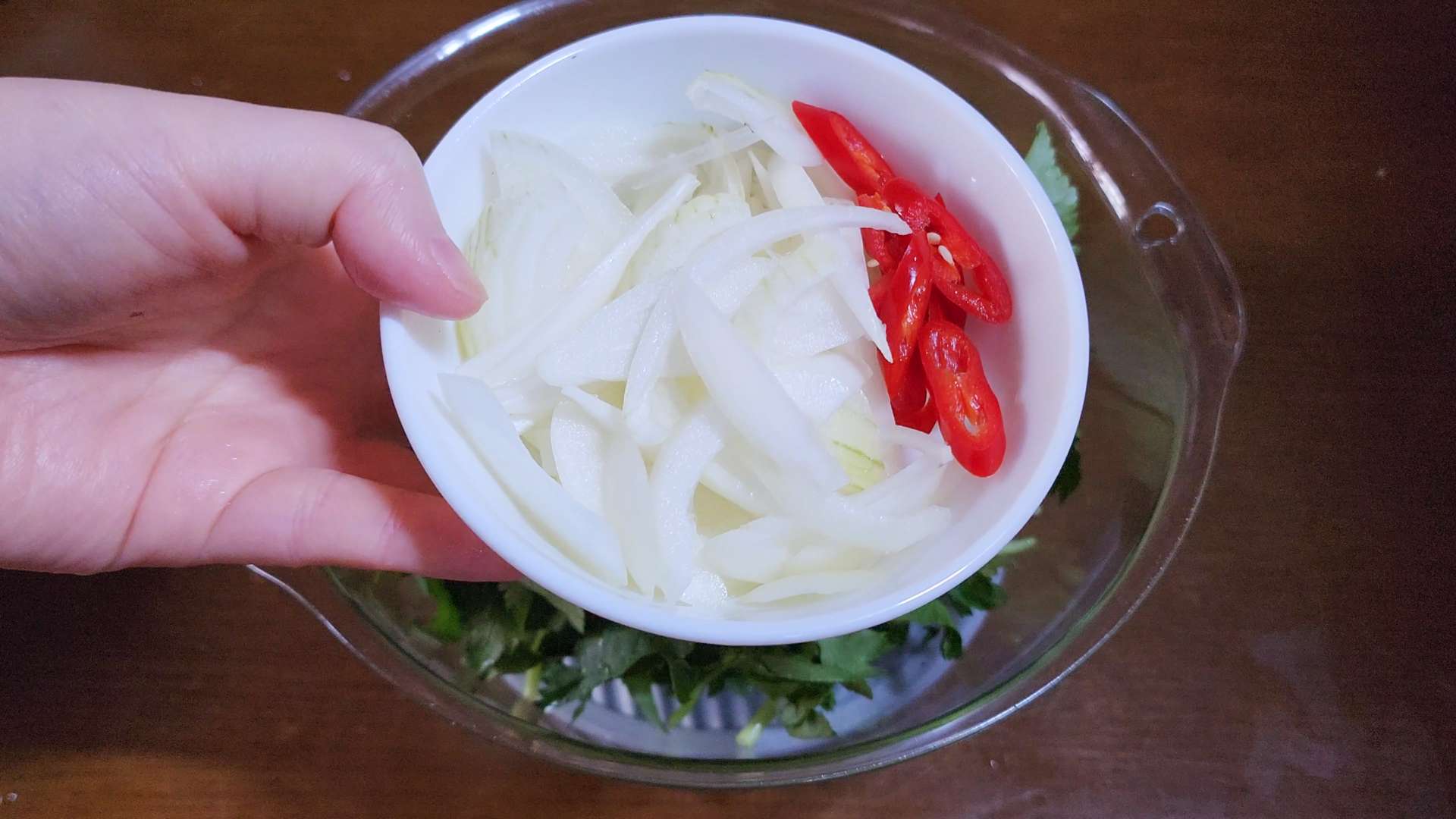 참나물 100g, 양파 1/2개, 홍고추 1/2개,