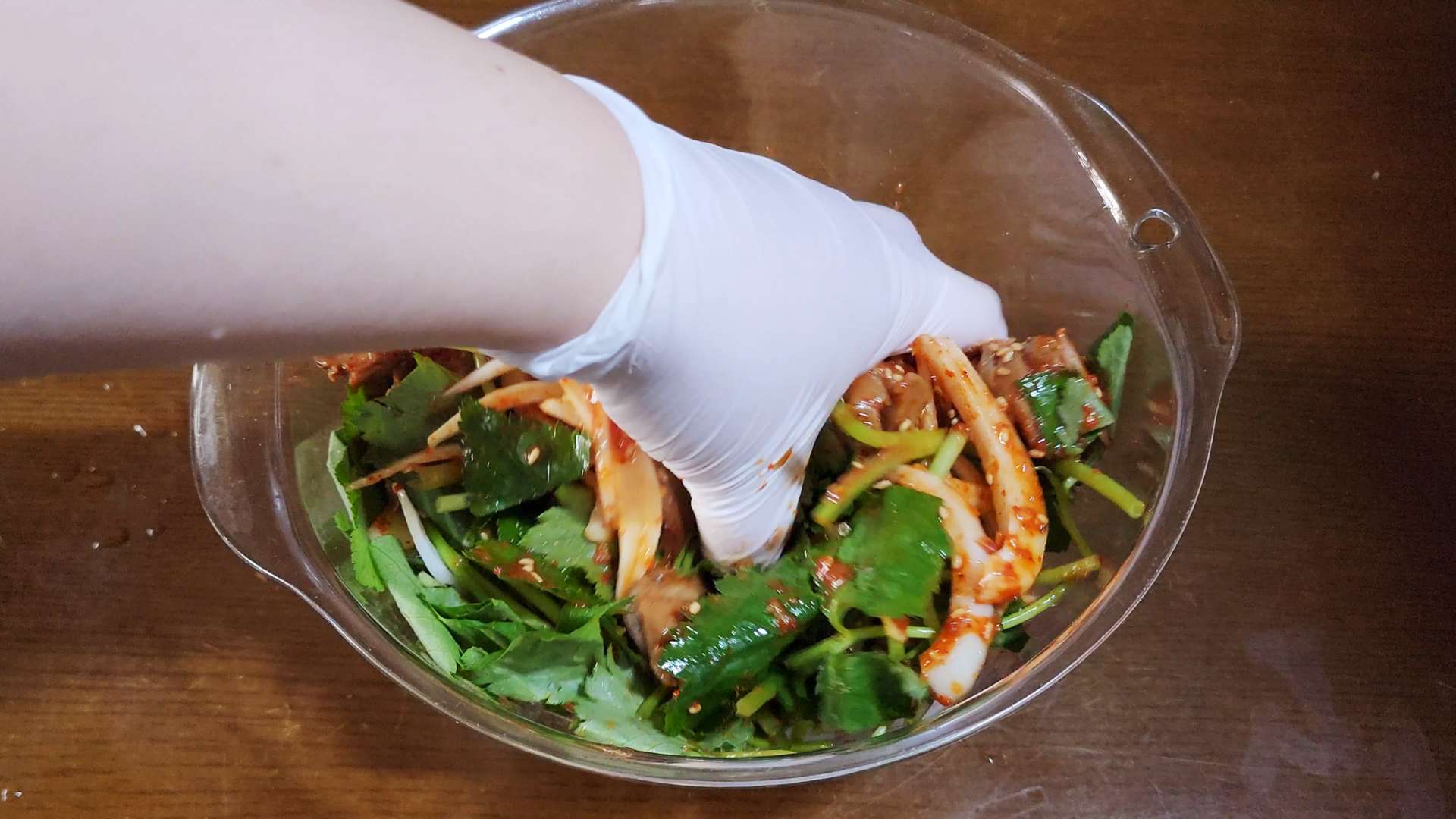 참나물, 양파, 홍고추, 골뱅이, 양념을 넣고 무쳐줍니다.
