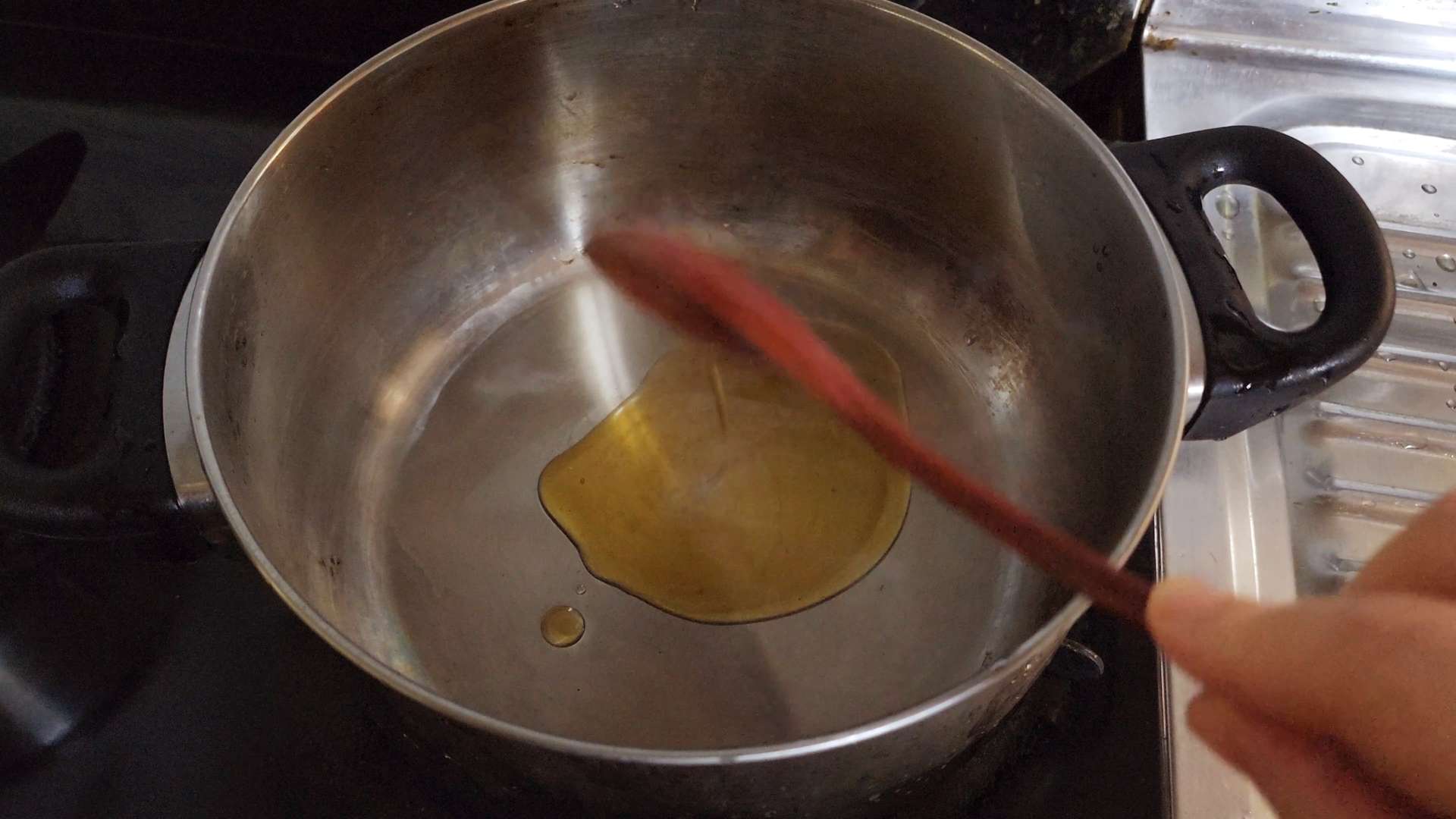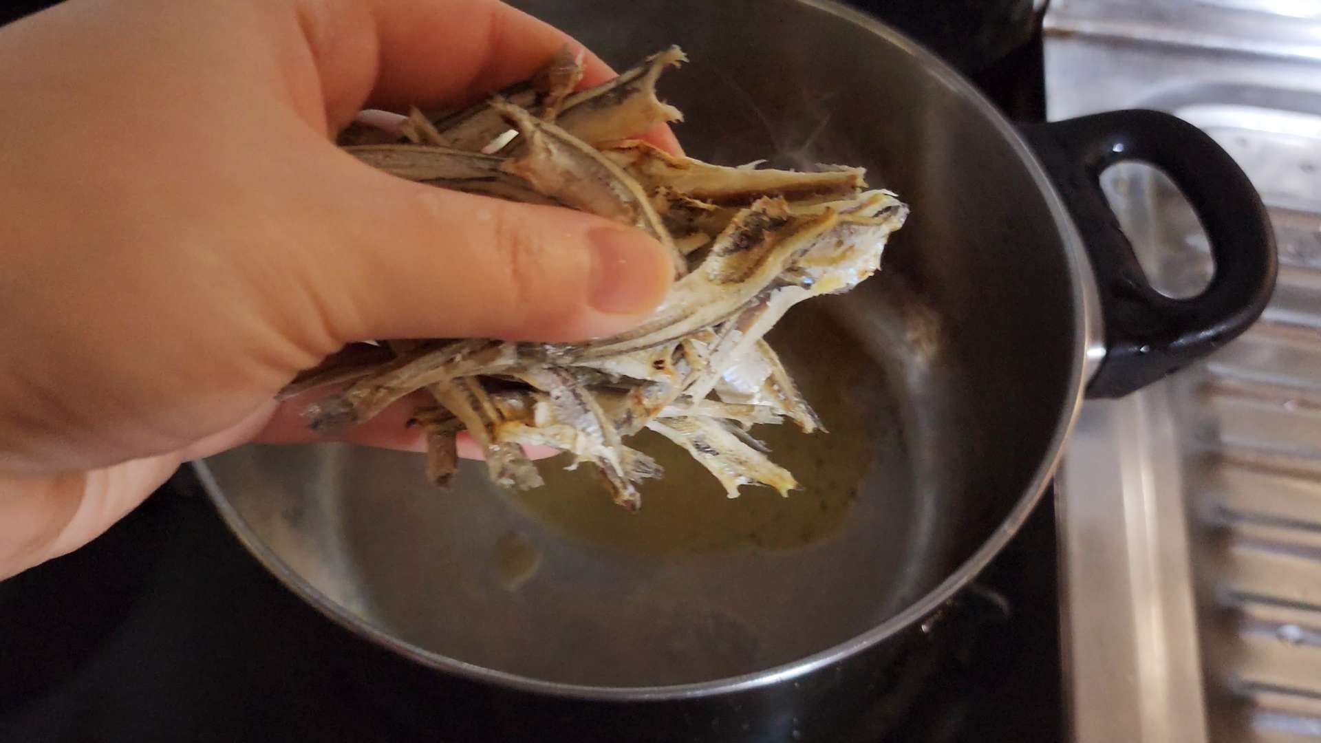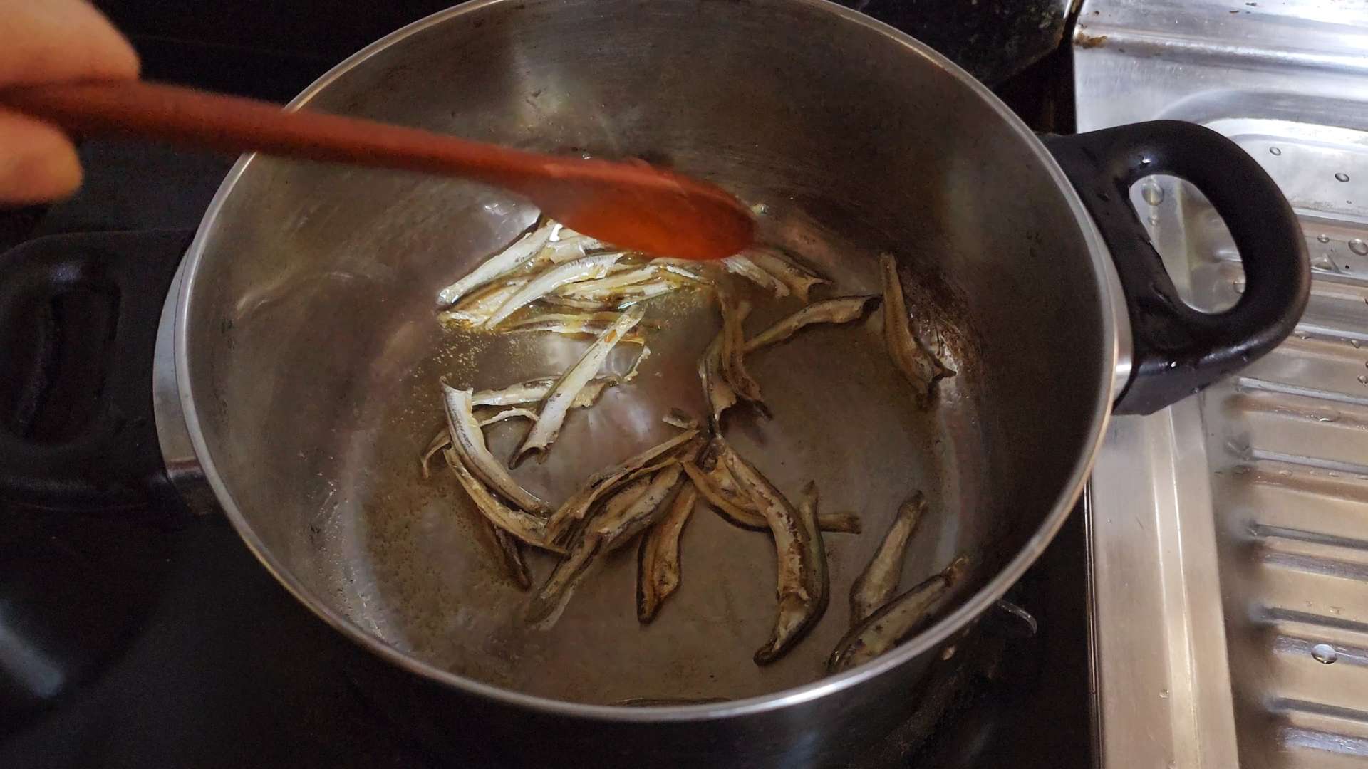 중불로 예열한 냄비에 들기름 2T, 국물용 멸치 1/2줌을