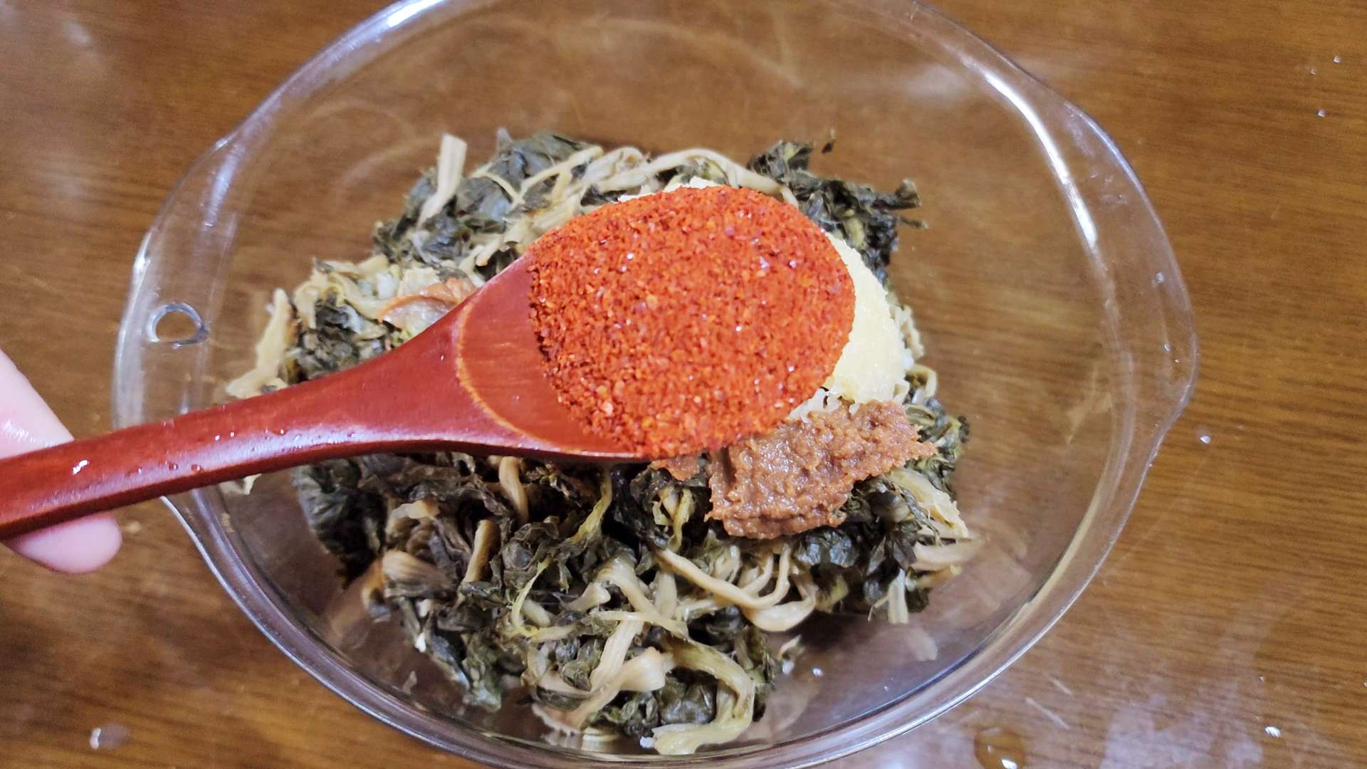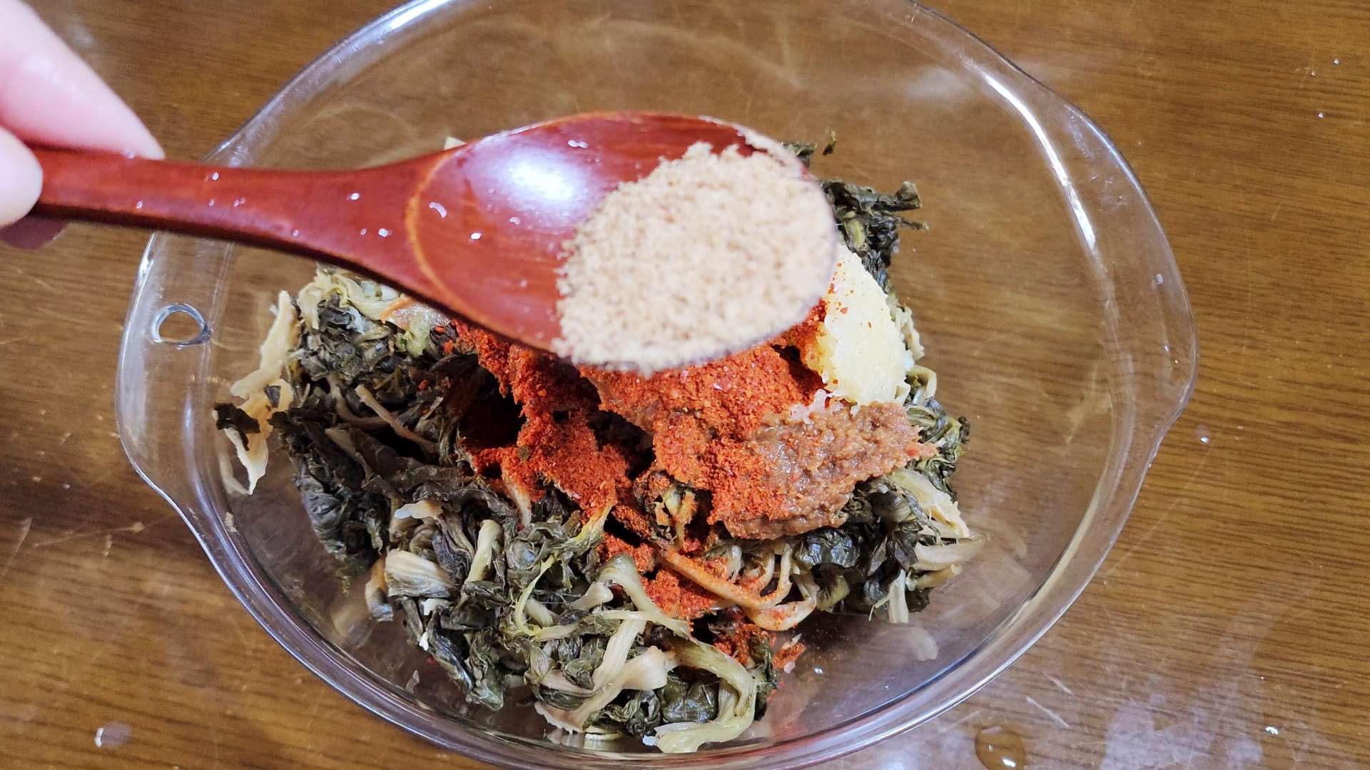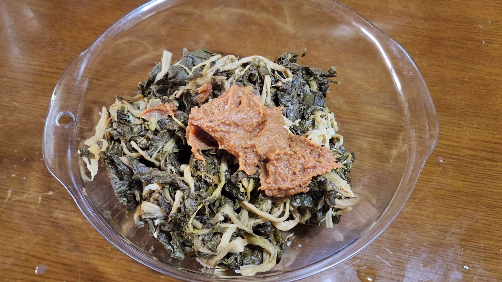 시래기, 된장 2T, 다진마늘 2T, 고춧가루 1T, 소고기 다시다 1T, 들기름 2T, 후추 1t를 넣고 무쳐 20분 재워줍니다.