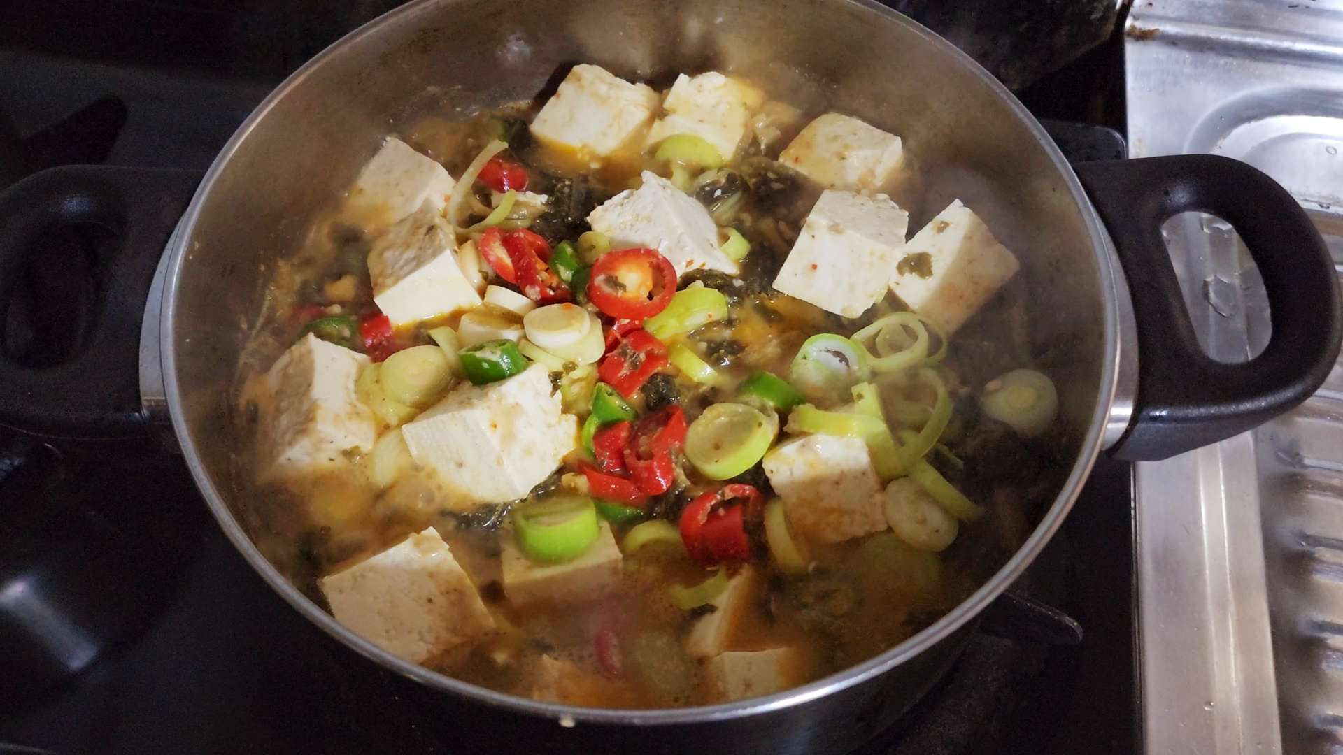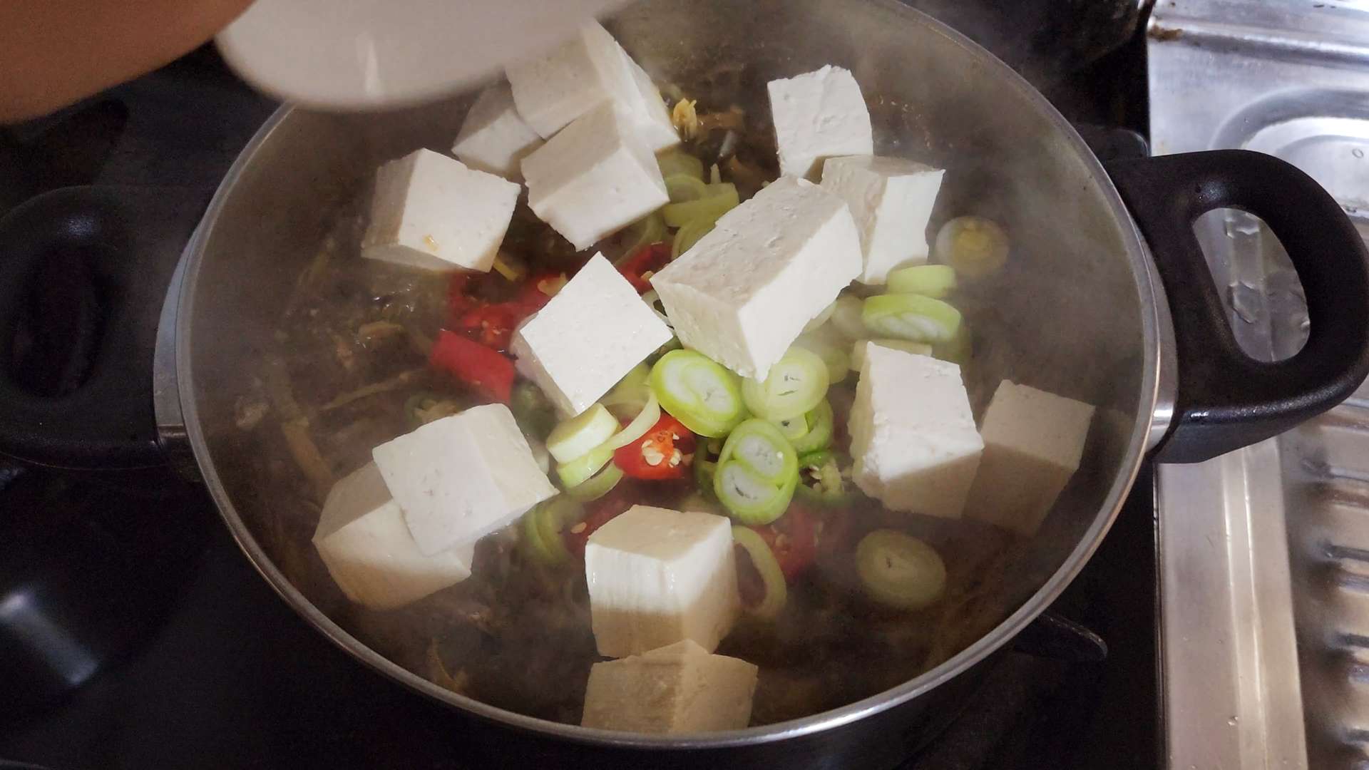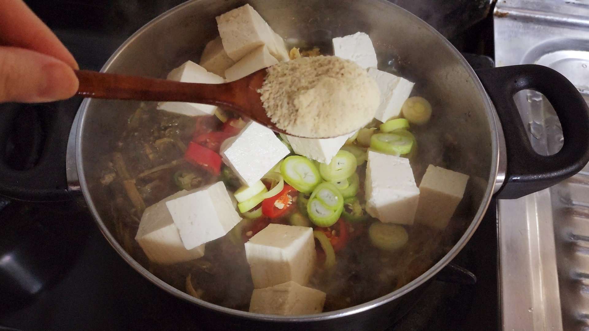 대파, 고추, 두부, 들깨가루 2T를 넣고 한소끔 끓여줍니다.
