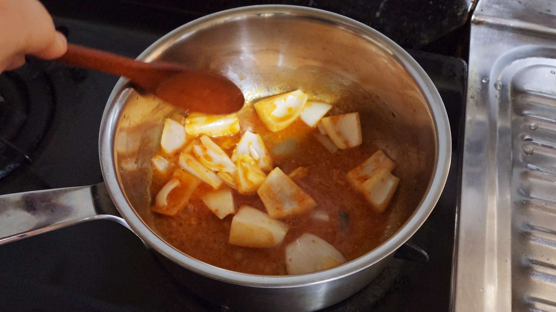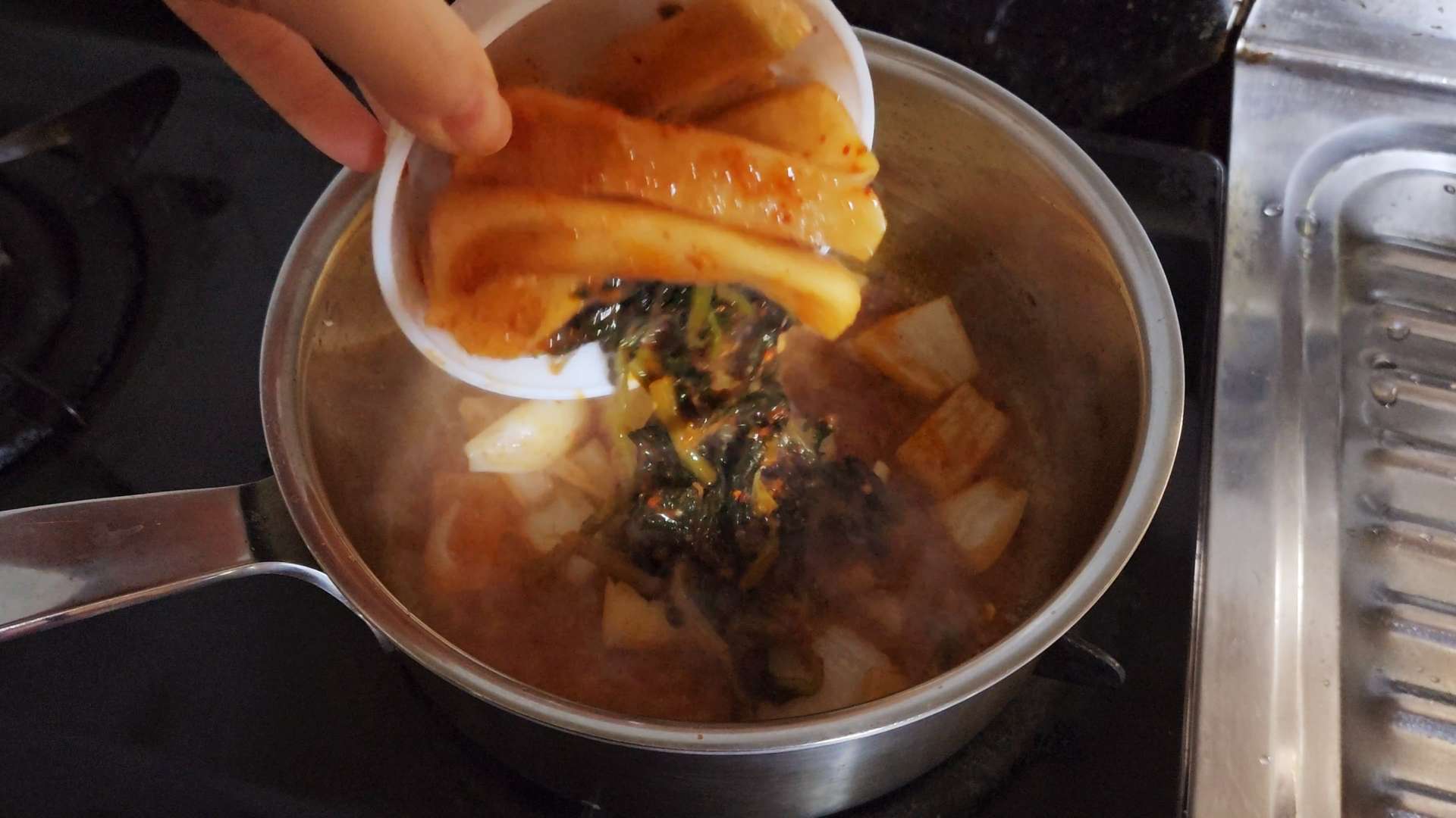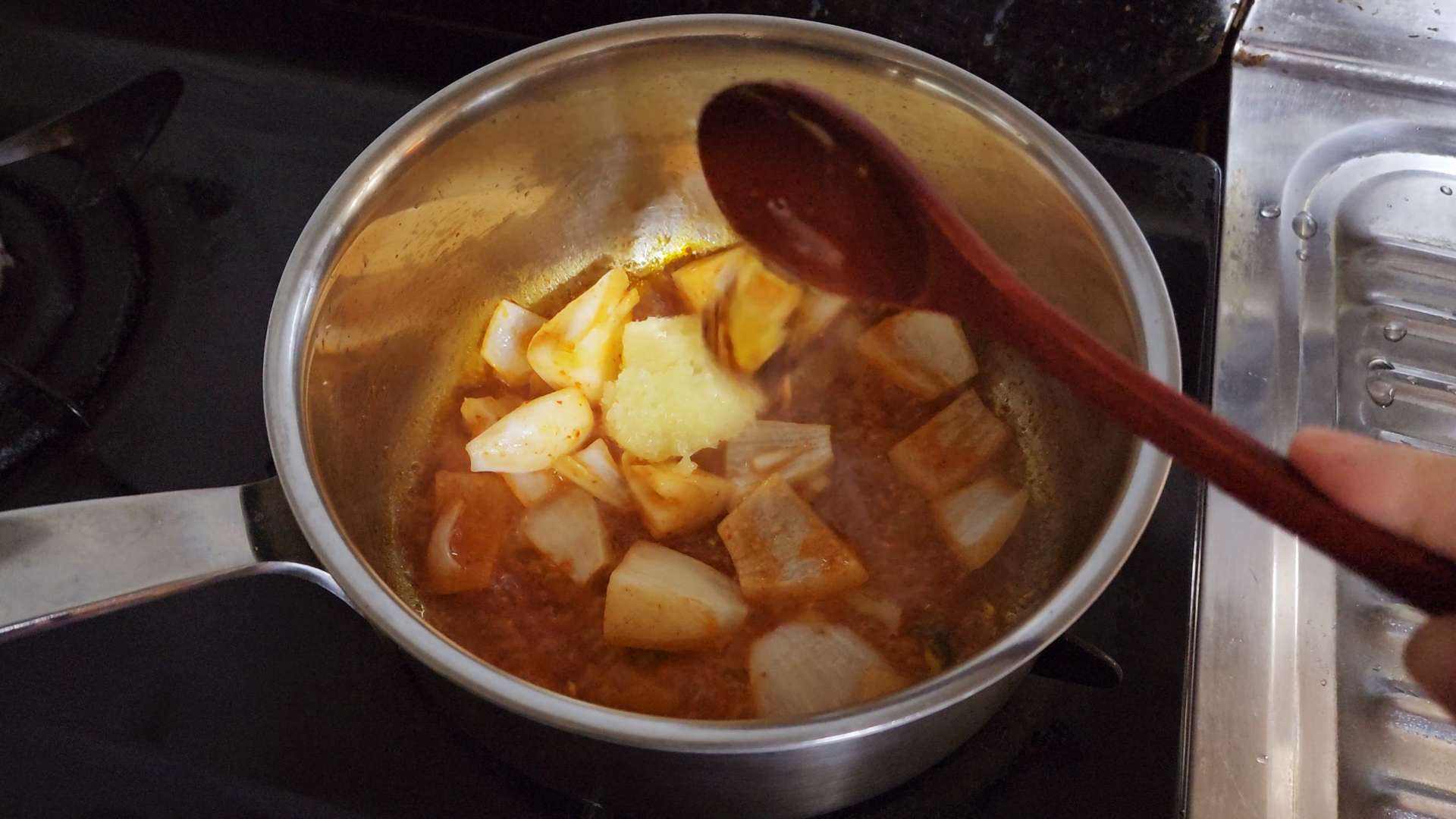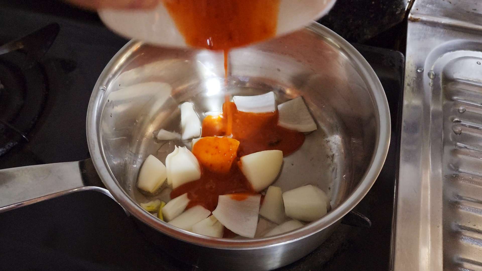 중불로 달군 냄비에 식용유, 양파, 김치국물 50ml 넣고 볶아줍니다.