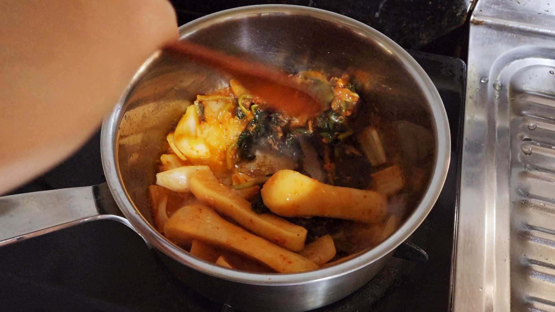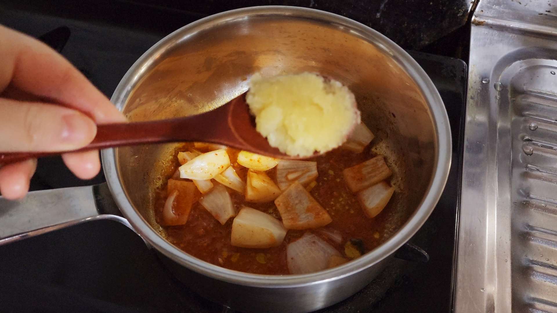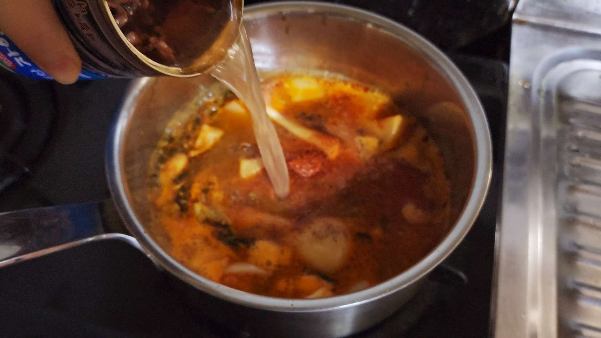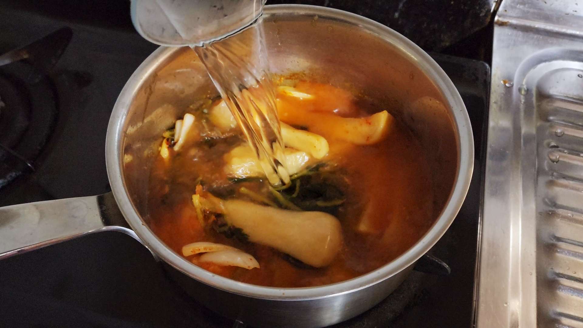 중불로 달군 냄비에 식용유, 양파, 김치국물 50ml 넣고 볶아줍니다.