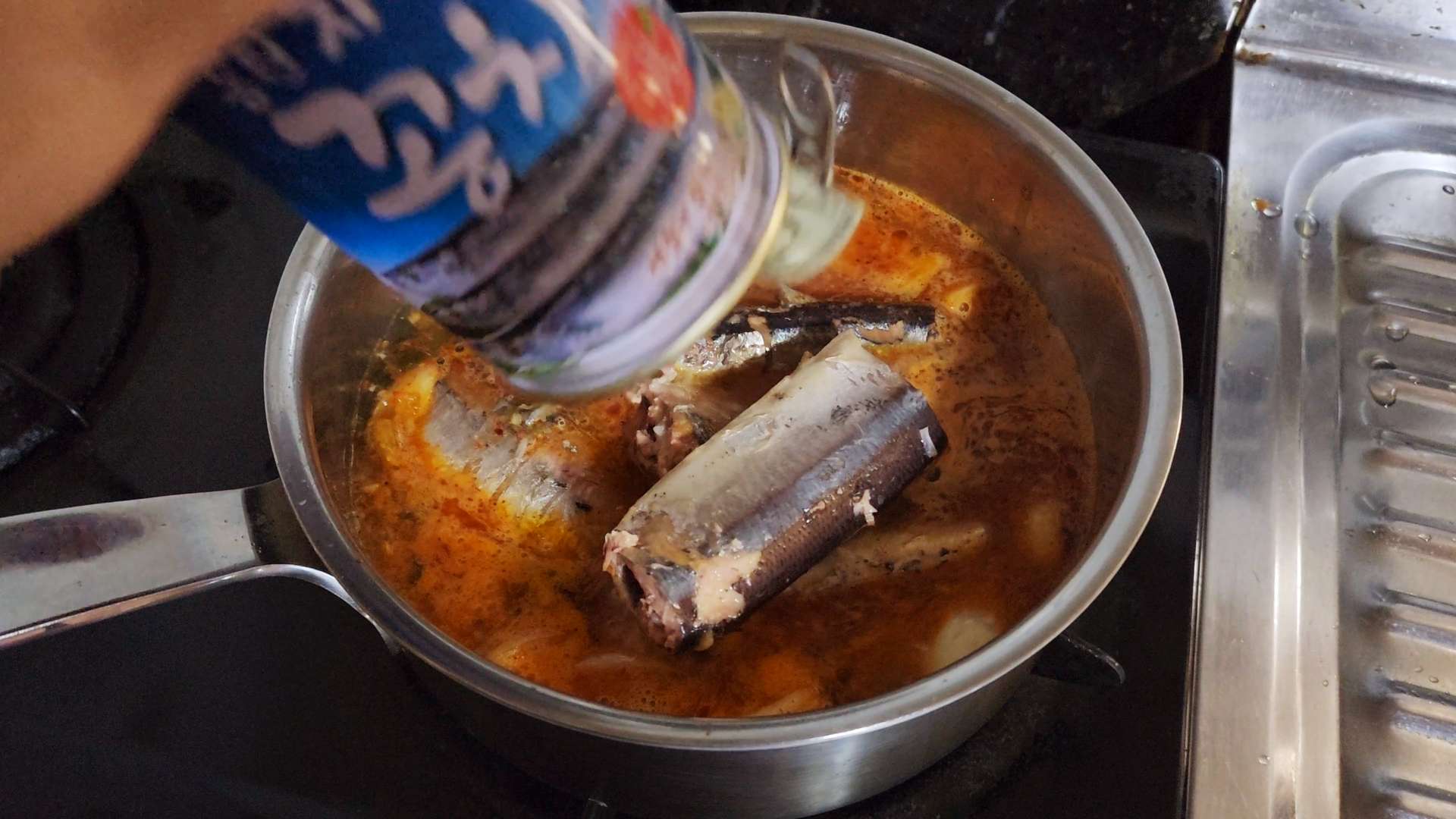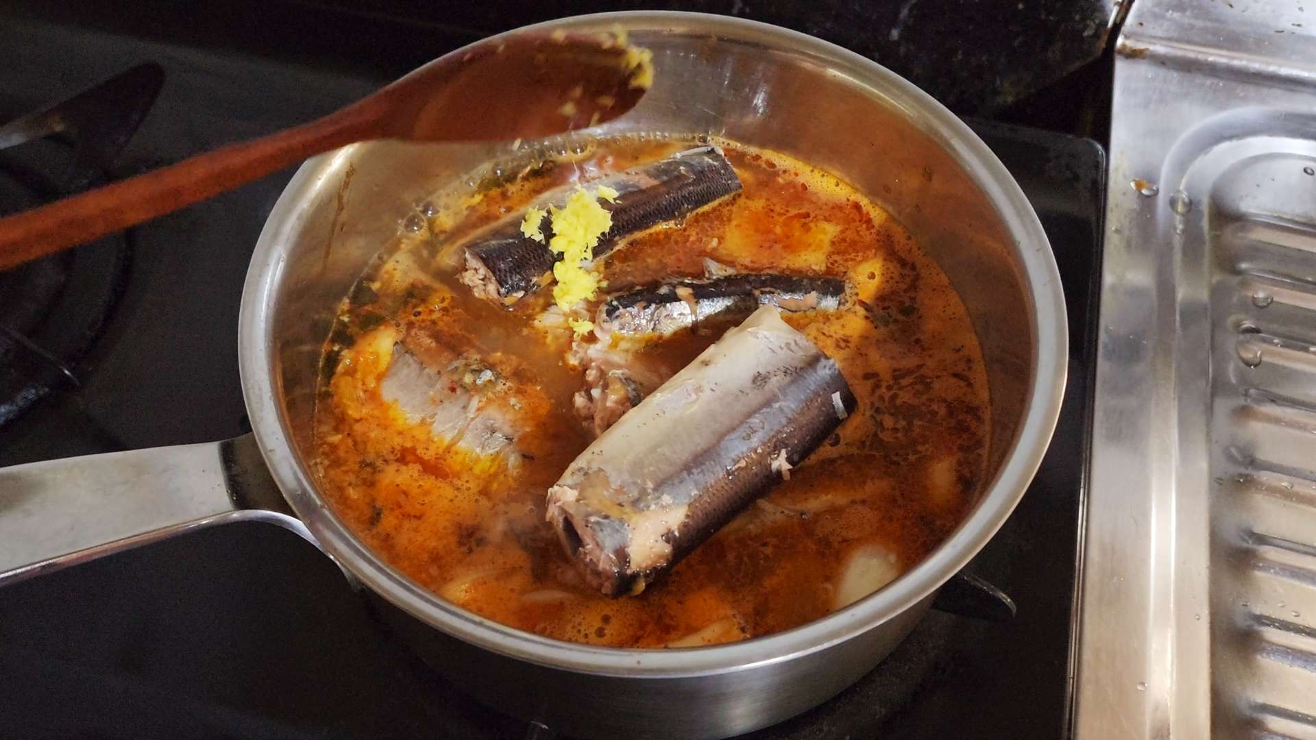 끓어오르면 꽁치통조림 1캔을 국물까지 넣고 다진생강 1t를 넣고 5분 끓여줍니다.