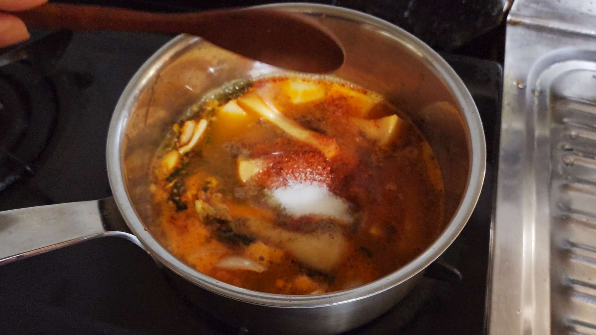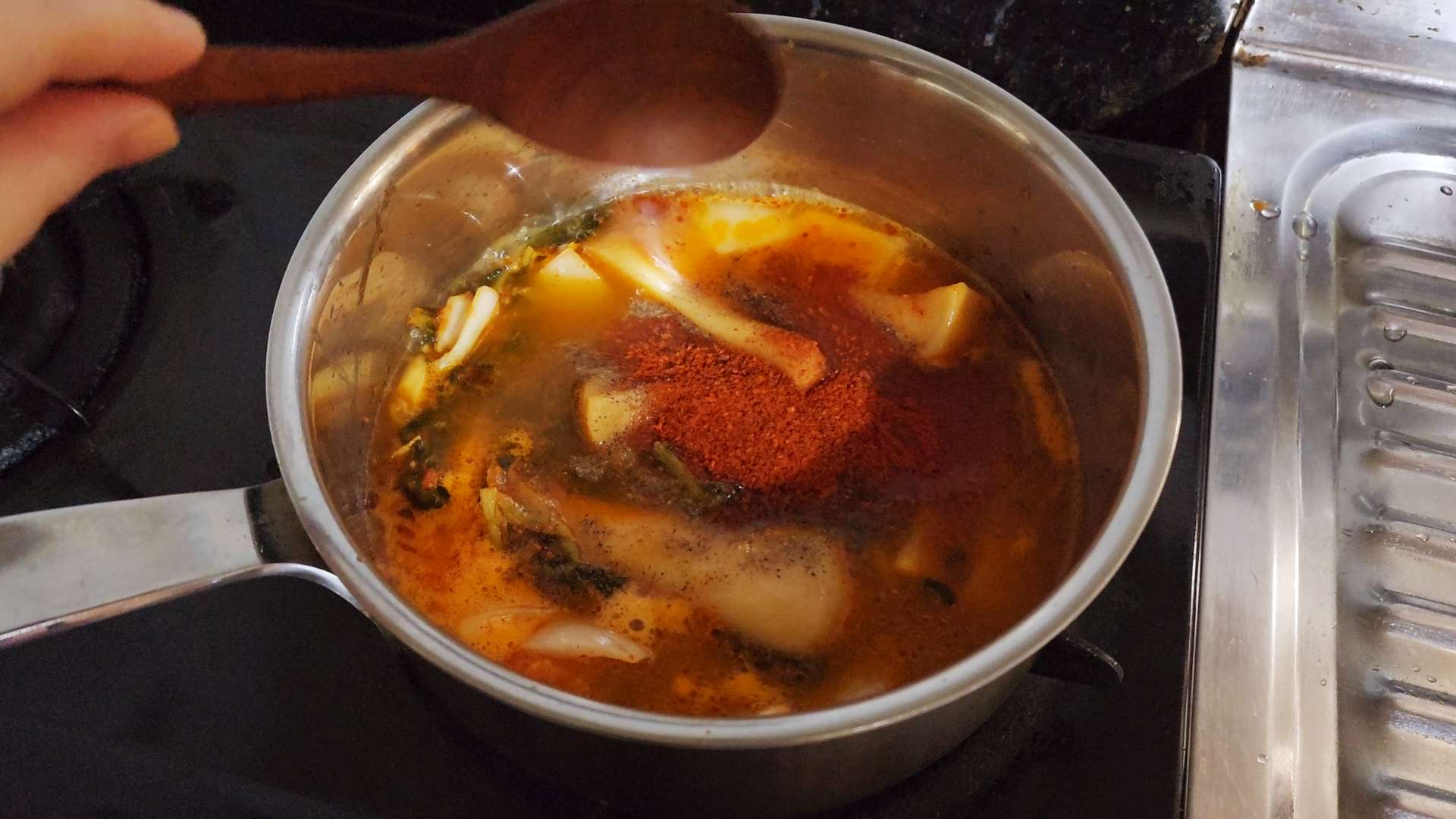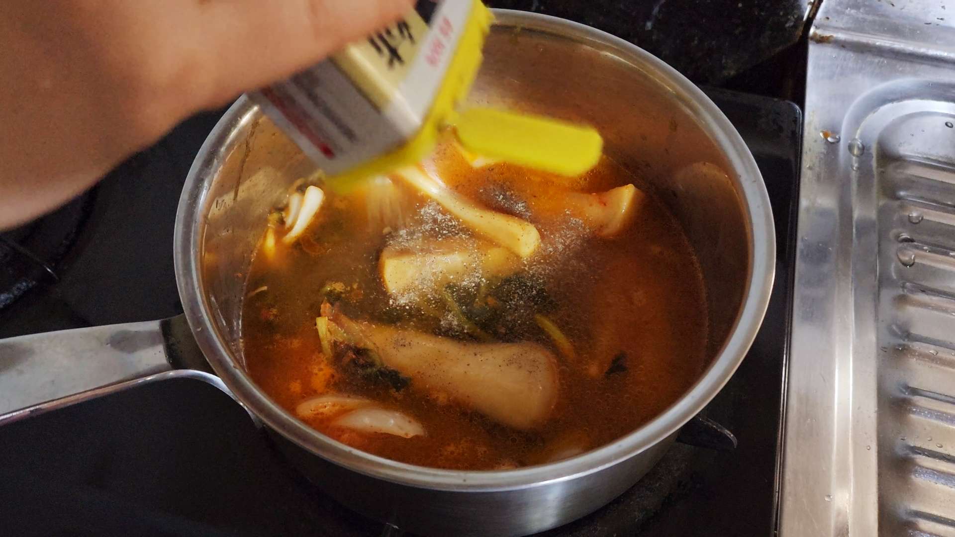물 300ml, 후추, 고춧가루 1T, 설탕 1/2T를 넣고 끓여줍니다.