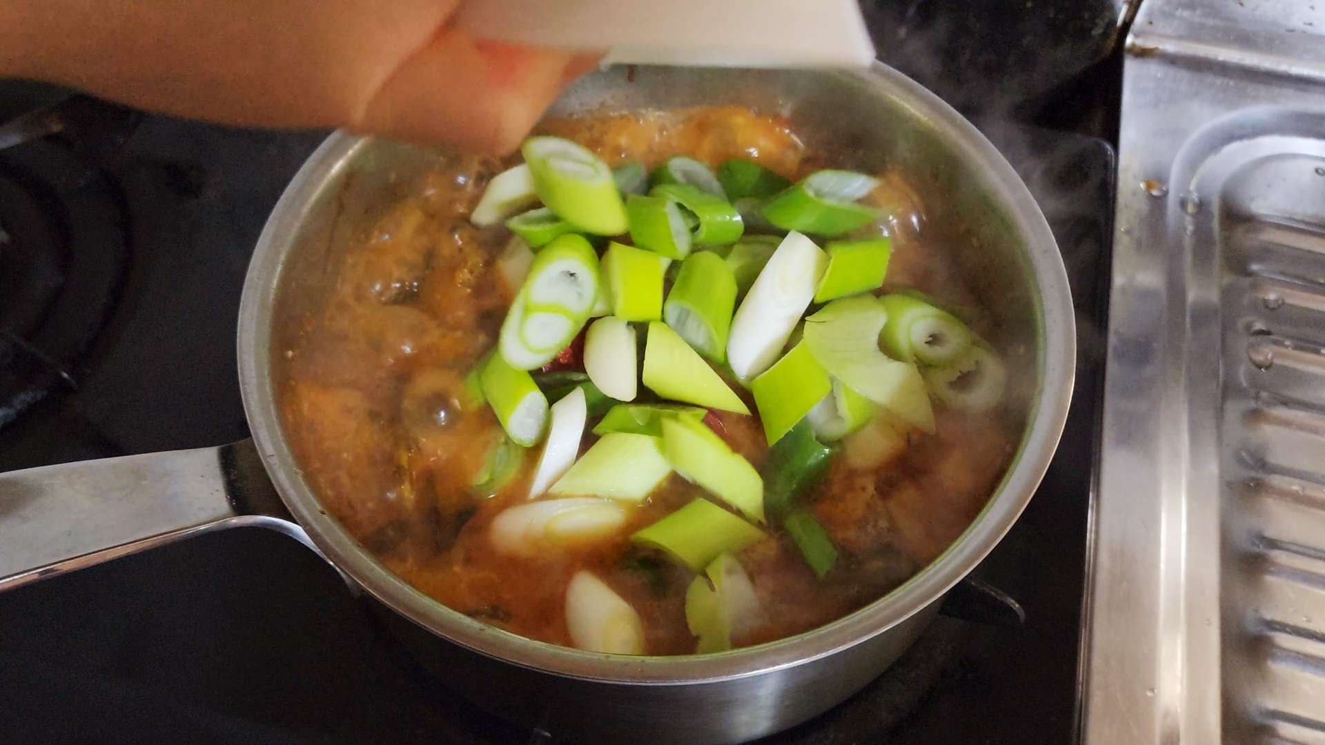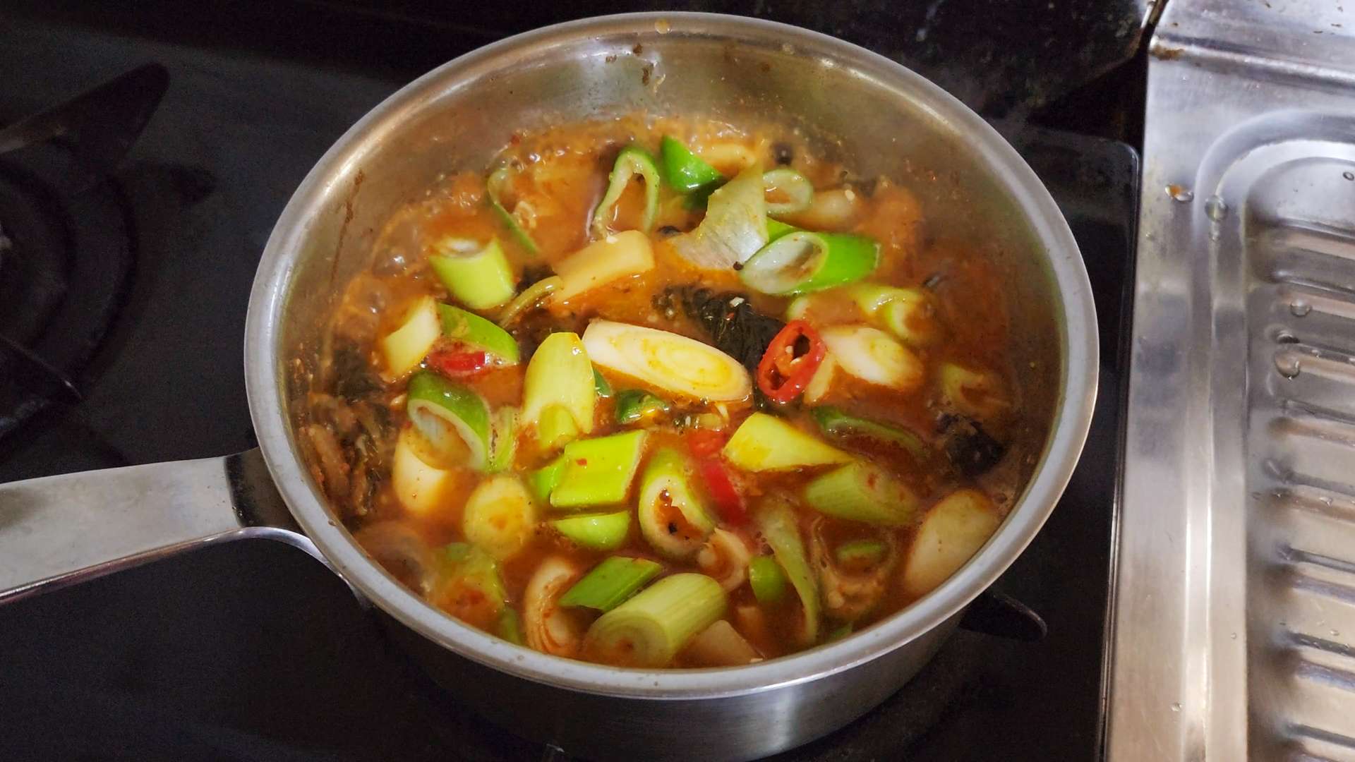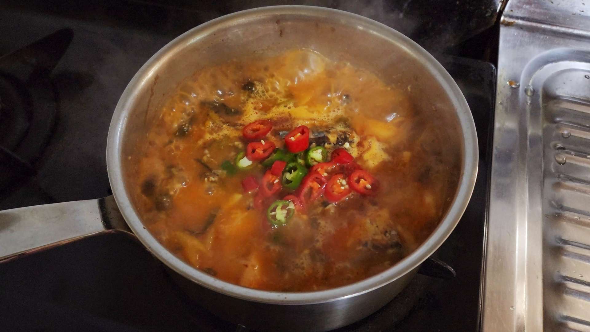 청양고추, 홍고추, 대파를 넣고 한소끔 끓여줍니다.