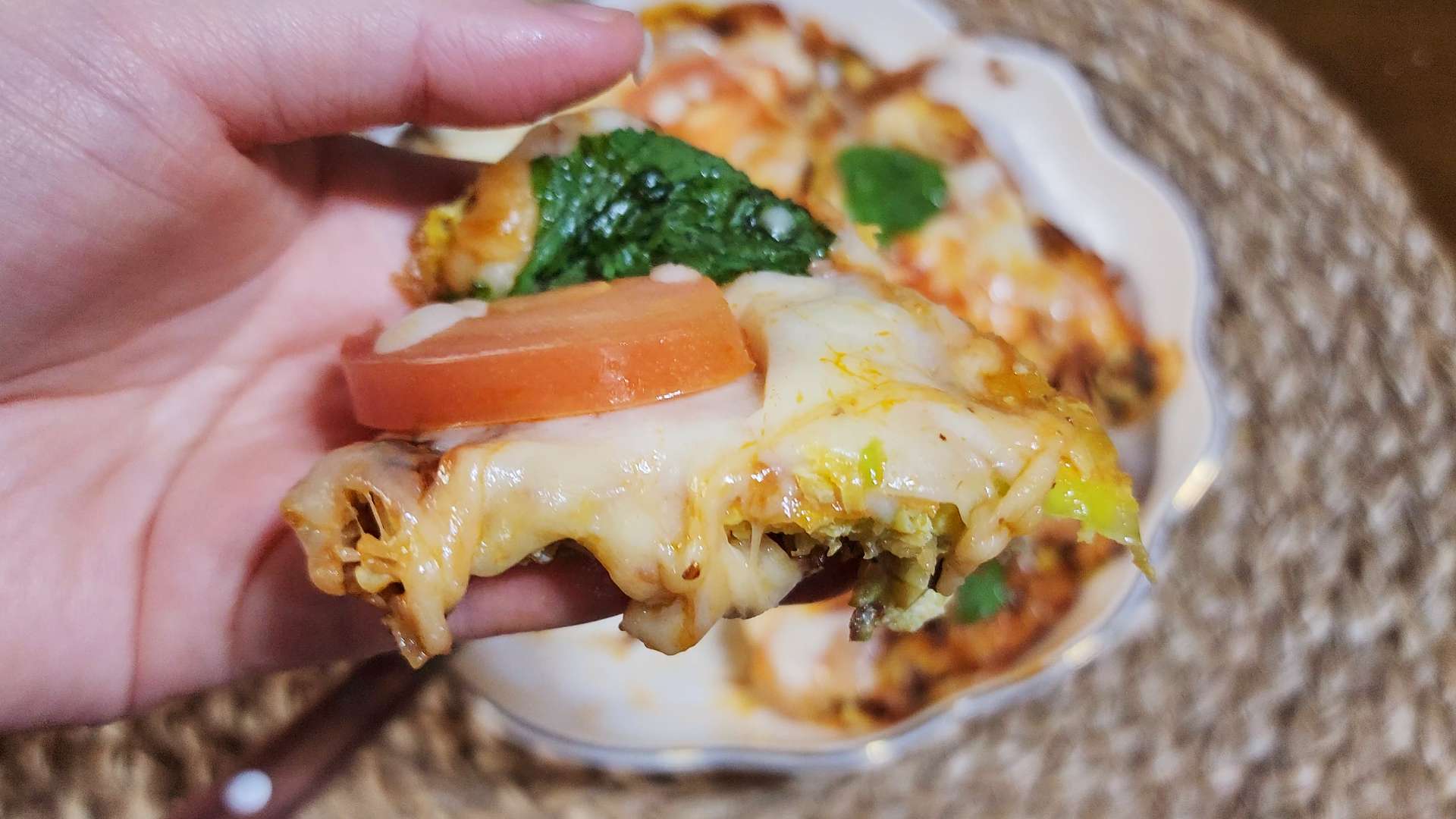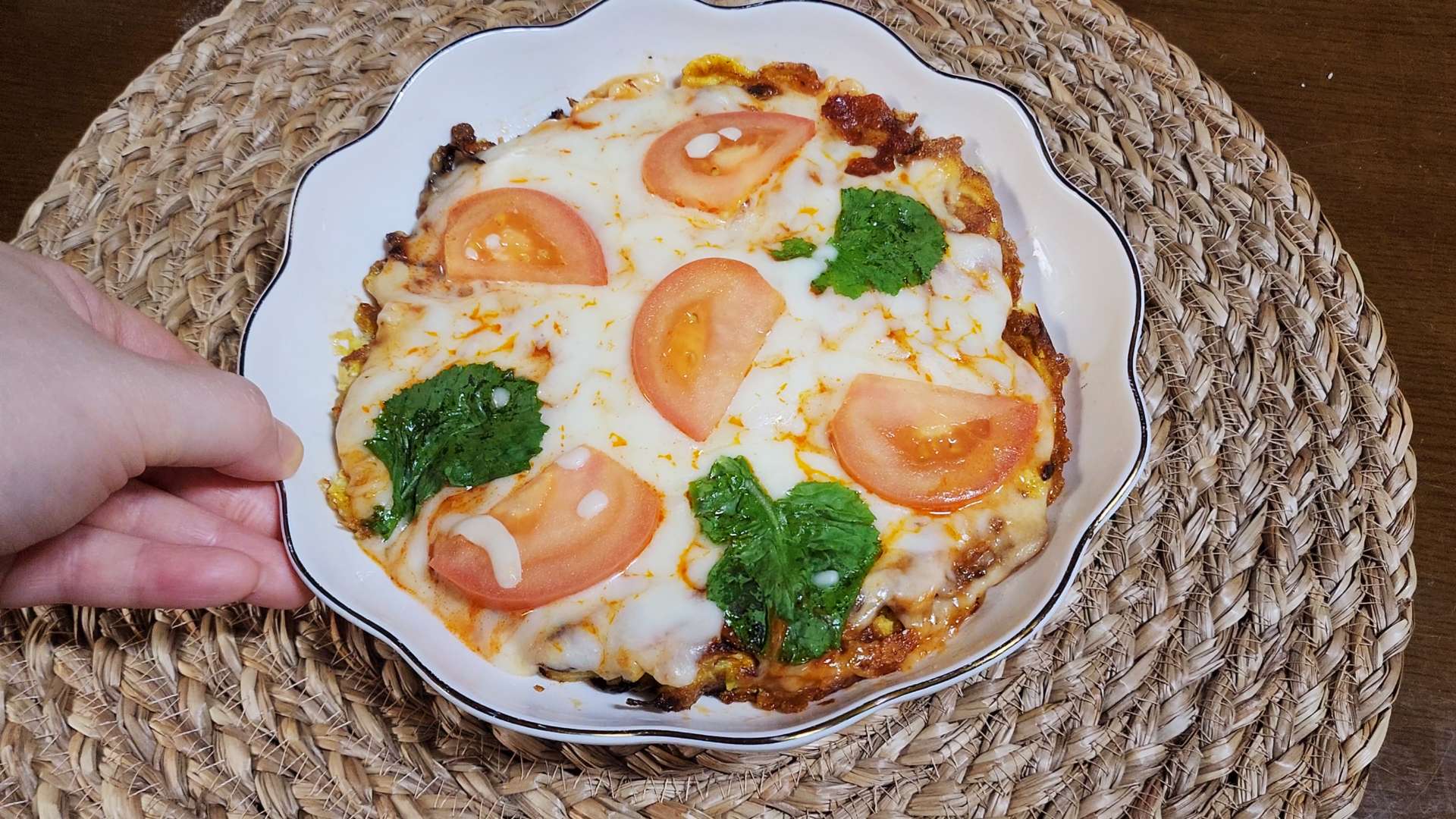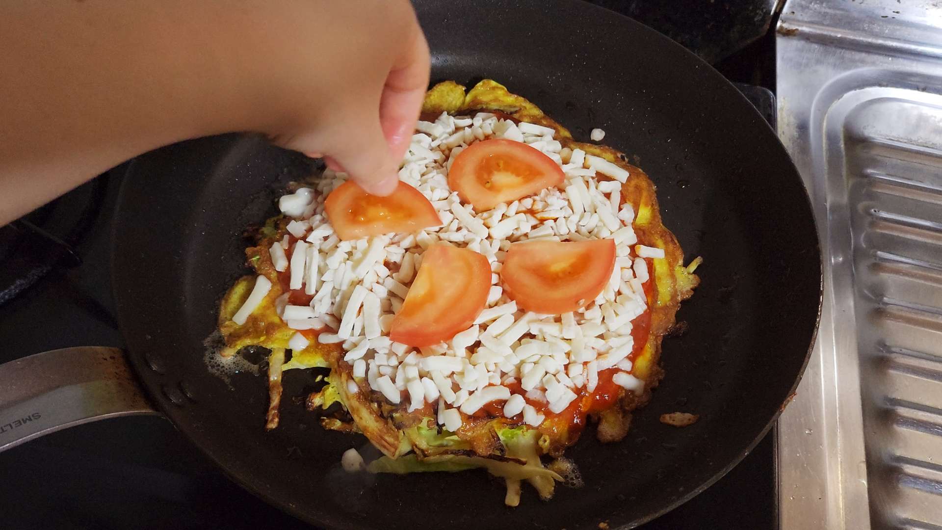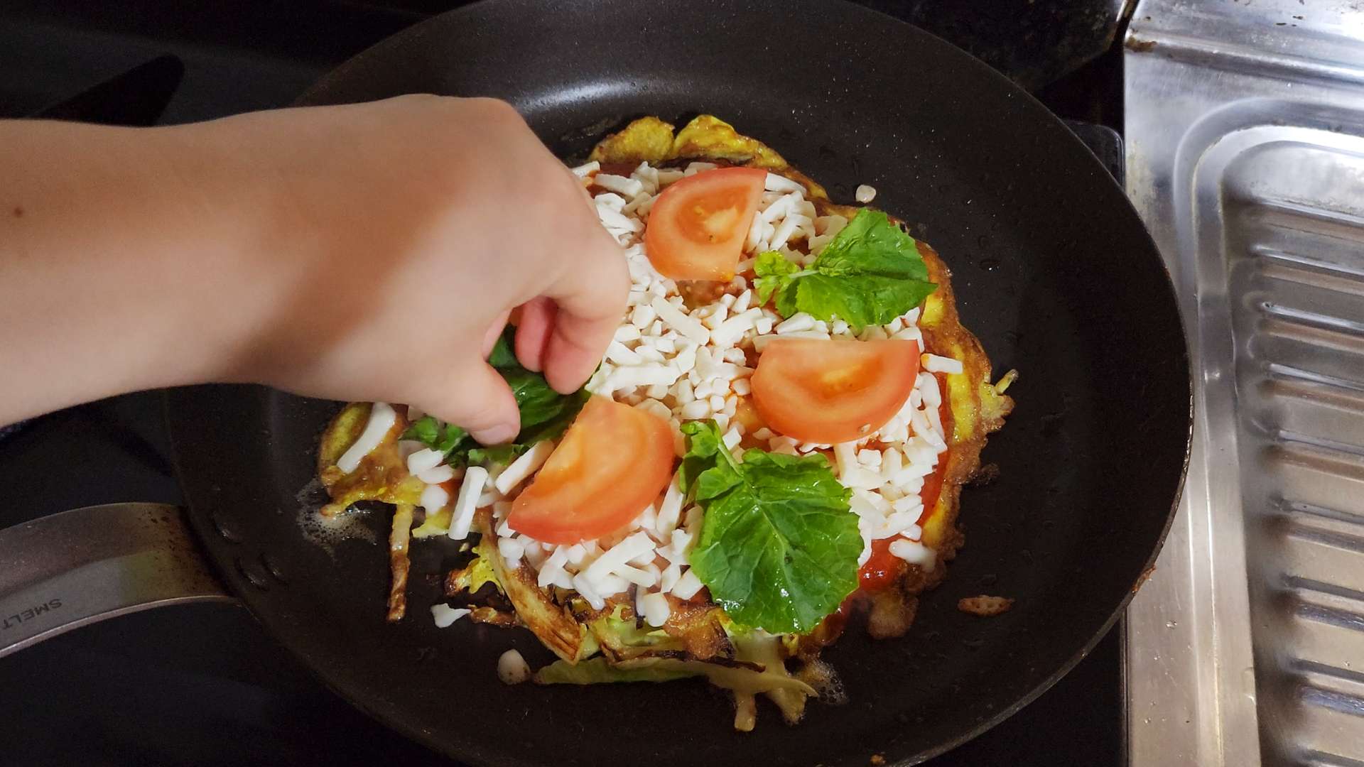 재료: 양배추 1/8개, 달걀 2개, 소금 약간, 올리브유, 라이스 페이퍼 1장, 토마토소스 1T, 모차렐라 치즈, 토마토, 유채 잎